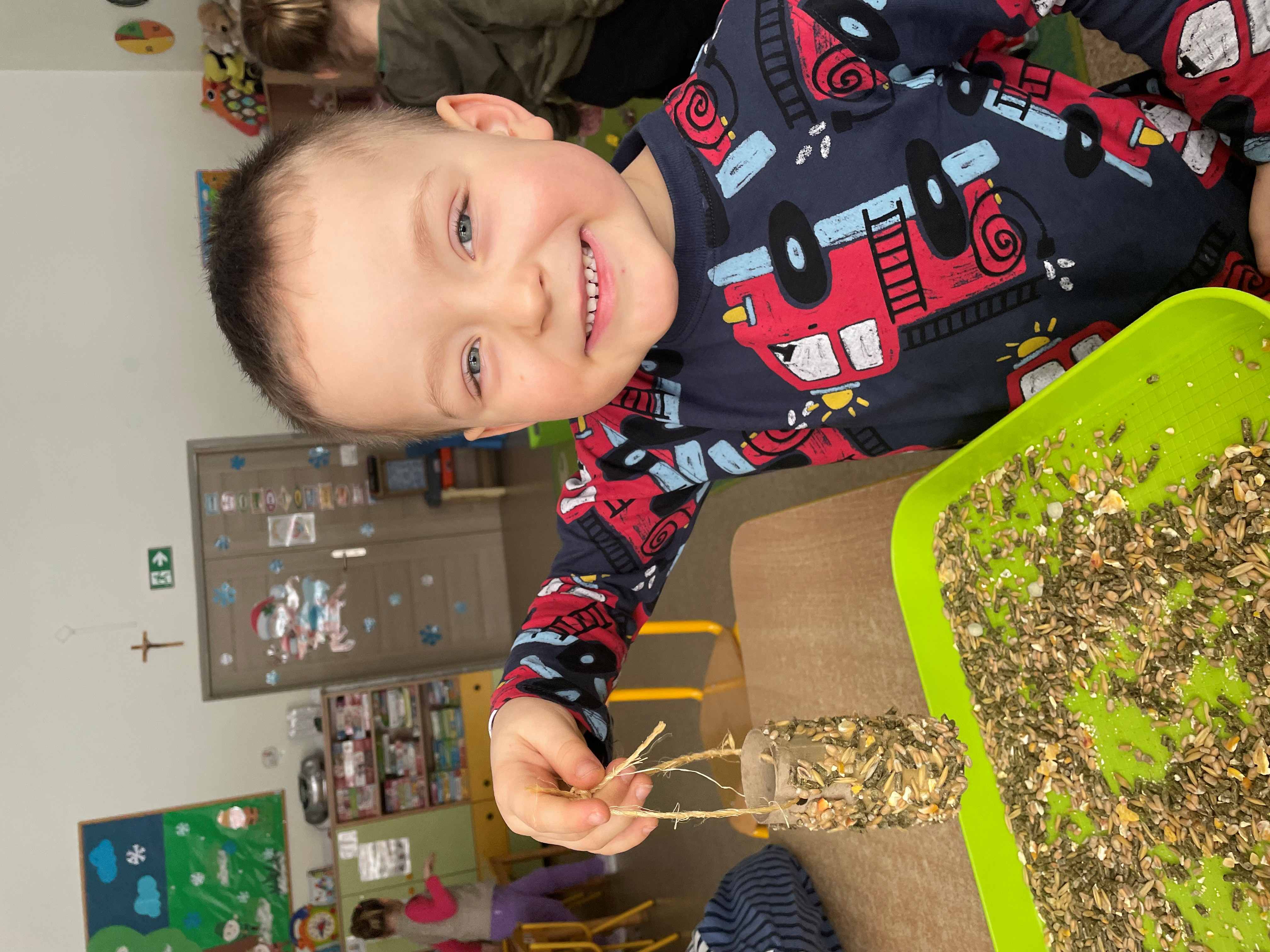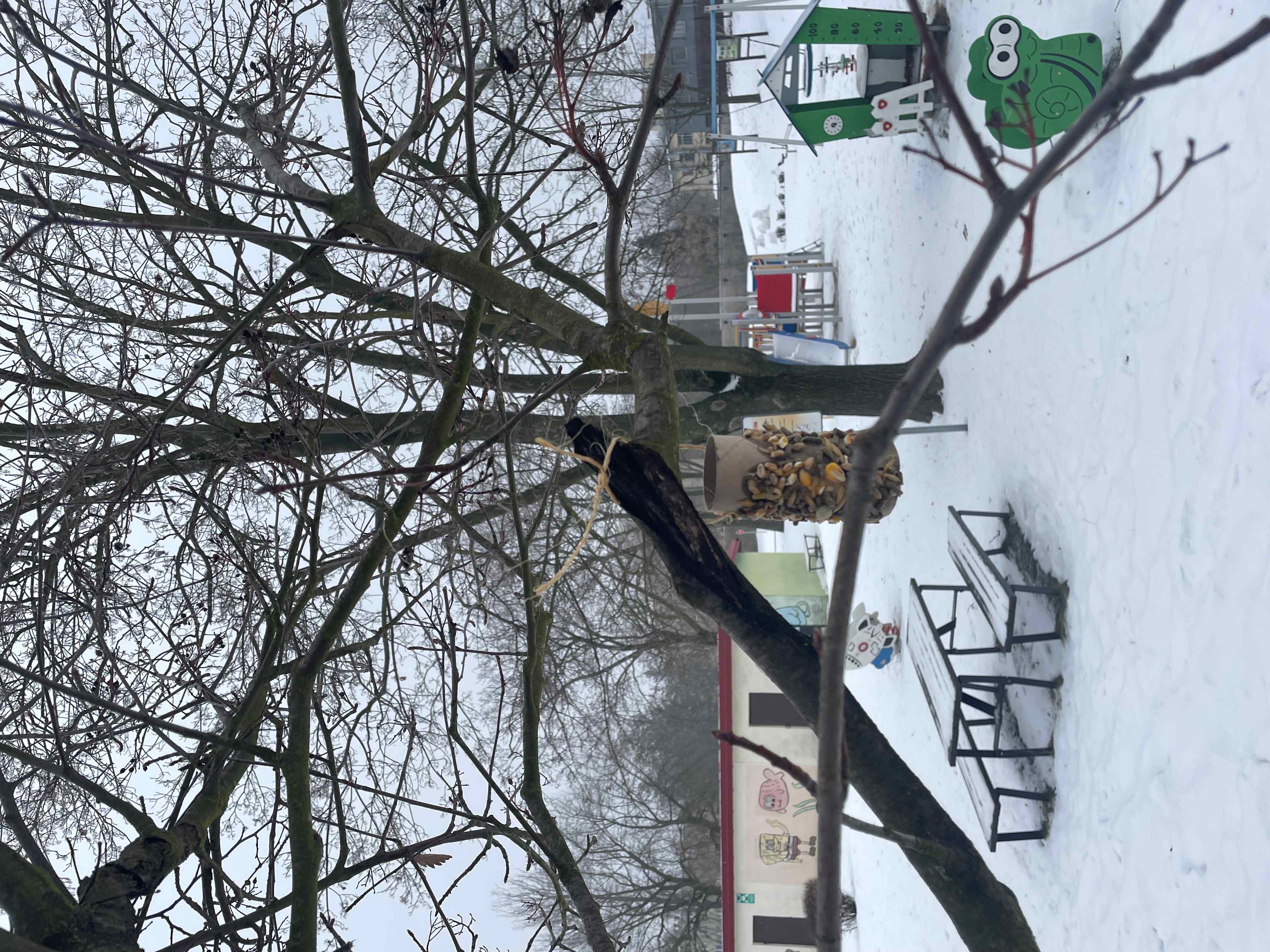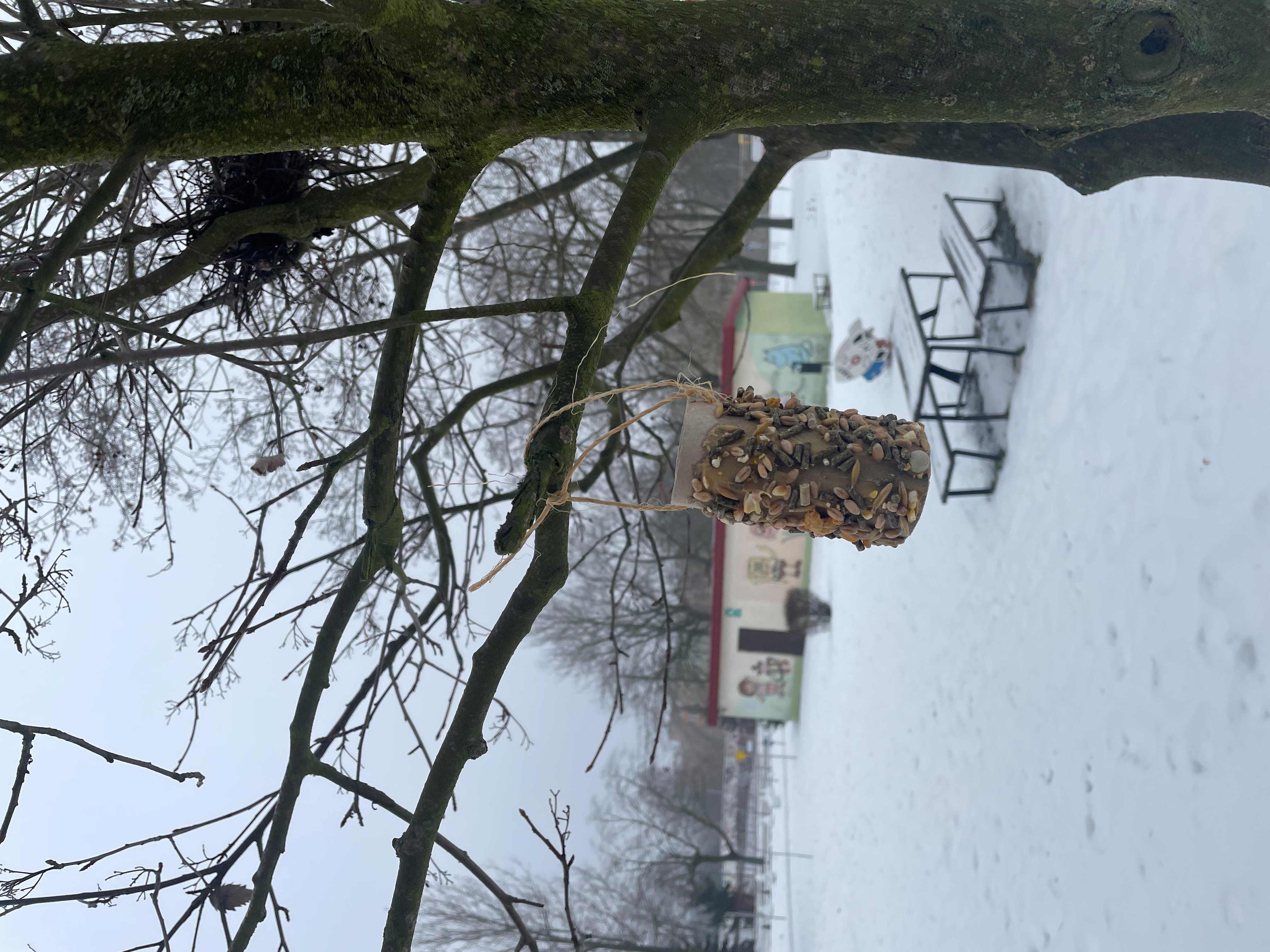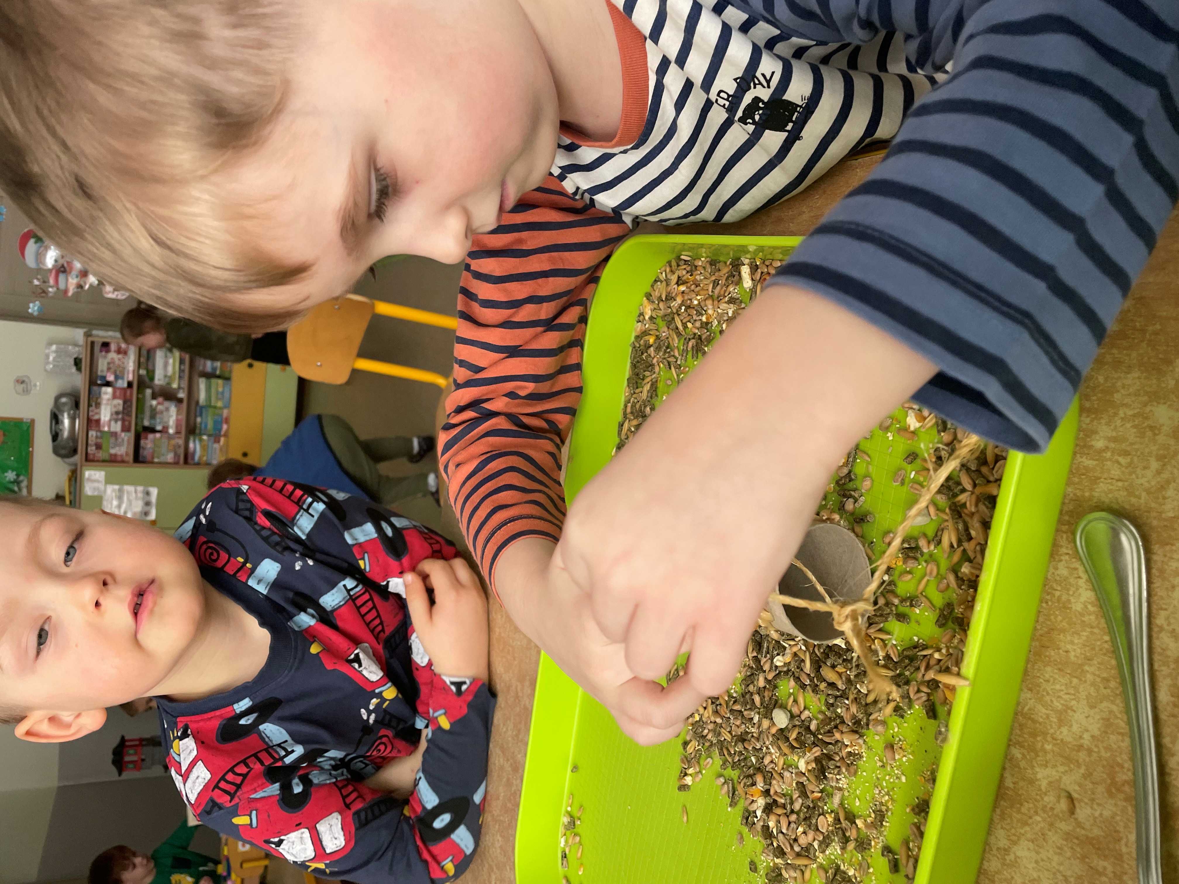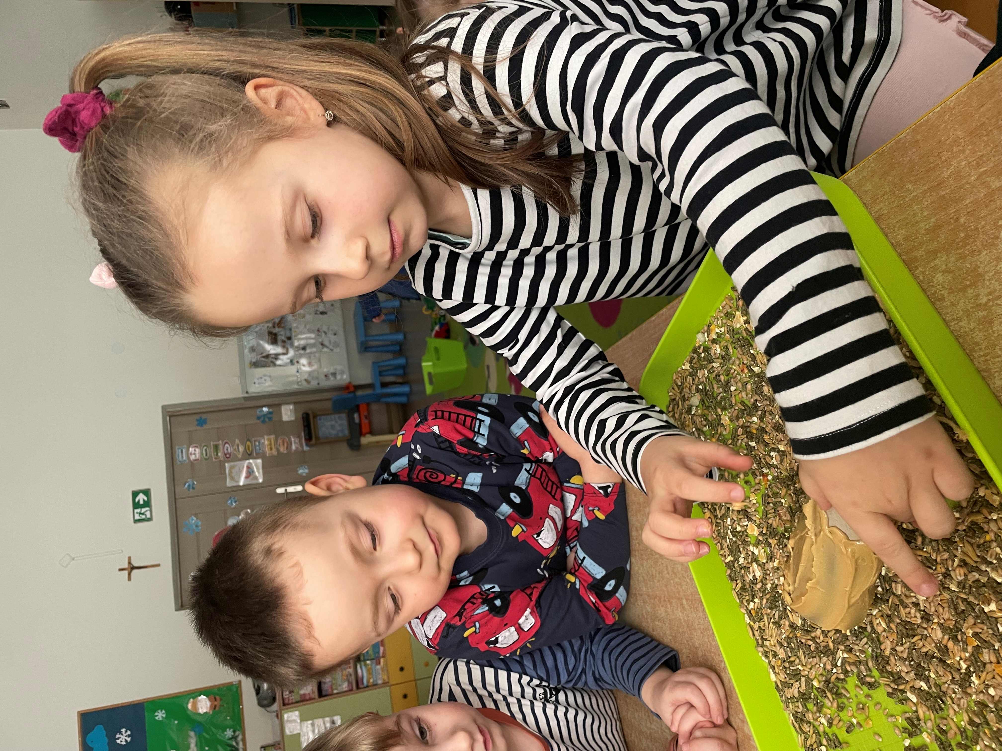 Najwięcej radości sprawiło dzieciom samodzielne przygotowanie prawdziwych karmników z rolek po papierze toaletowym, masła orzechowego oraz ziaren dla ptaków. Gotowe karmniki zostały zawieszone w naszym ogrodzie przedszkolnym, gdzie będą pomagać ptakom przetrwać zimę.