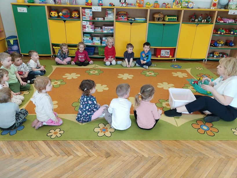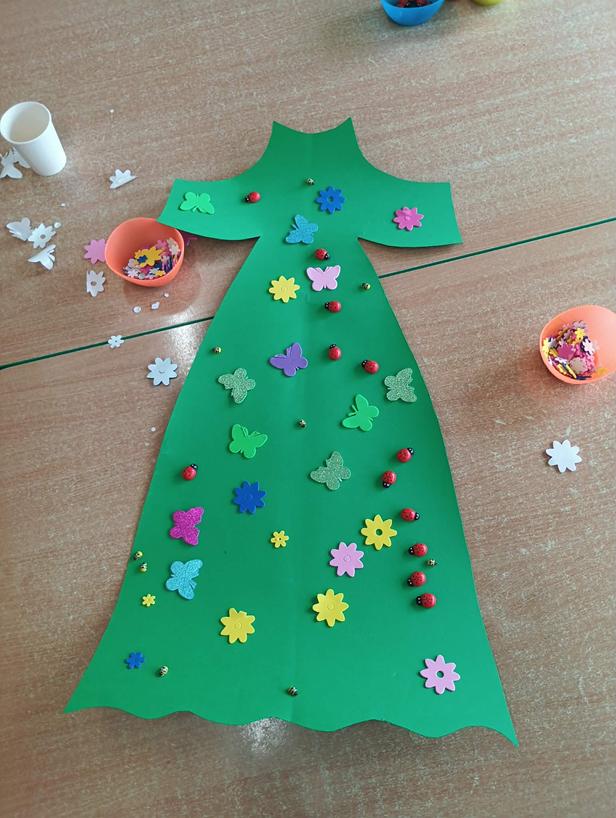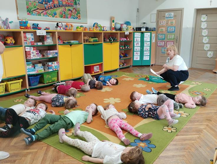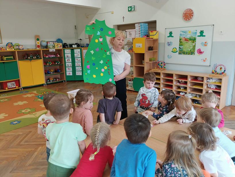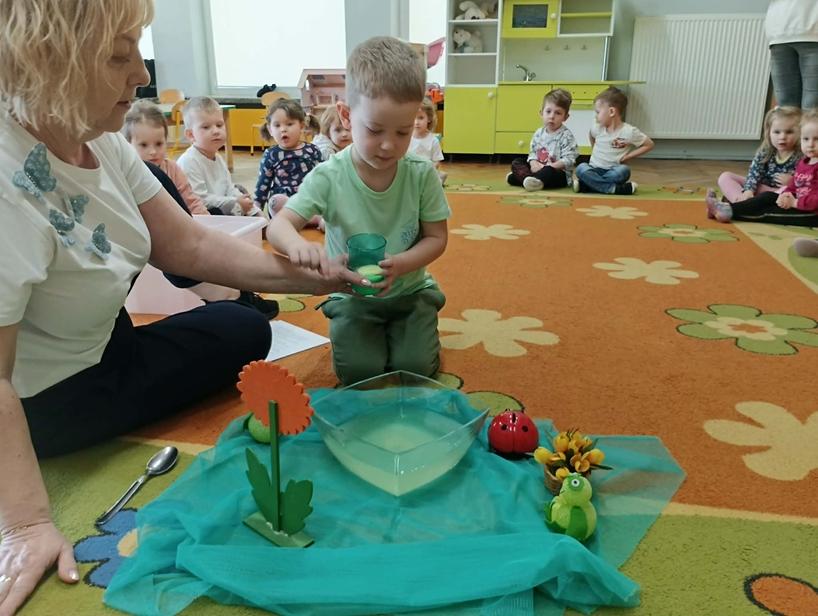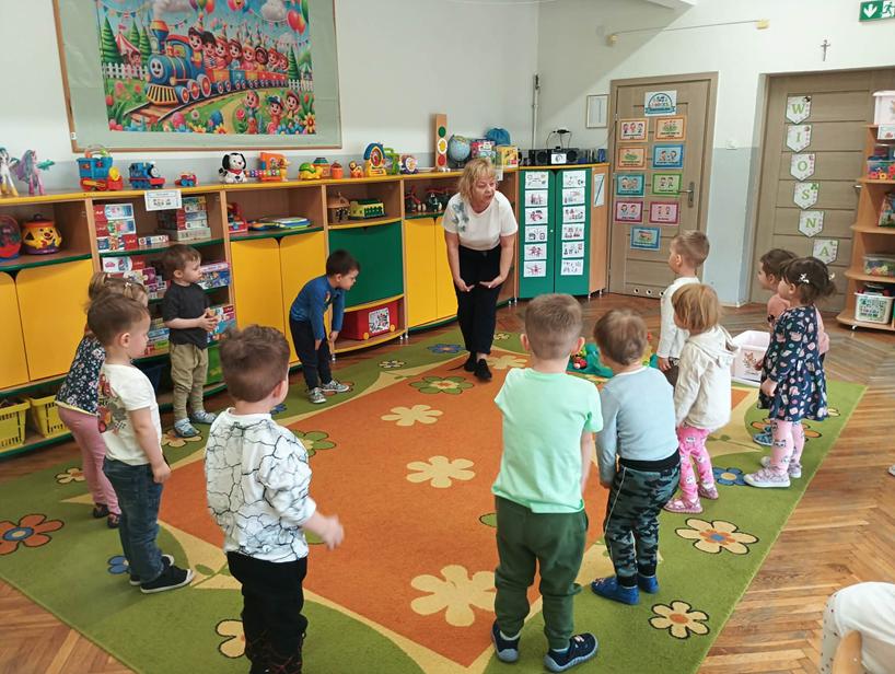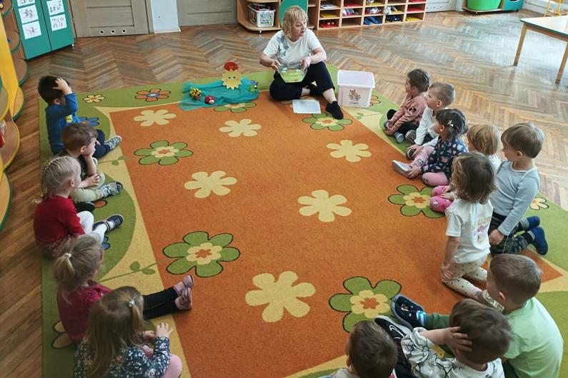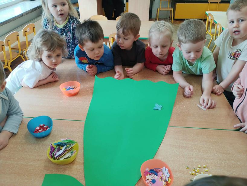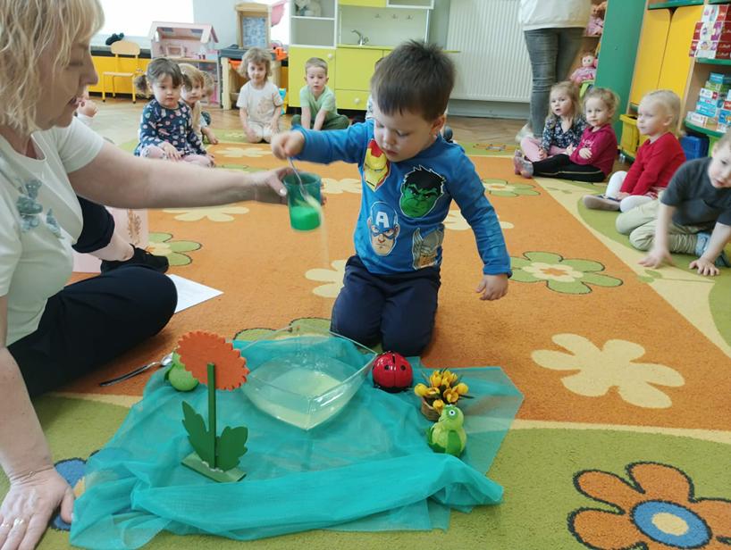 25 października przedszkolaki z grupy Poszukiwacze wzięły udział w zajęciach „Czarujemy wiosenną łąkę”. Dzieci poznały nazwę nowej pory roku – wiosna. Wsłuchując się w muzykę relaksacyjną przeniosły się do zaczarowanej łąki, na której rozkwitały wiosenne kwiaty i pojawiały się wiosenne owady. Na zakończenie zajęć przedszkolaki ozdabiały kolorową sukienkę pani Wiosny.