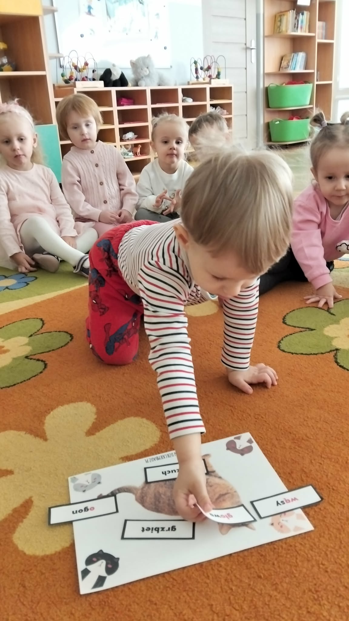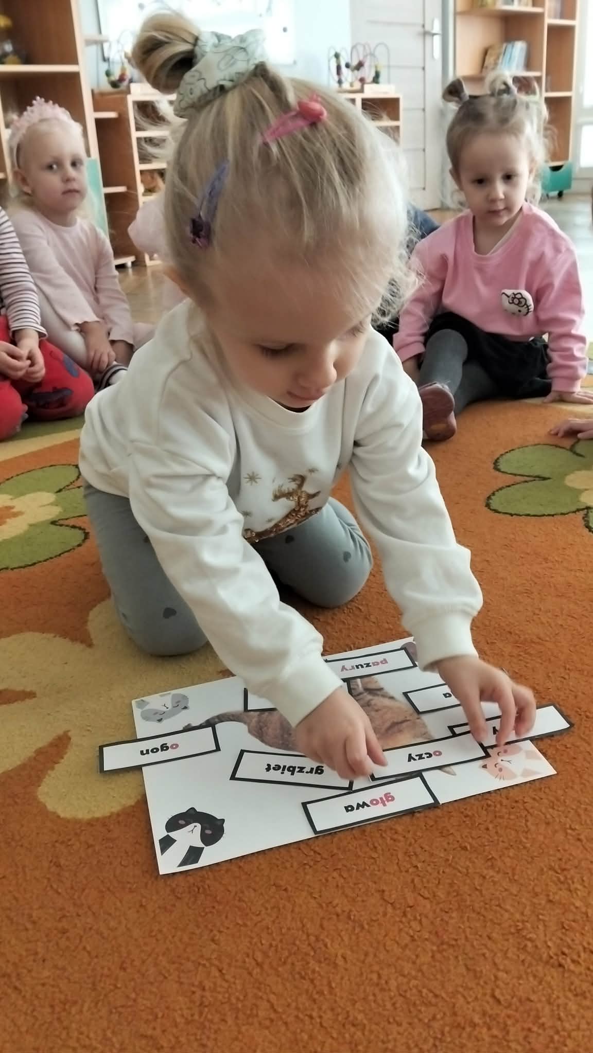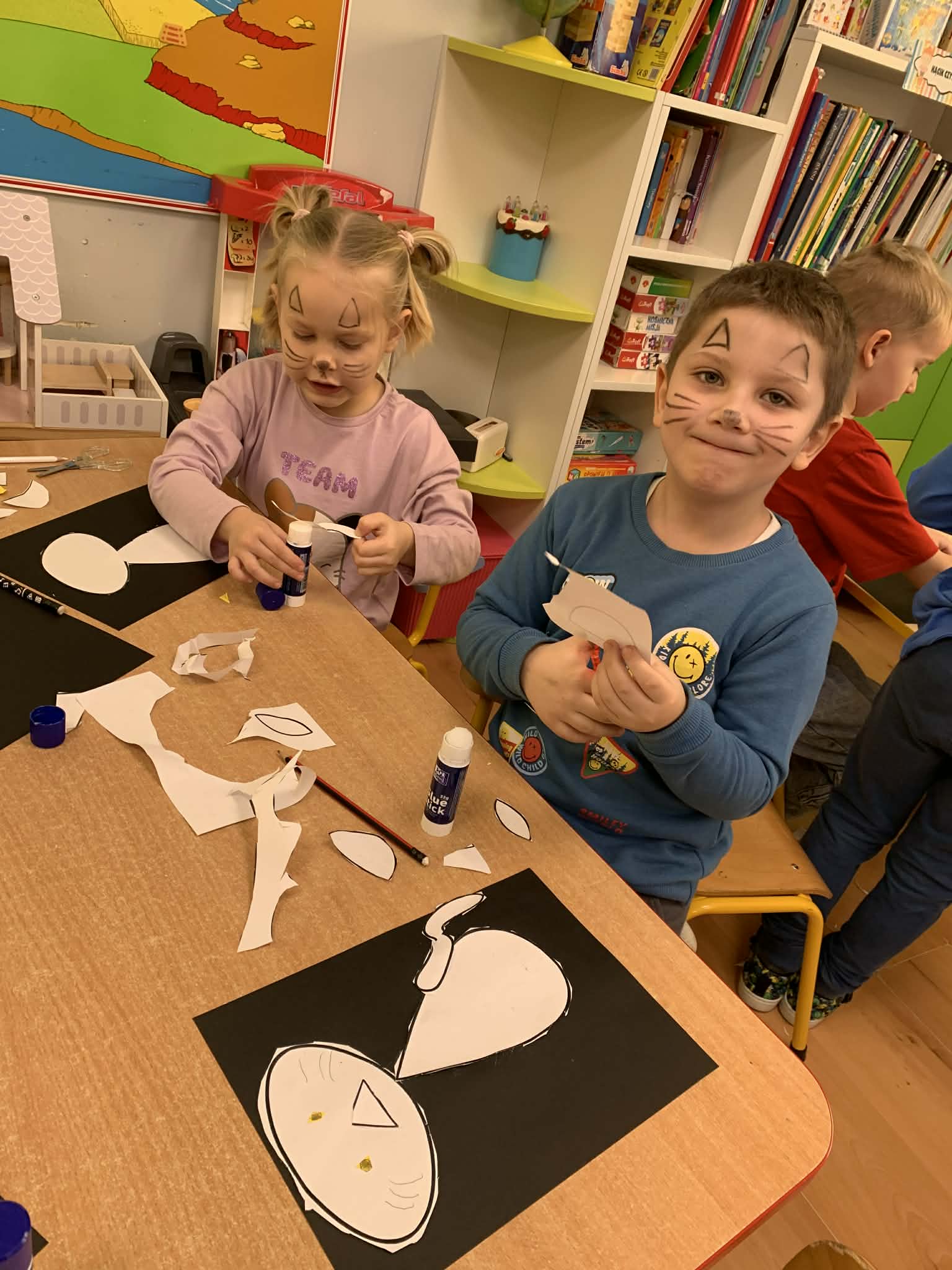 Nie zabrakło również prac plastycznych, zabaw ruchowych oraz wspólnego czytania bajek o kotkach. Dzieci z radością naśladowały kocie ruchy i wcielały się w role małych mruczków.