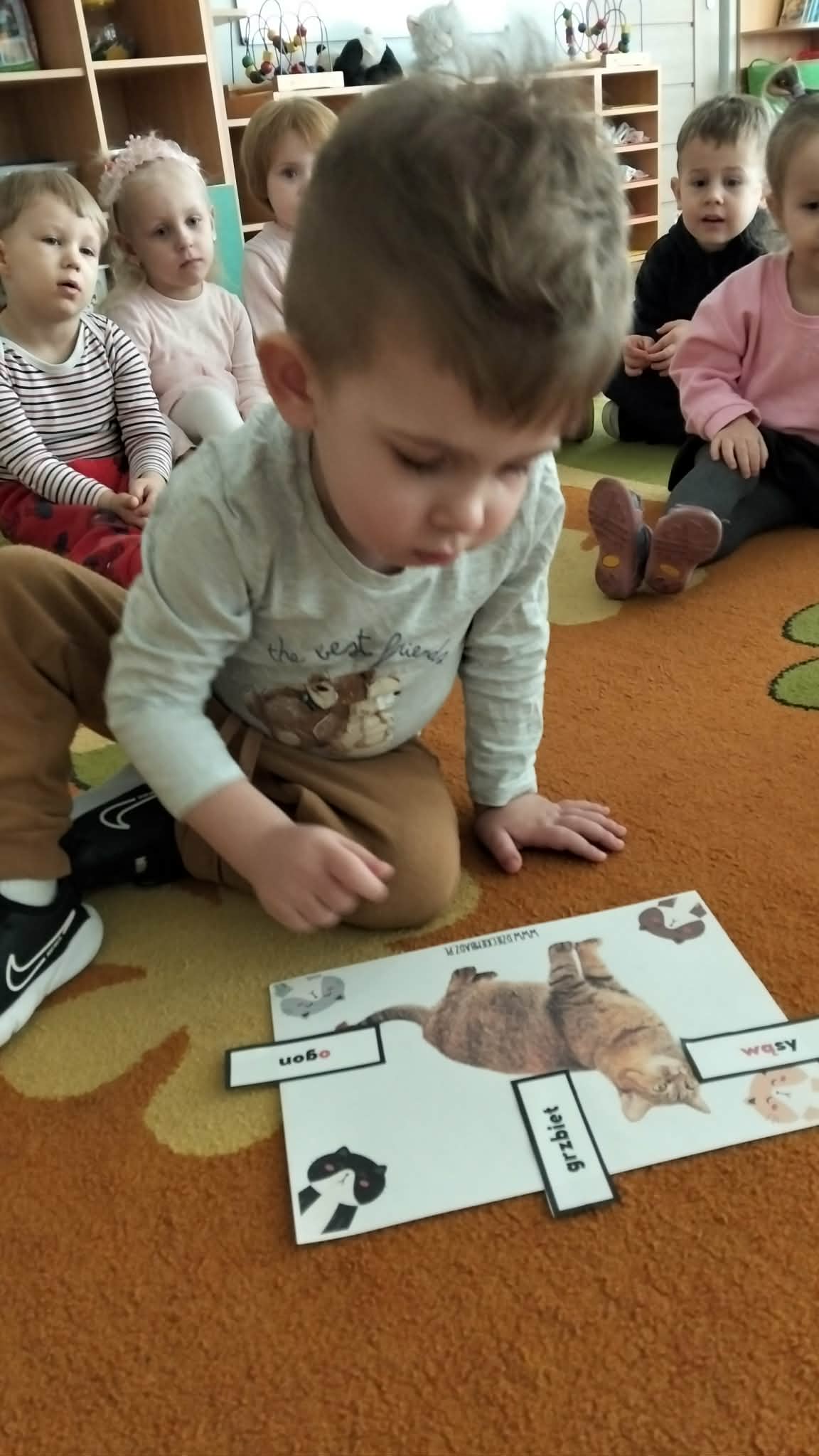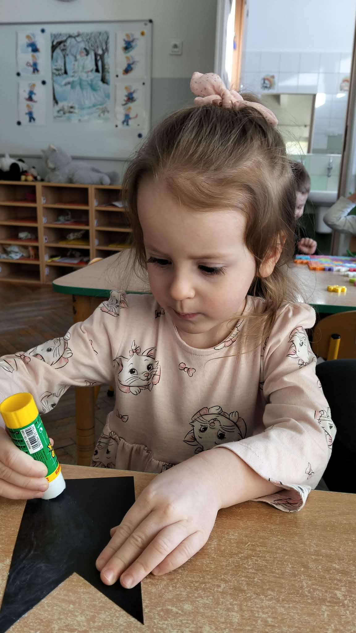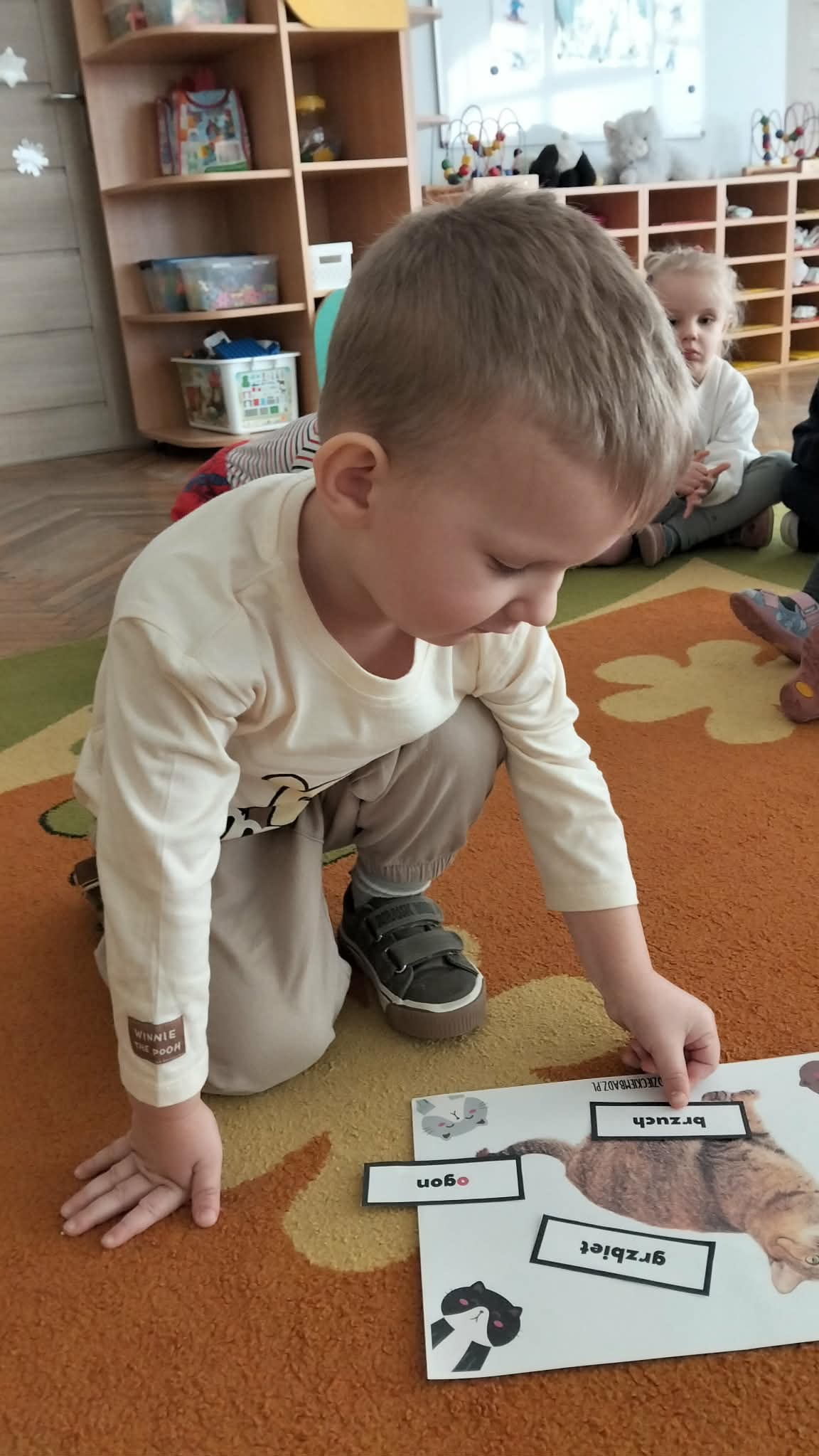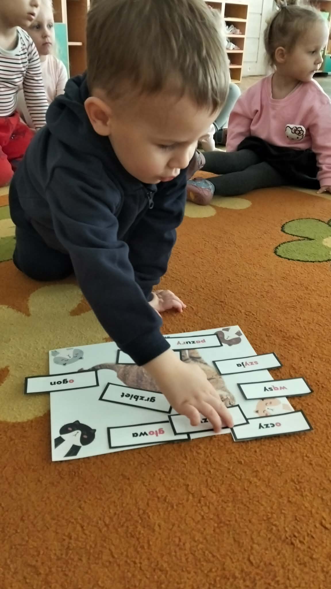 Nie zabrakło również prac plastycznych, zabaw ruchowych oraz wspólnego czytania bajek o kotkach. Dzieci z radością naśladowały kocie ruchy i wcielały się w role małych mruczków.
