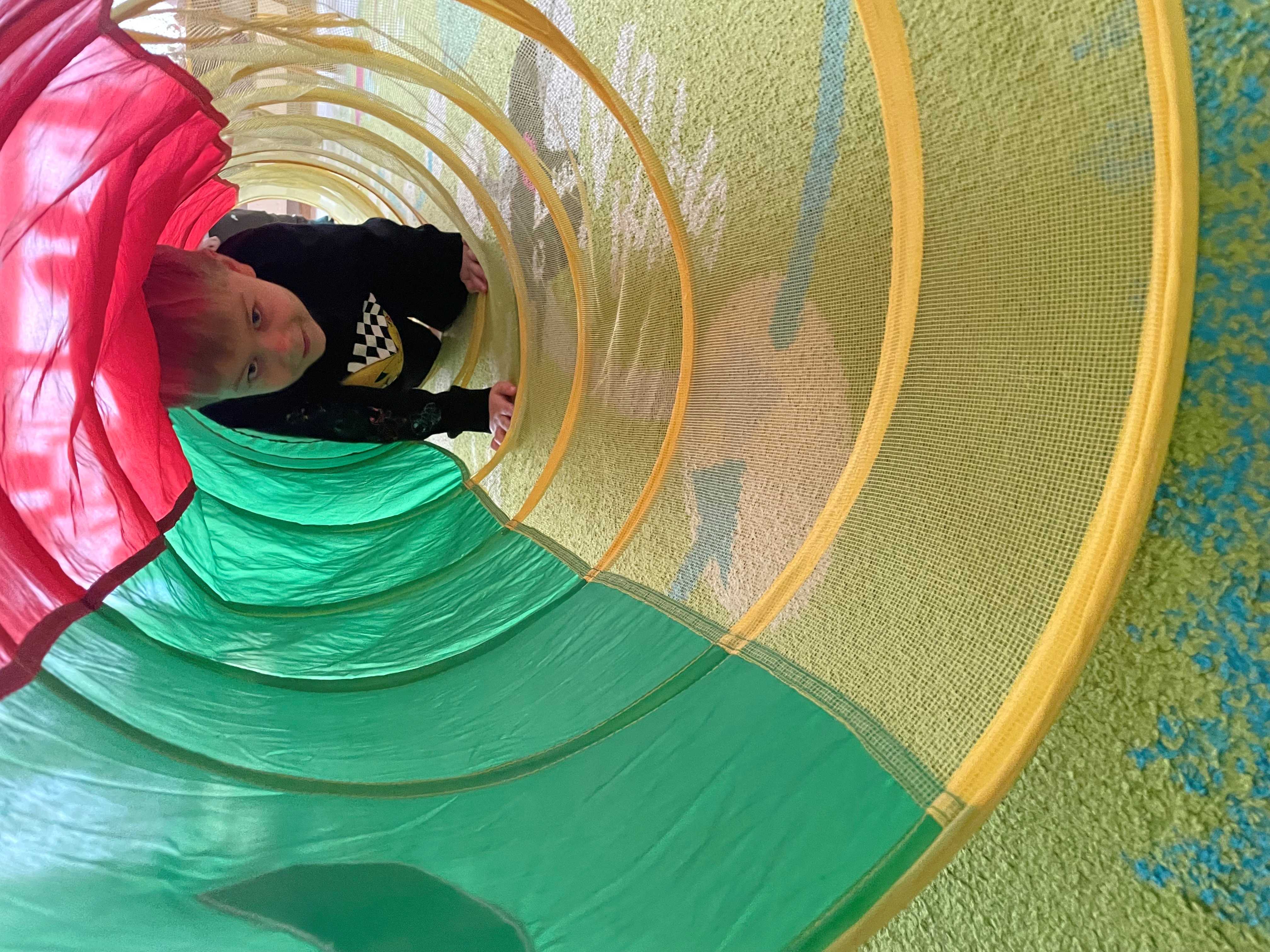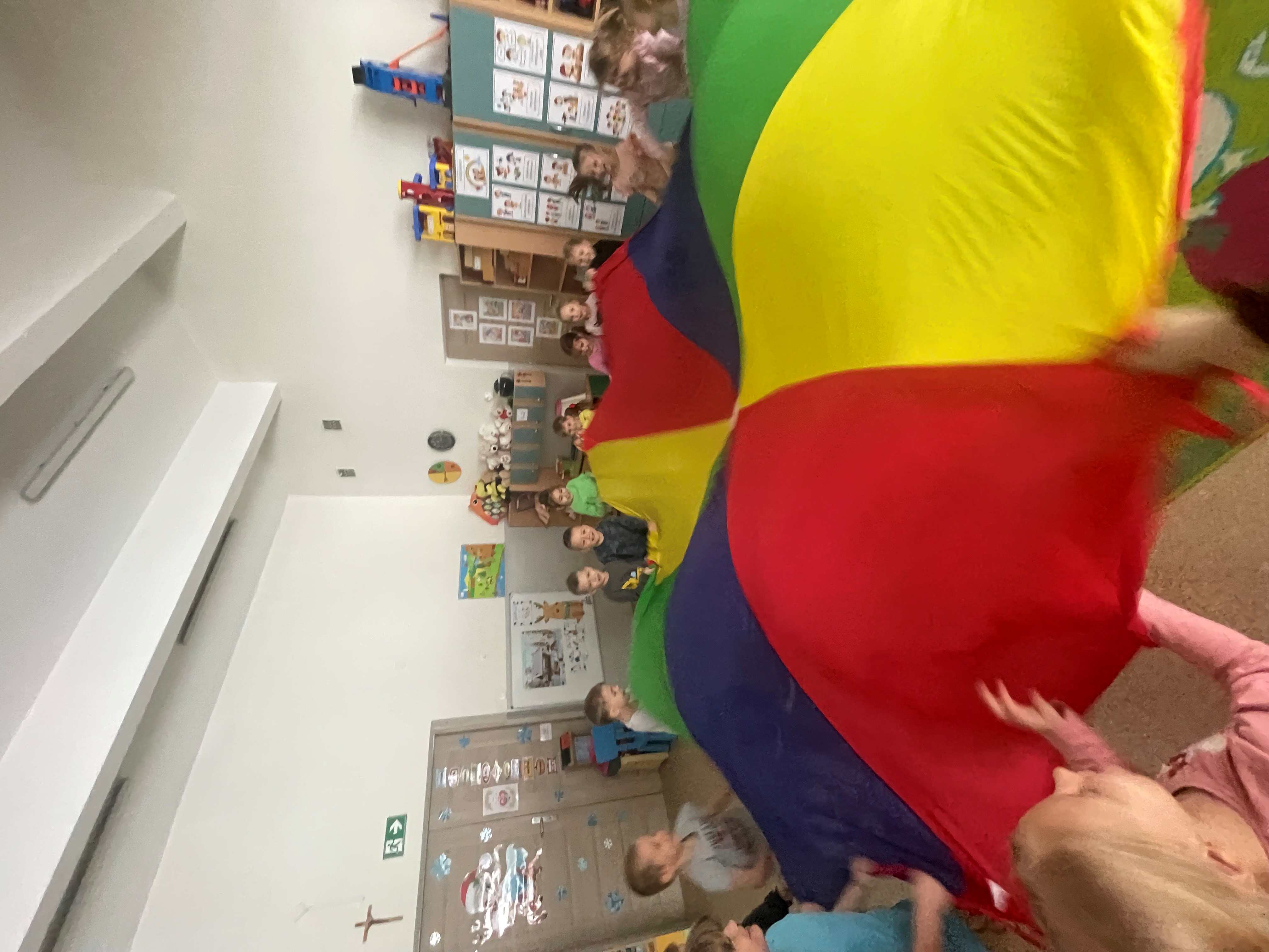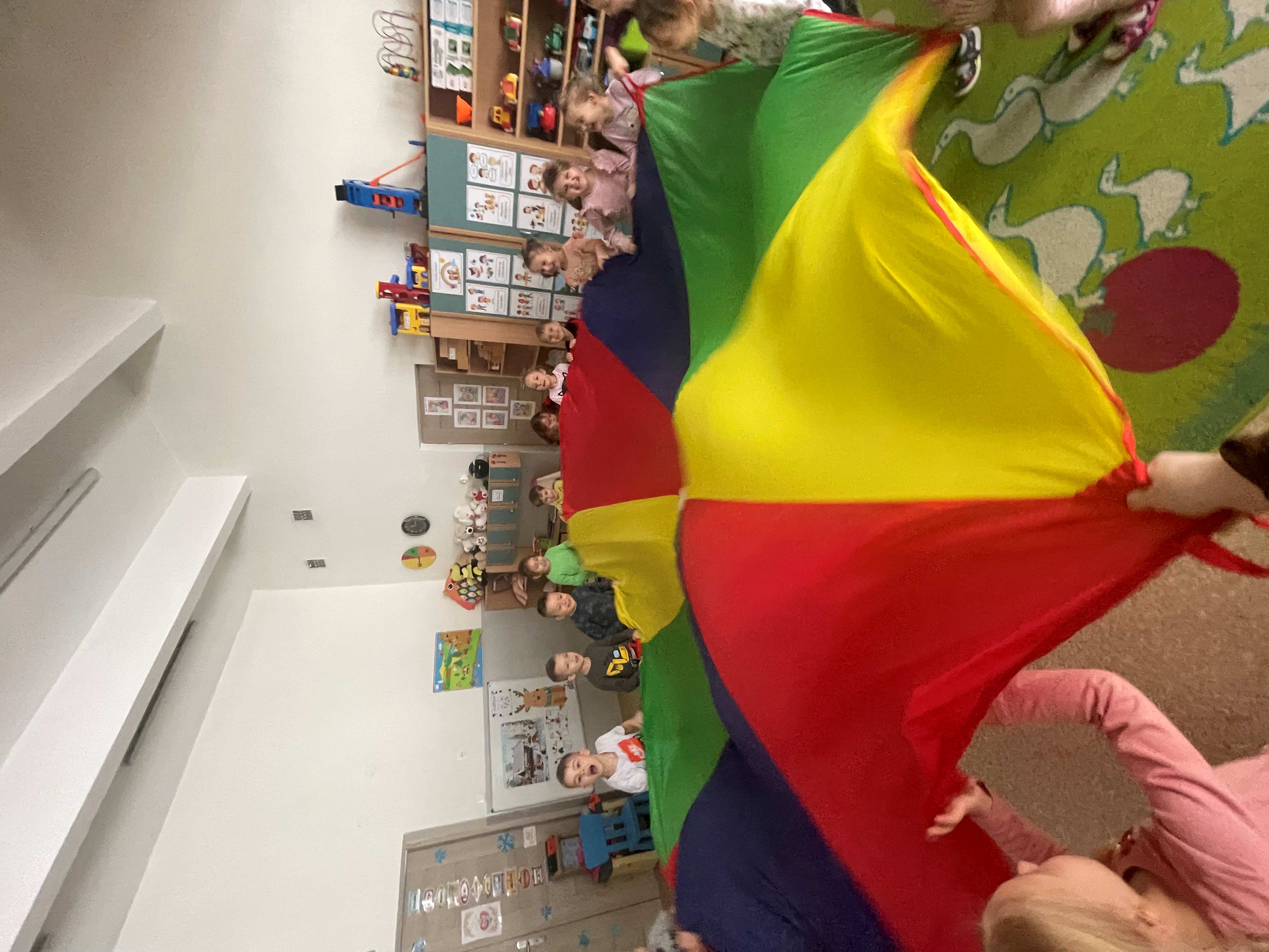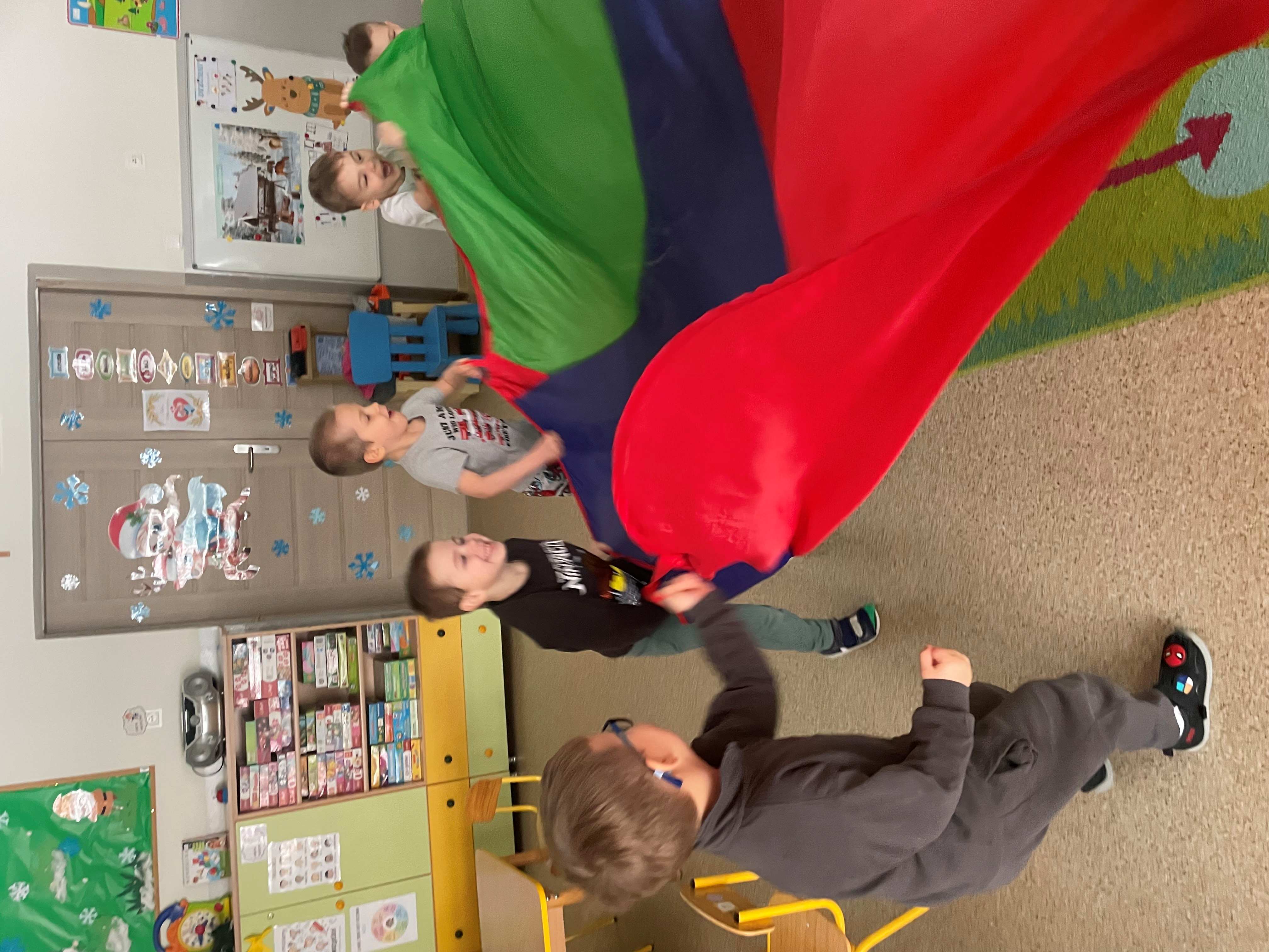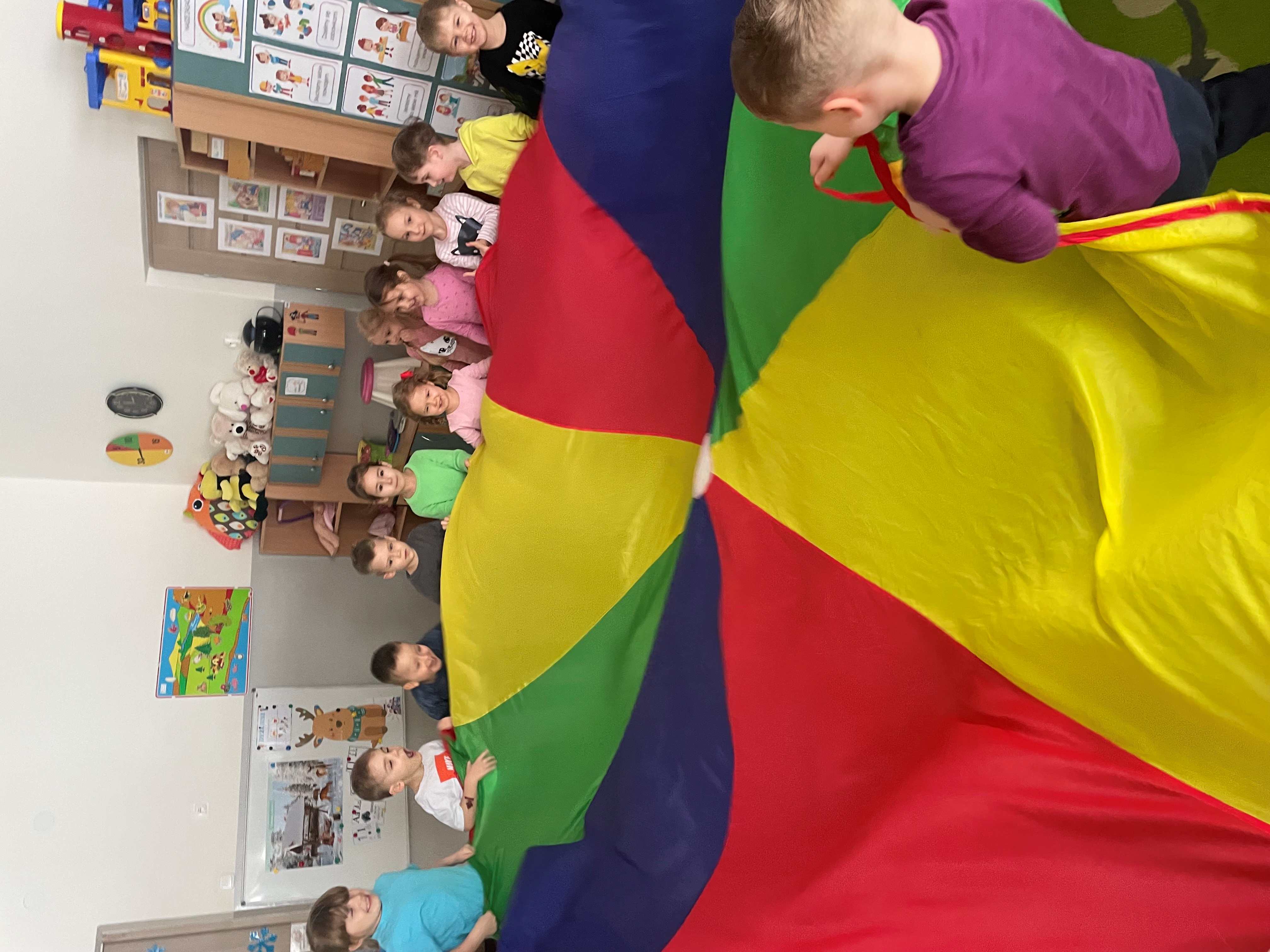 Dzieci korzystały z przedszkolnych zasobów i świetnie bawiły się na torze przeszkód, rozwijając swoją sprawność, równowagę i koordynację. Nie zabrakło też uśmiechów podczas zabaw z chustą animacyjną, która dostarczyła mnóstwo śmiechu i wspólnej energii