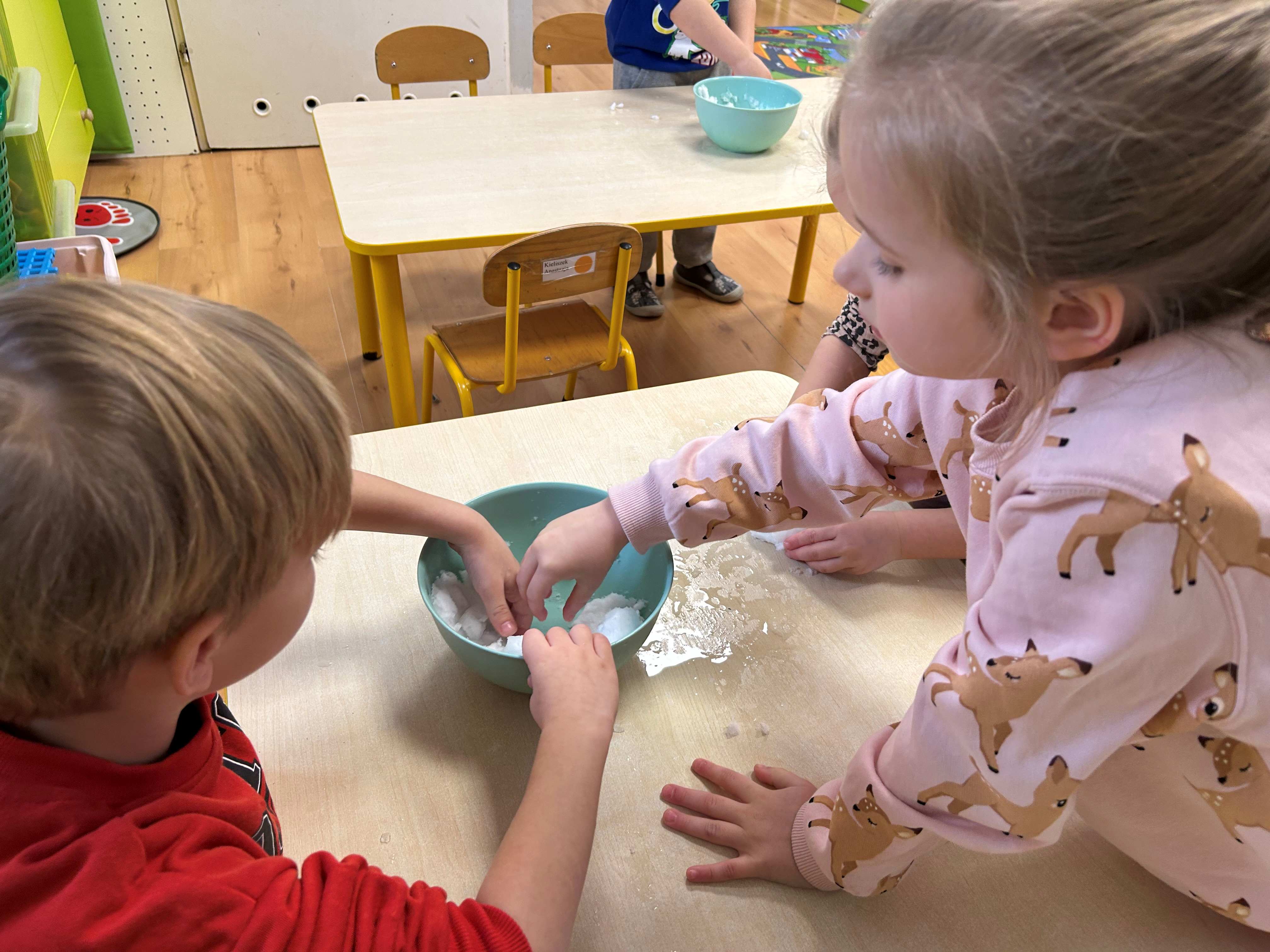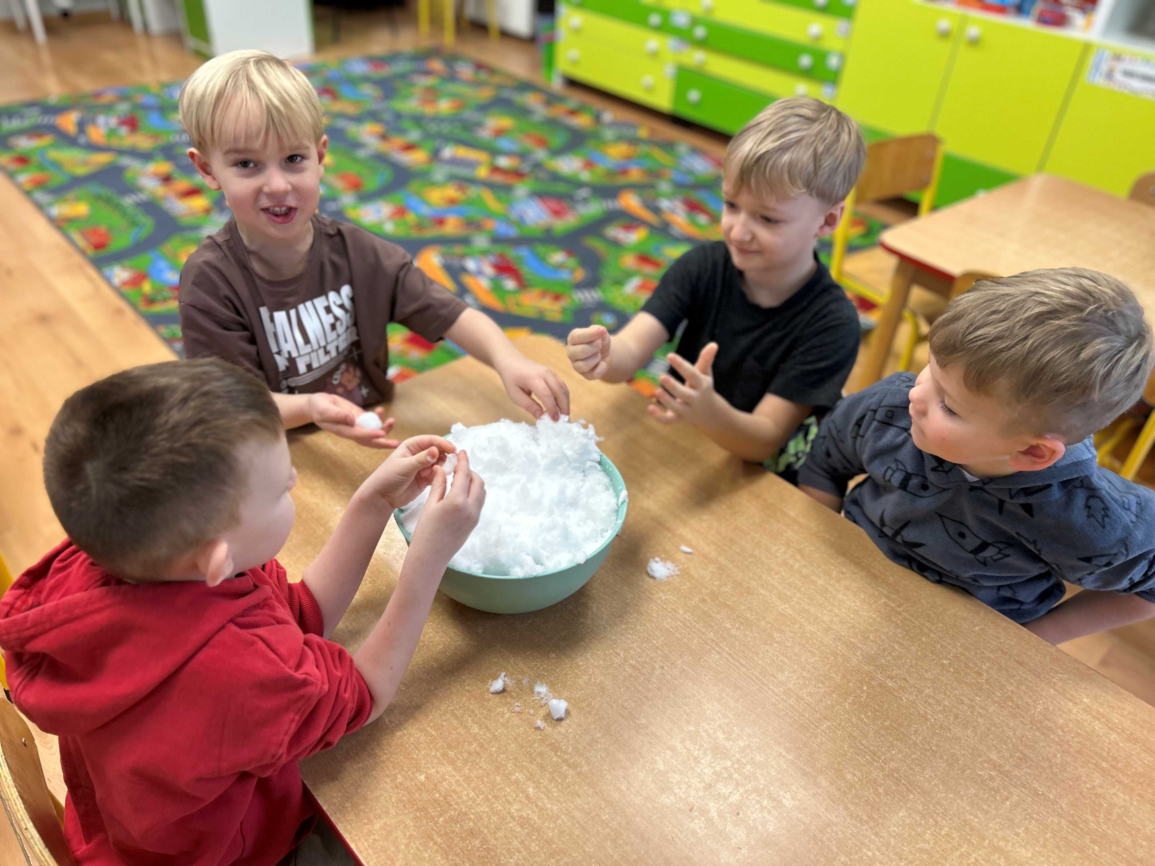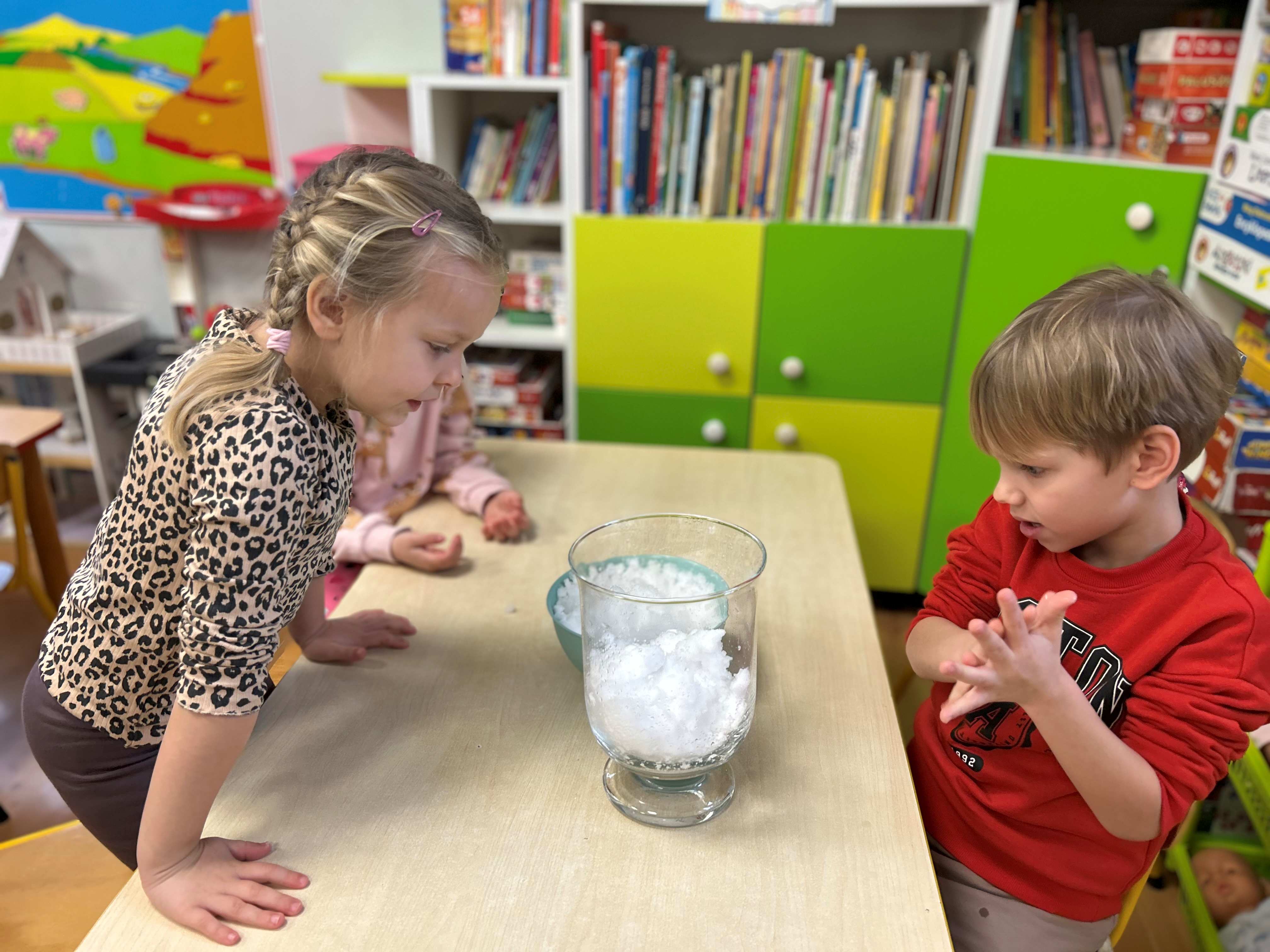 Wynalazcy miały ostatnio okazję uczestniczyć w ciekawych eksperymentach ze śniegiem. Podczas zajęć obserwowały, jak śnieg topnieje, zmienia swój stan oraz co się dzieje, gdy trafi do ciepłego pomieszczenia. Przedszkolaki badały również kolor, temperaturę i konsystencję śniegu, ucząc się poprzez zabawę i doświadczenie. Zajęcia rozwijały ciekawość świata, umiejętność obserwacji oraz zachęcały do zadawania pytań i wspólnego odkrywania zimowych tajemnic.