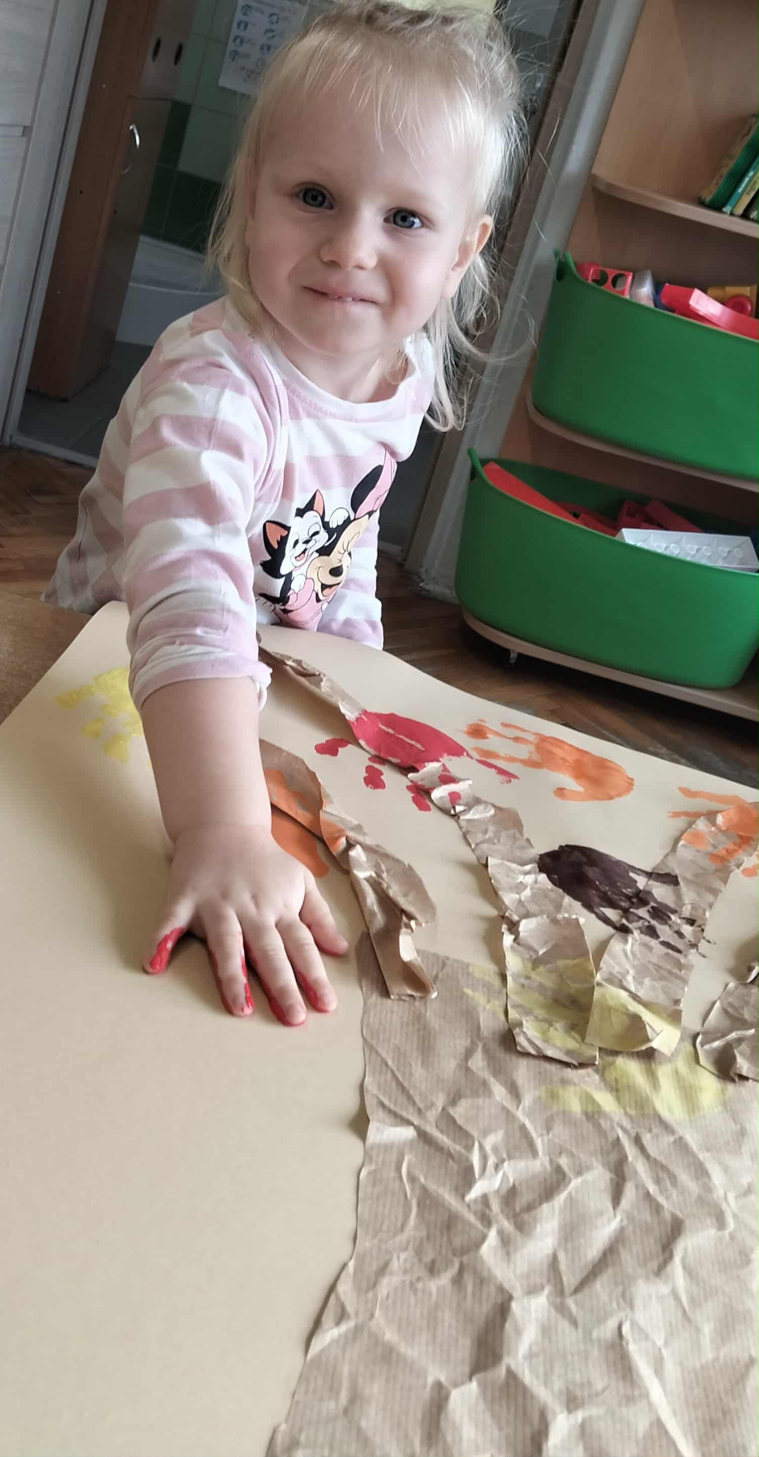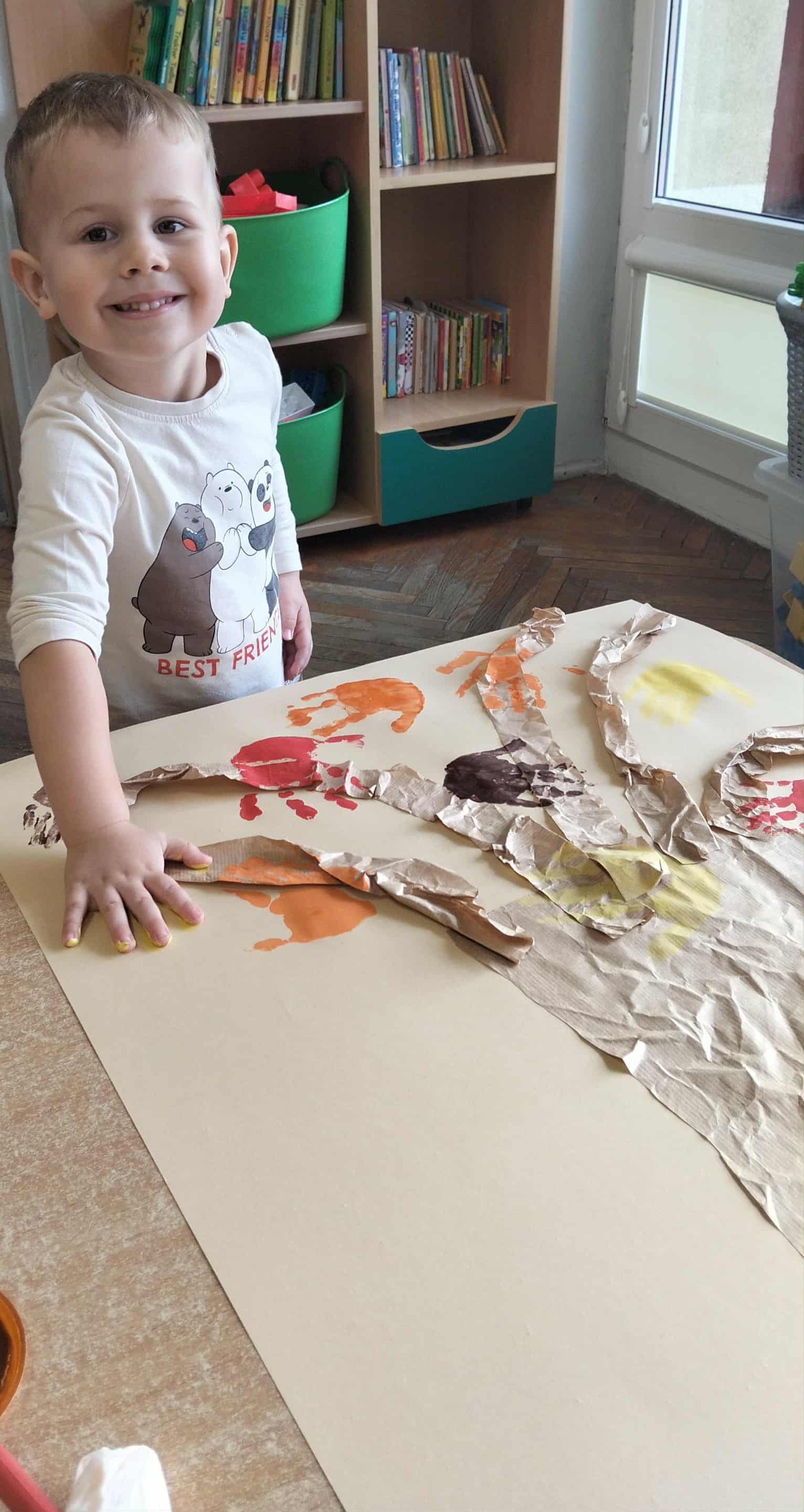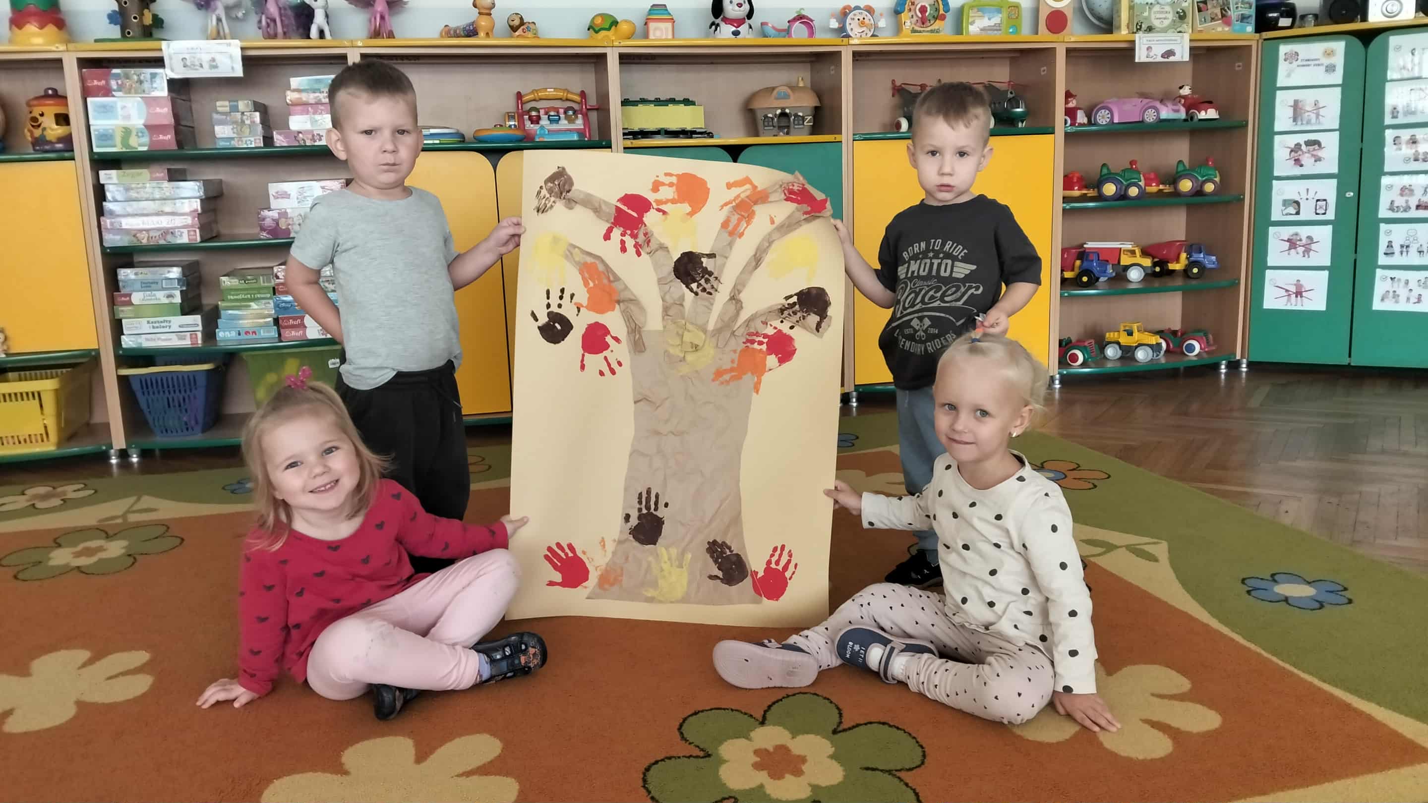 Dzisiaj przedszkolaki z grupy Poszukiwacze wykonały pracę plastyczną – „Jesienne drzewo”. Maluszki moczyły rączki w kolorowych farbach i odbijały je na makiecie drzewa. Wszystkie dzieci bardzo się starały. Powstało piękne, kolorowe jesienne drzewo. Jesień niesie wiele inspiracji, dlatego jeszcze nie raz zobaczymy jesienne prace dzieci.