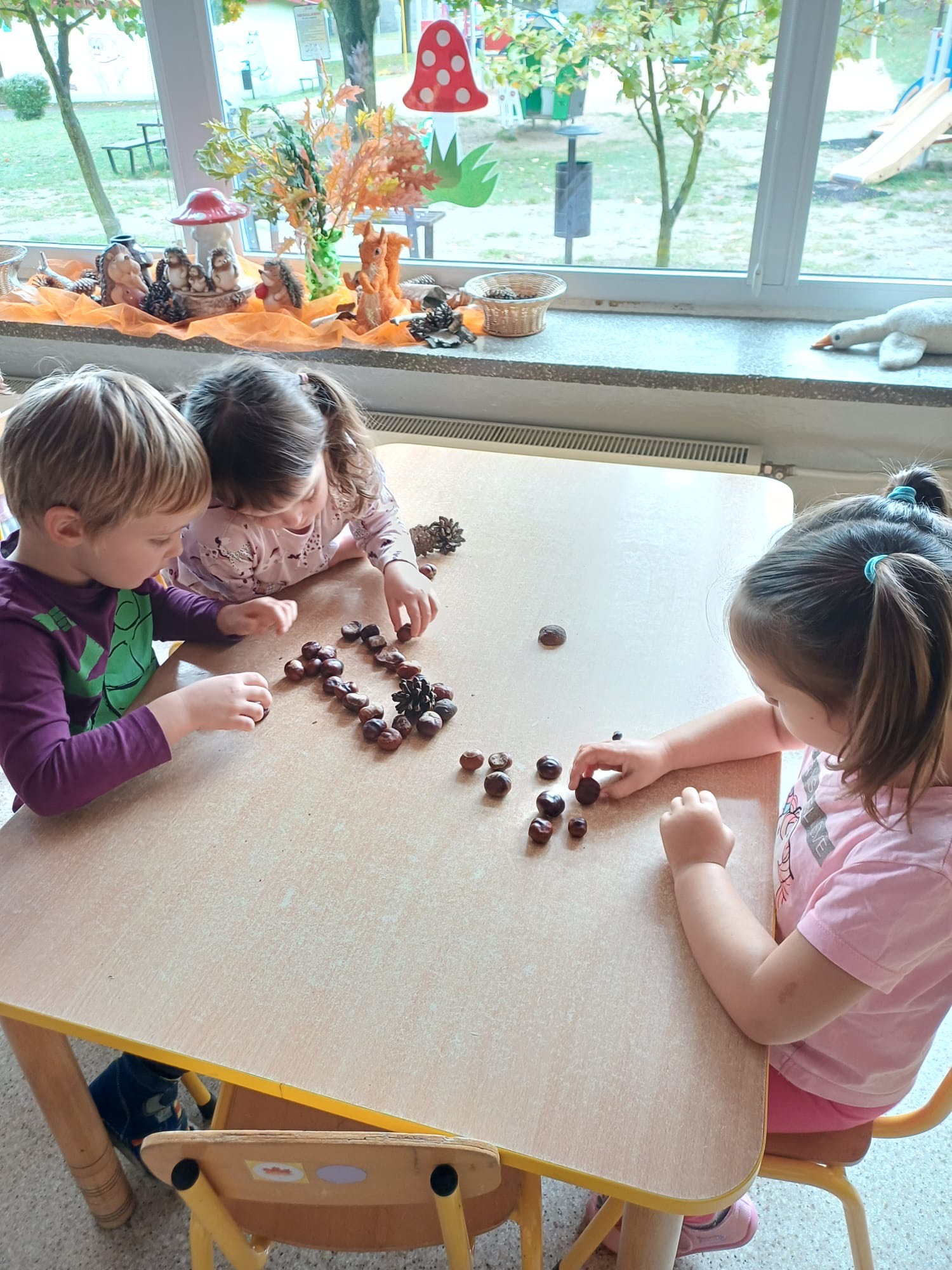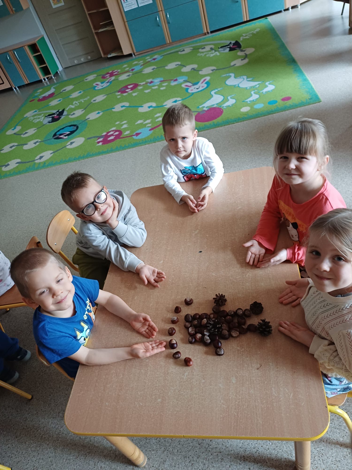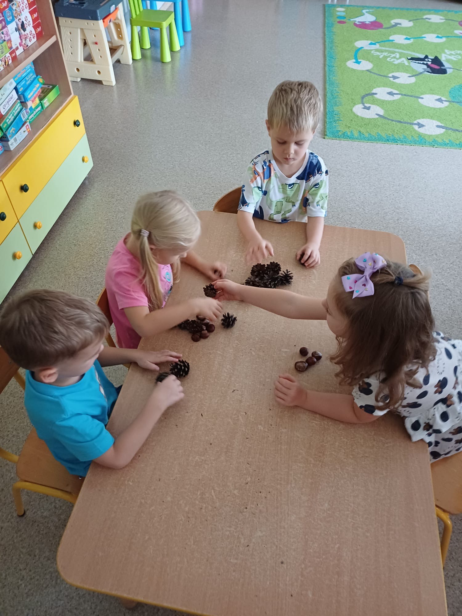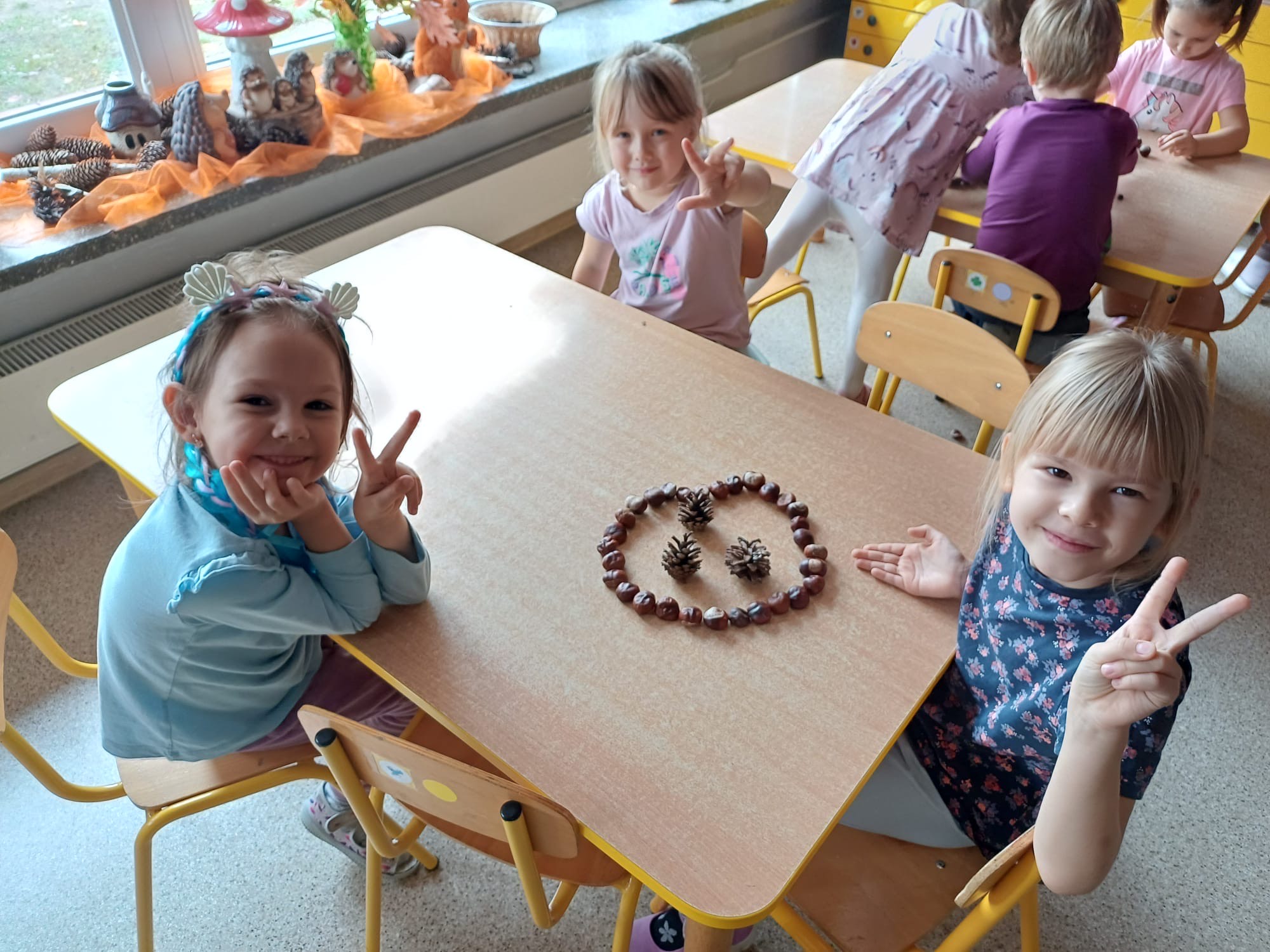 W grupie Tropiciele odbyły się jesienne zabawy z wykorzystaniem darów natury – kasztanów i szyszek. Dzieci z ogromnym zaangażowaniem tworzyły przy stolikach różnorodne kompozycje i obrazki, układając z kasztanów i szyszek postacie, zwierzątka oraz jesienne wzory.