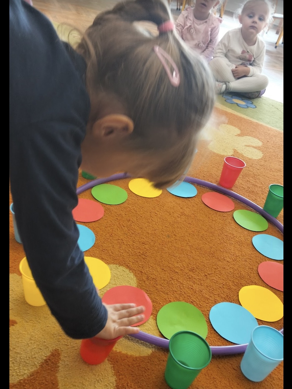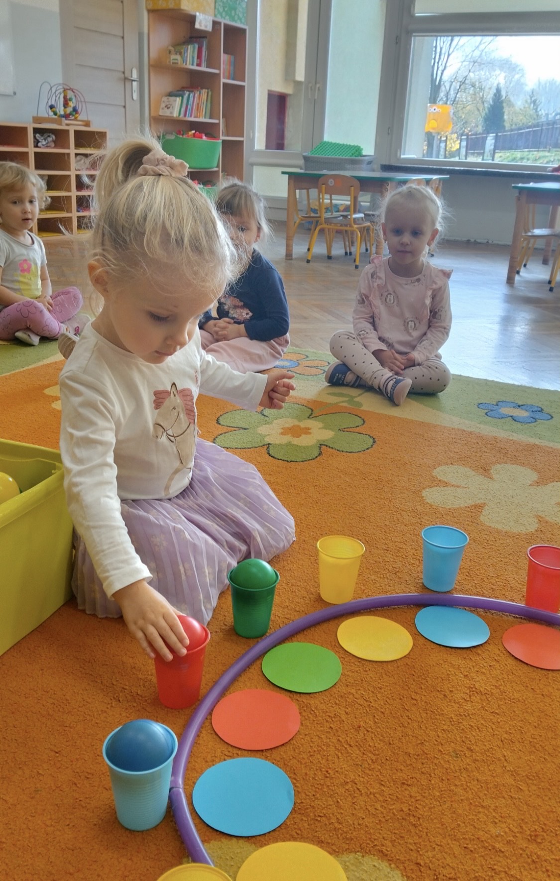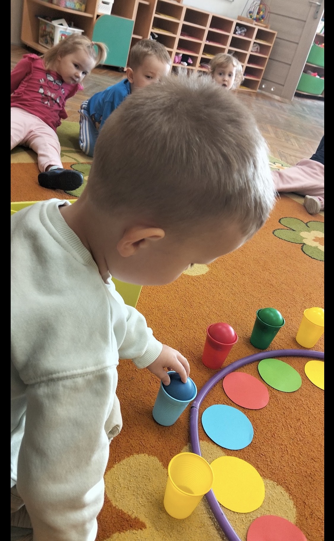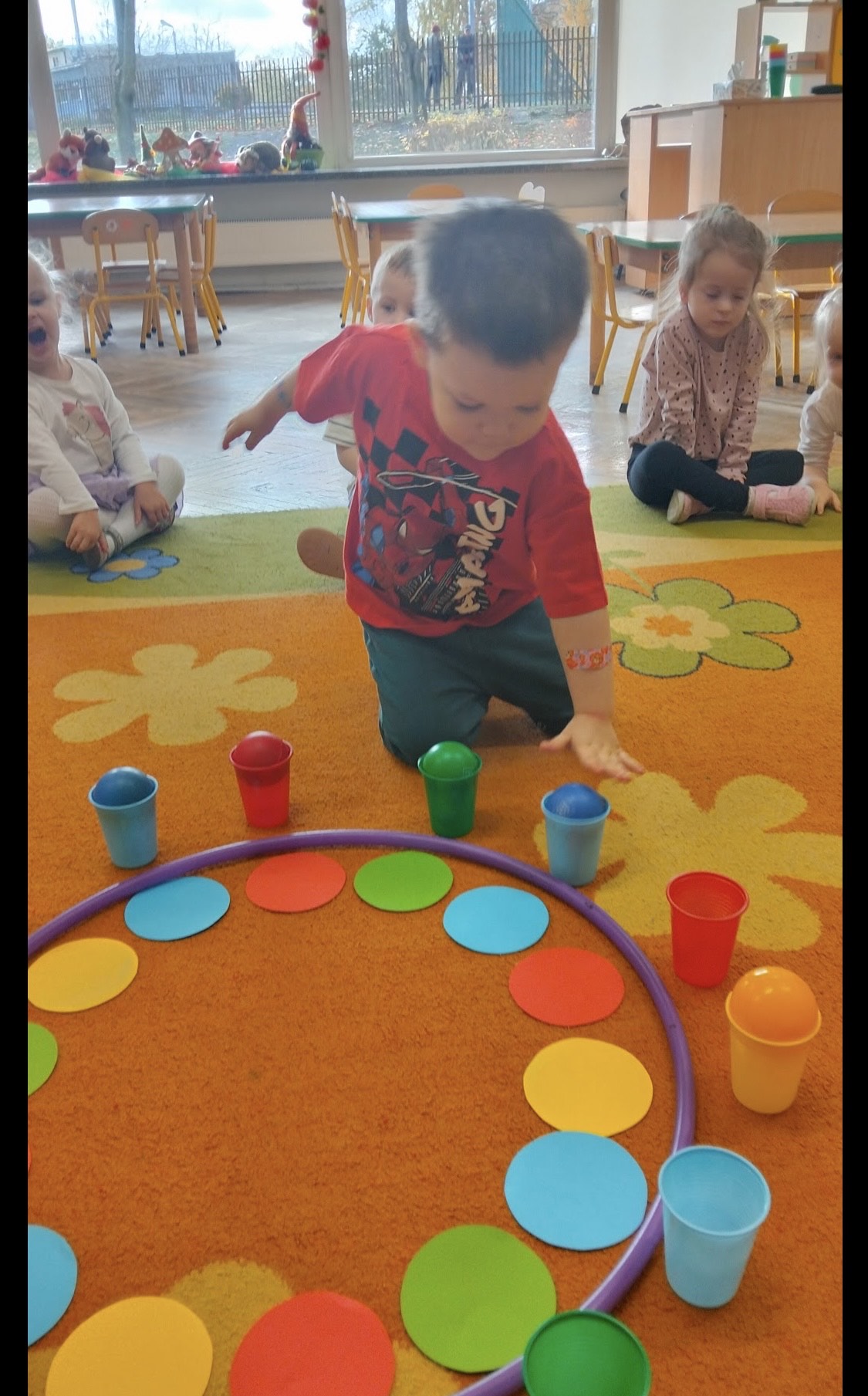 Tym razem do nauki kolorów użyłyśmy kolorowych kółek i piłeczek oraz kubeczków. Zadanie Poszukiwaczy polegało na dopasowaniu koloru piłki do odpowiedniego kubeczka. Dzięki takim zajęciom kształtujemy percepcję wzrokową i logiczne myślenie oraz poznajemy kolory.