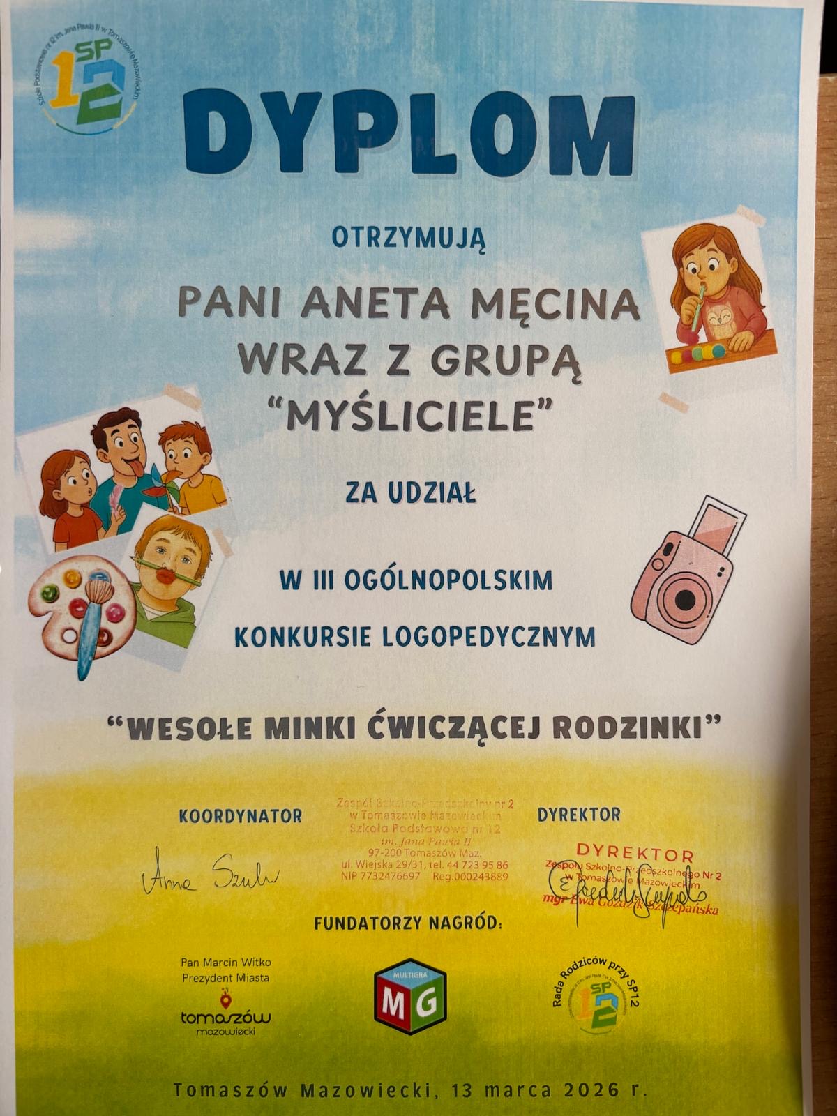 Grupa Myślicieli z dumą ogłasza, że otrzymała dyplom za udział w III Ogólnopolskim Konkursie Logopedycznym „Wesołe Minki – Ćwiczące Rodzinki”.