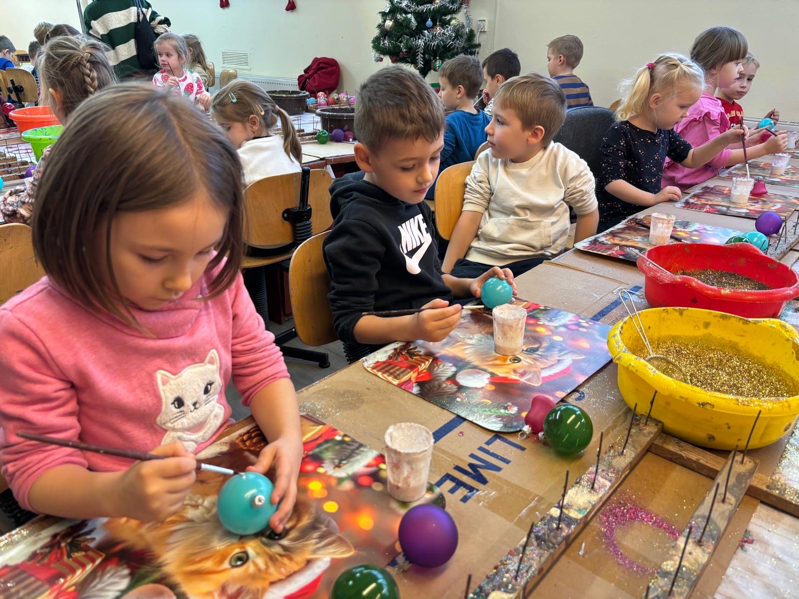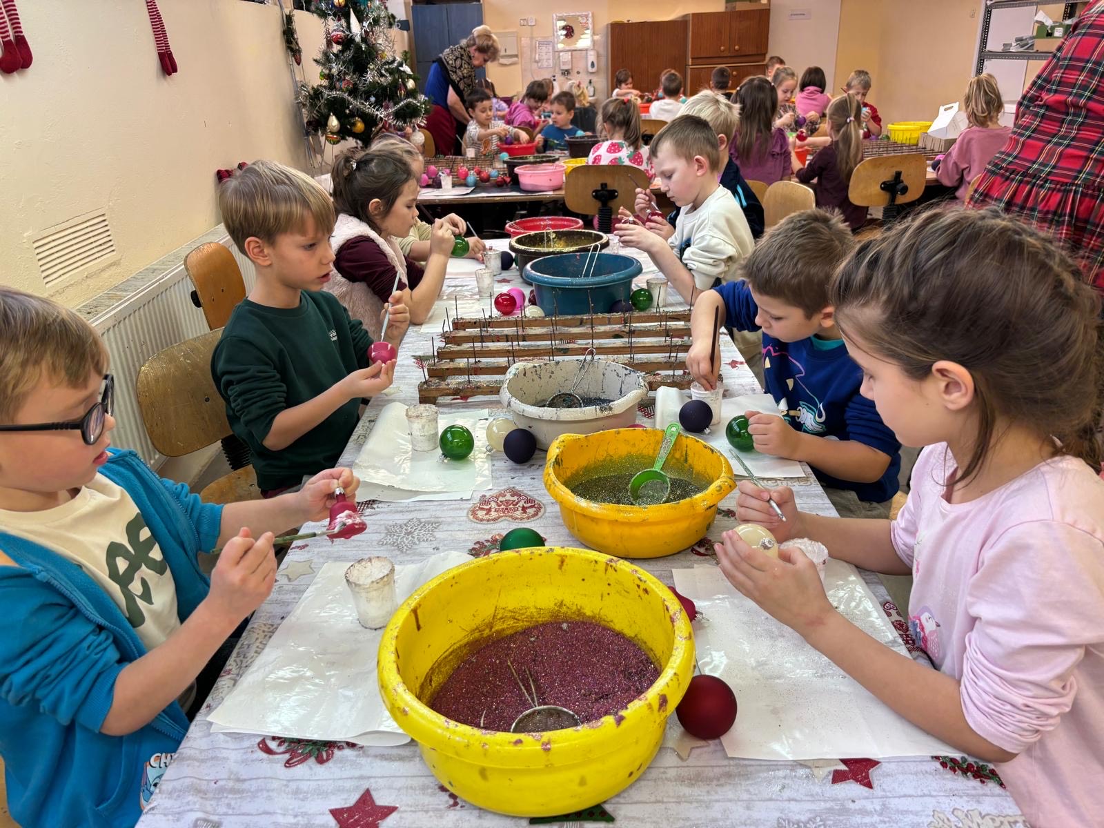 Przedszkolaki wzięły udział w warsztatach dekorowania bombek tworząc niezwykle oryginalne wzory. Gotowe bombki dzieci zabrały w drogę powrotną i będą one zdobiły choinki w ich domach.