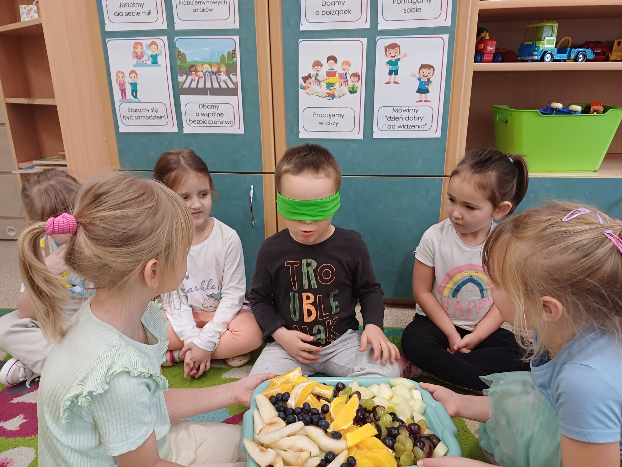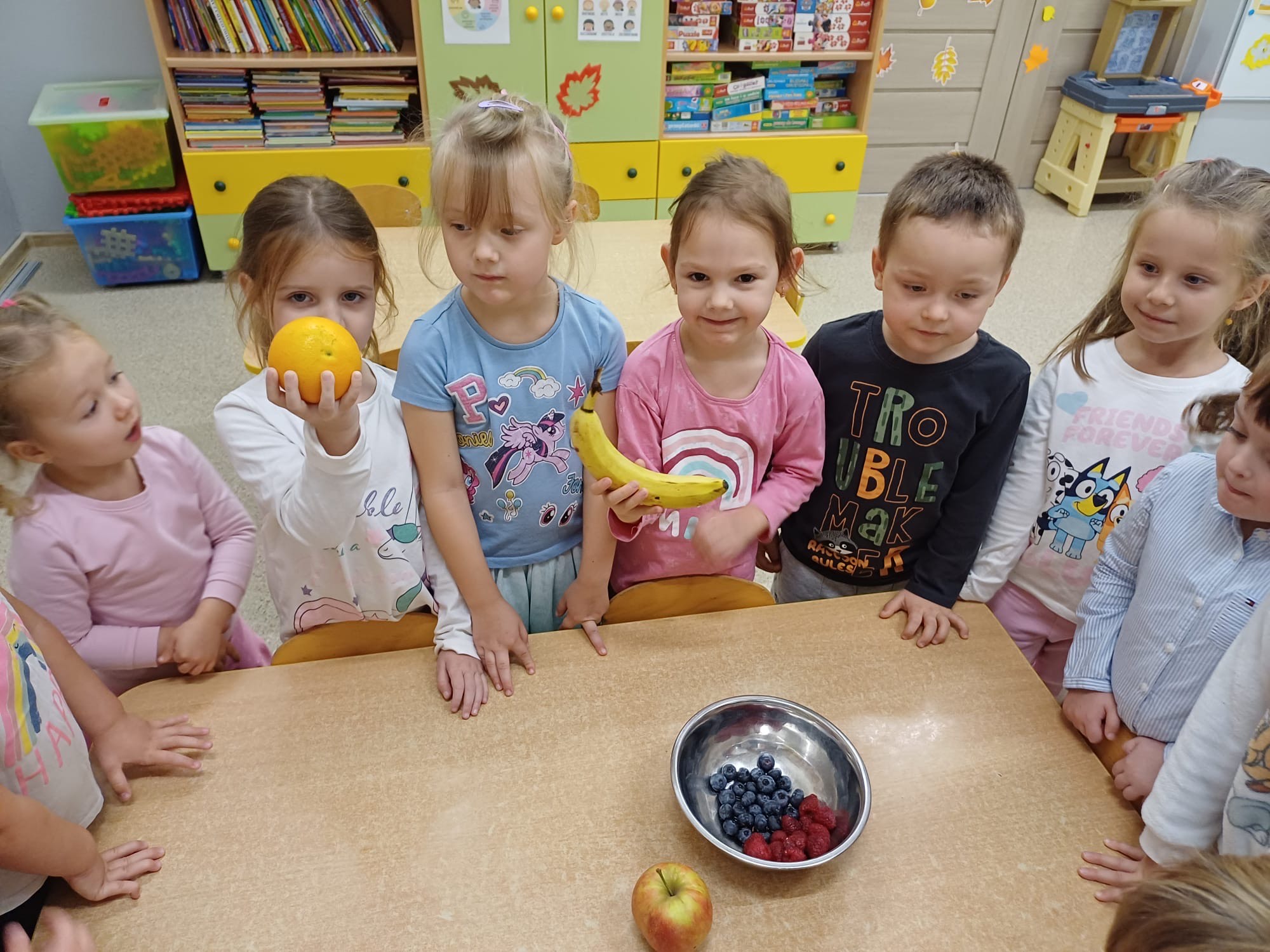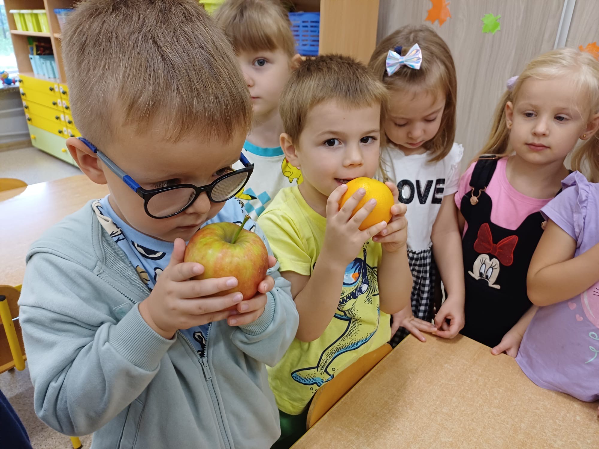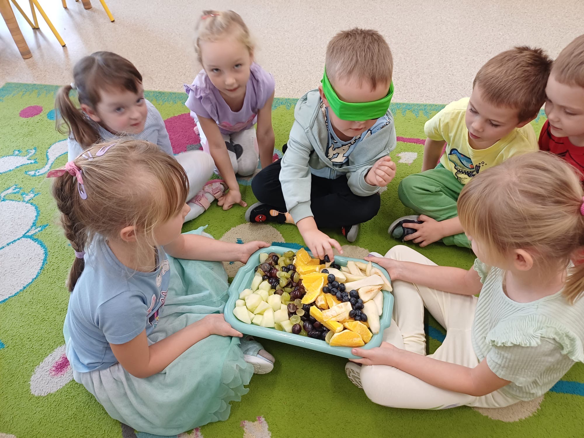 z wykorzystaniem owoców, utrwalając ich nazwy i wygląd. Przedszkolaki poznawały owoce za pomocą zmysłów – dotykały je, wąchały i rozpoznawały po zapachu oraz smaku, rozwijając spostrzegawczość, wrażliwość sensoryczną i wiedzę o zdrowym odżywianiu.