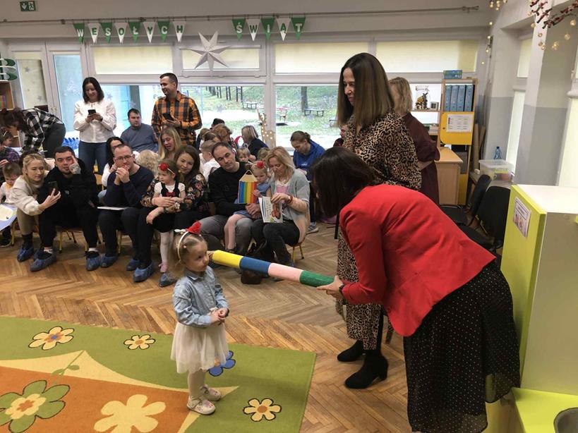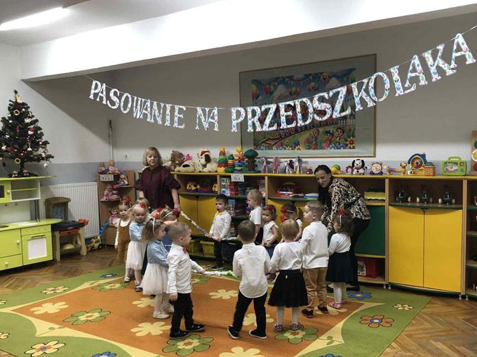 12 grudnia w naszym przedszkolu odbyło się wyjątkowe wydarzenie - uroczystość Pasowania na Przedszkolaka. To jeden z najważniejszych momentów w życiu każdego malucha, który rozpoczyna swoją przygodę z edukacją przedszkolną. Dzieci zaprezentowały program artystyczny, w którym wykazały się talentem, odwagą oraz kreatywnością. Śpiewy, tańce i wiersze w wykonaniu naszych przedszkolaków przyciągnęły uwagę wszystkich obecnych, a na ich twarzach można było dostrzec ogromną radość i dumę. Kulminacyjnym punktem uroczystości było pasowanie, podczas którego każde dziecko zostało pasowane przez Panią Dyrektor Ewę Goździk – Szczepańską specjalną kredką. Przedszkolaki z wielką powagą i uśmiechem na twarzy odbierały dyplomy oraz pamiątkowe książeczki, które będą przypominały im o tym wyjątkowym dniu. Na zakończenie rodzice naszych przedszkolaków częstowali pysznym tortem. Pasowanie na Przedszkolaka to nie tylko ważny moment w życiu dzieci, ale także początek ich wspólnej przygody w naszym przedszkolu, pełnej nauki, zabawy i niezapomnianych wspomnień.