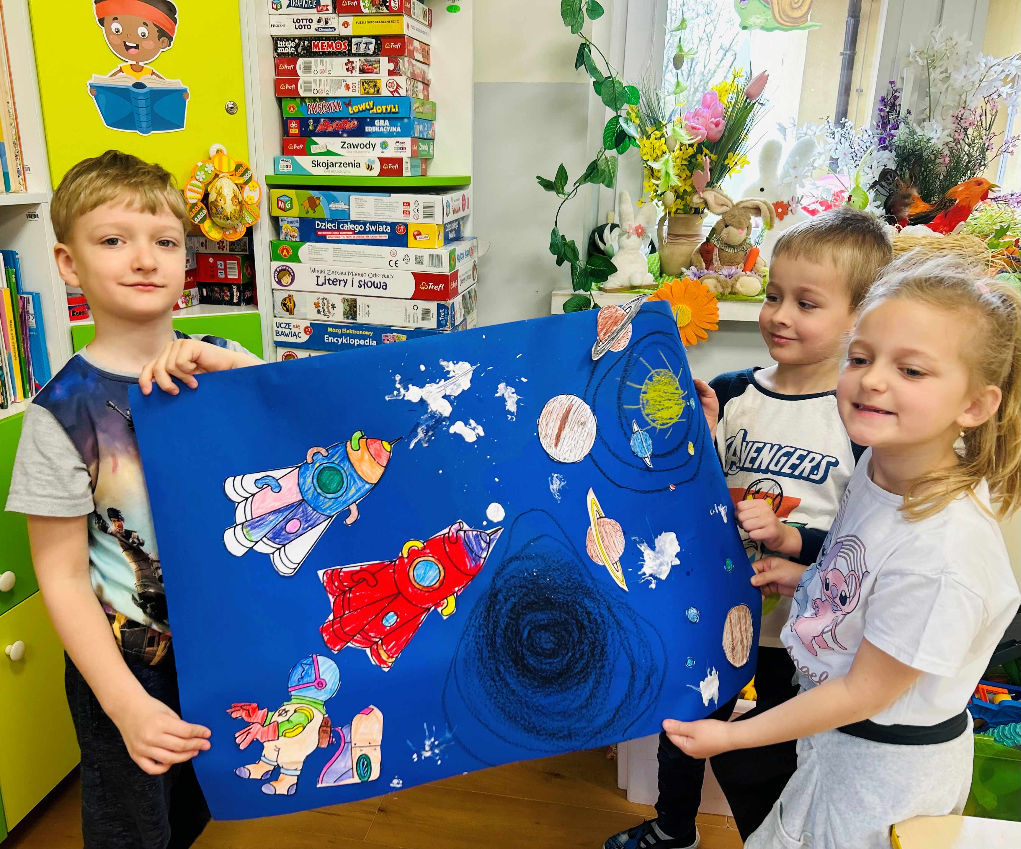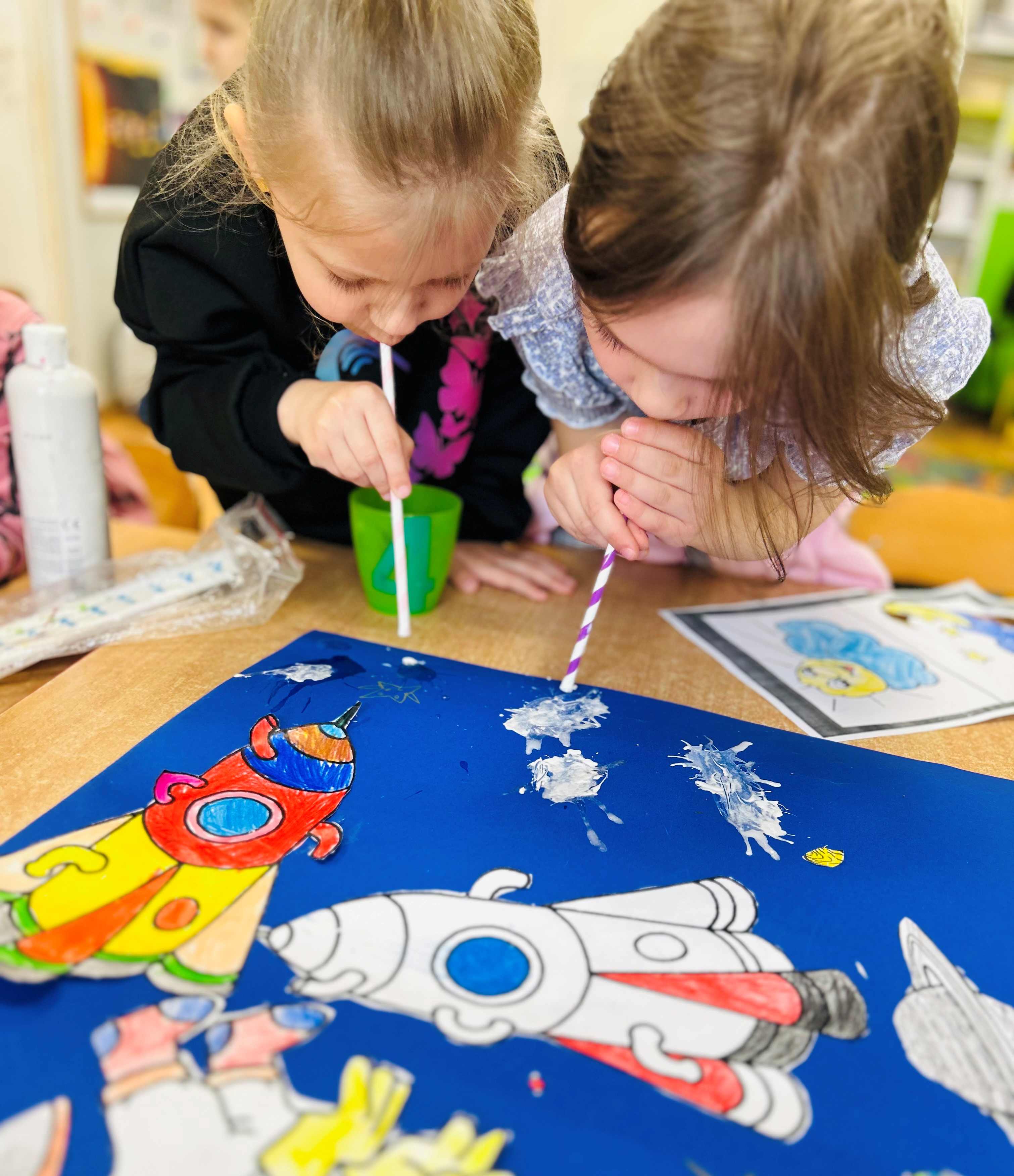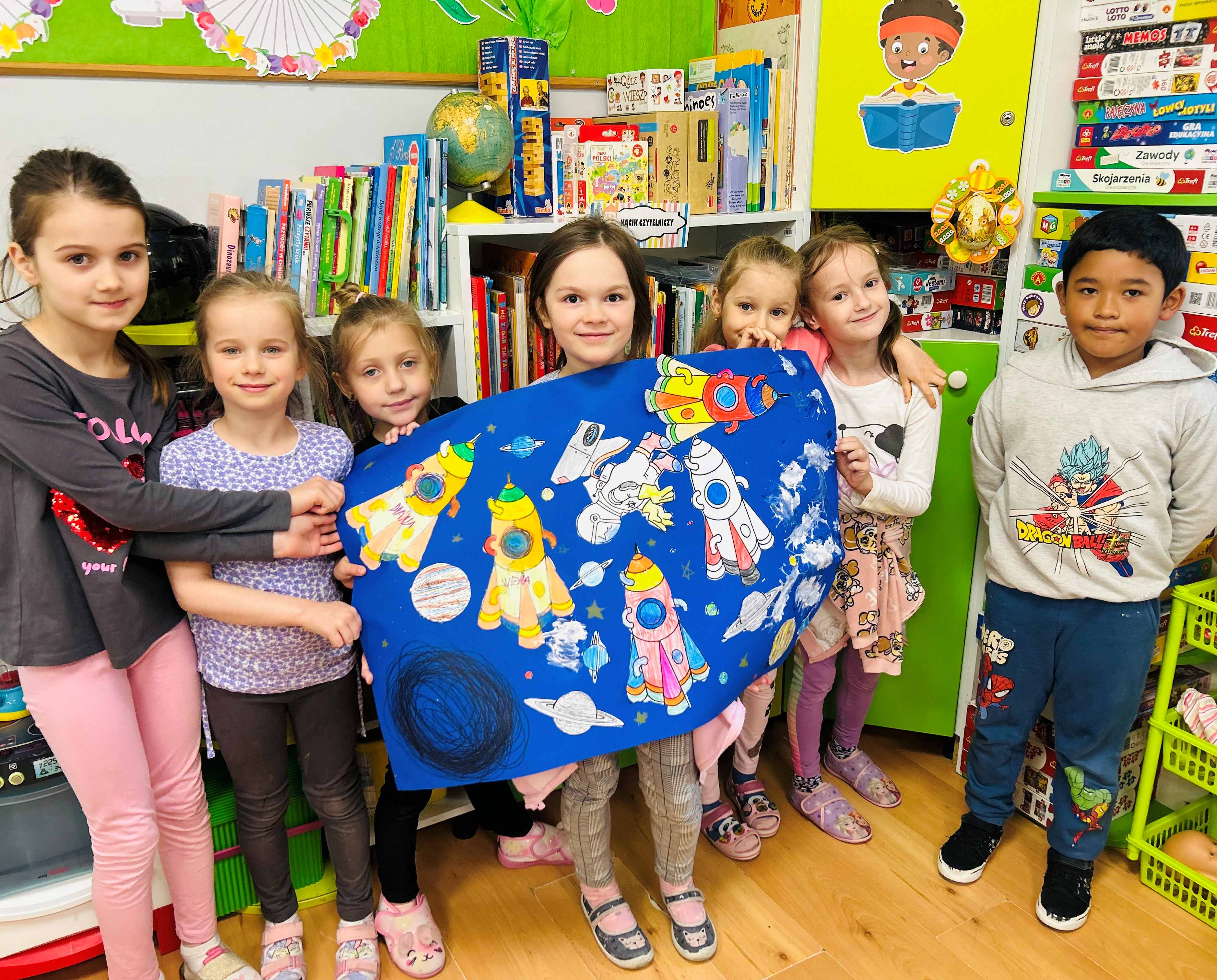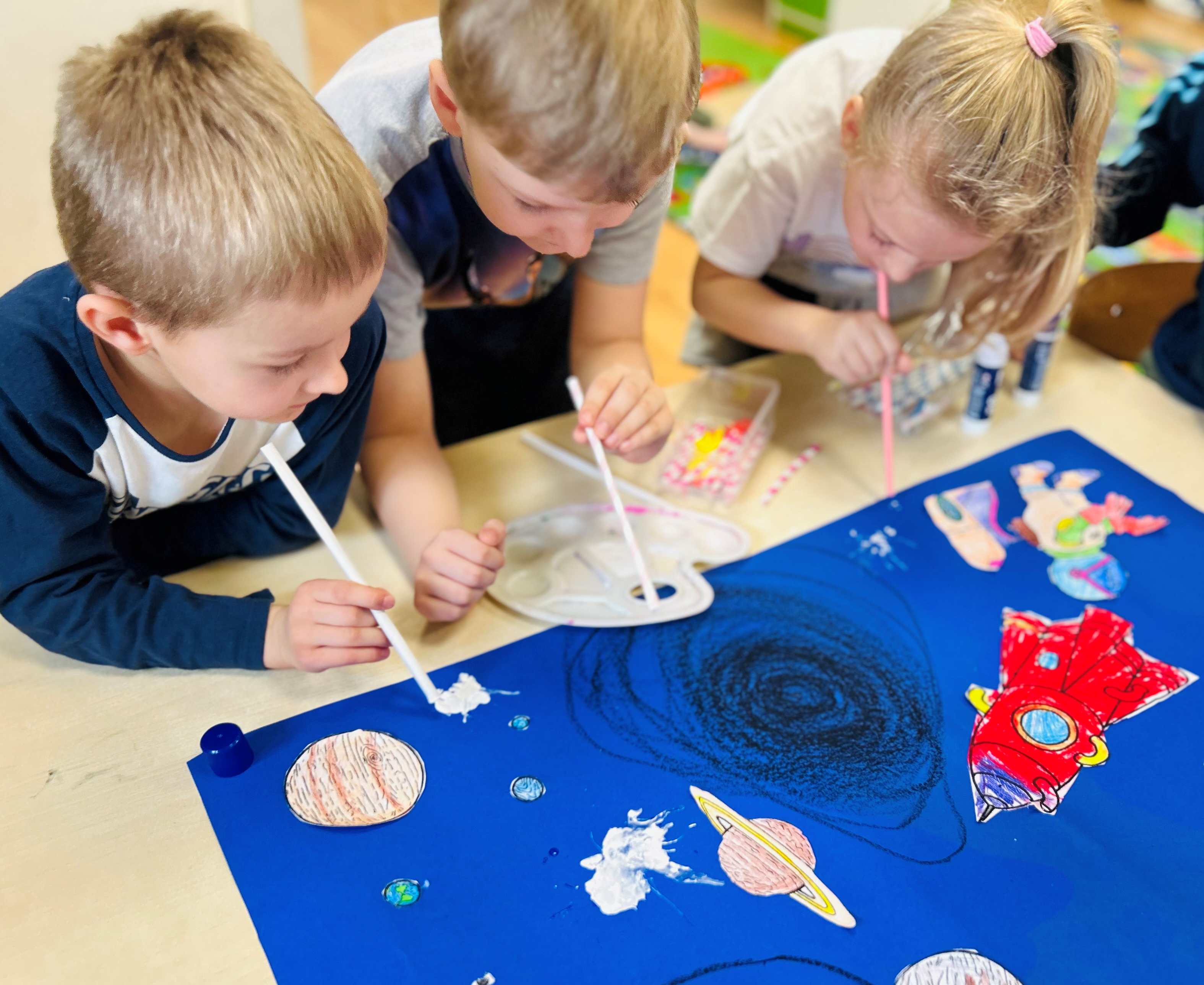 Przedszkolaki stworzyły prace plastyczne o kosmosie, rozwijając swoją wyobraźnię i kreatywność. Dzieci z wielkim zaangażowaniem przedstawiały planety, gwiazdy, rakiety oraz odległe galaktyki, eksperymentując z kolorami i różnymi technikami plastycznymi. Zajęcia były okazją do poznawania tajemnic wszechświata oraz wspólnej twórczej zabawy, która sprawiła wszystkim wiele radości.