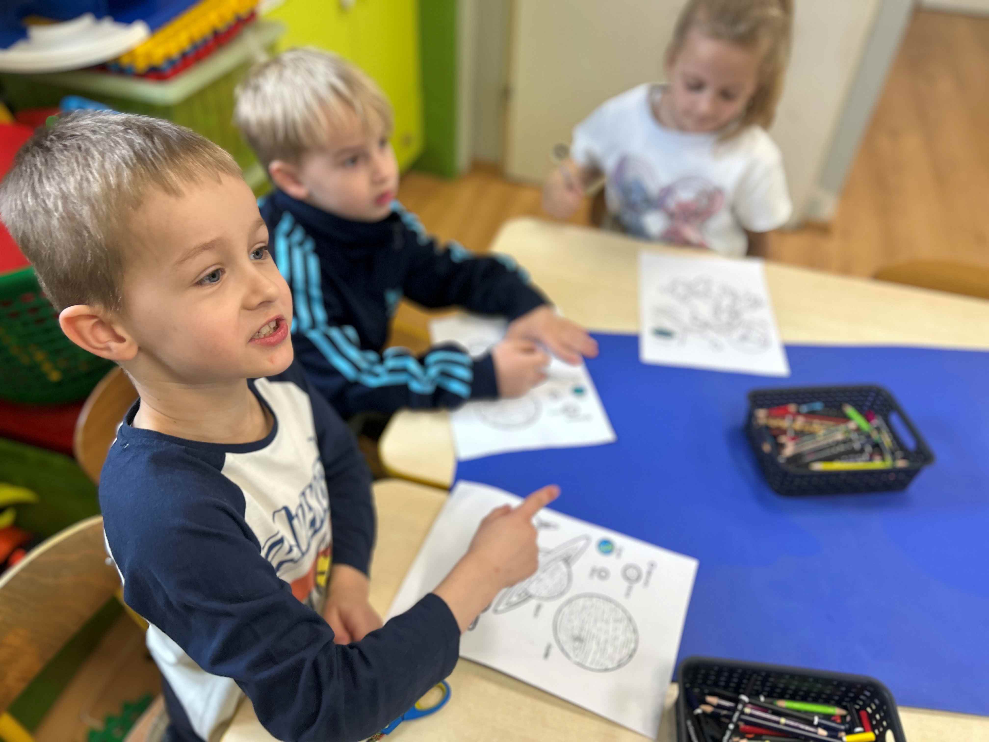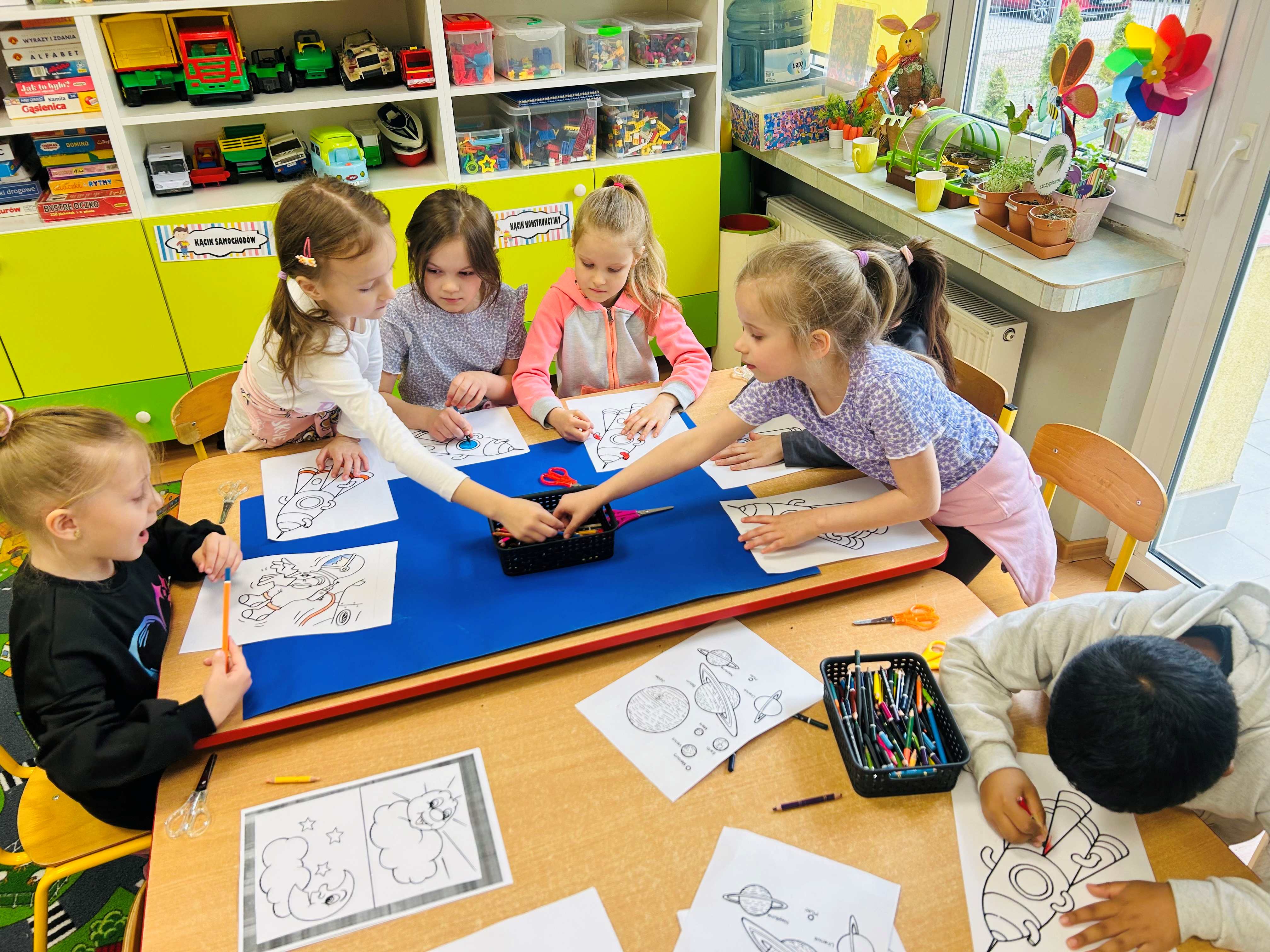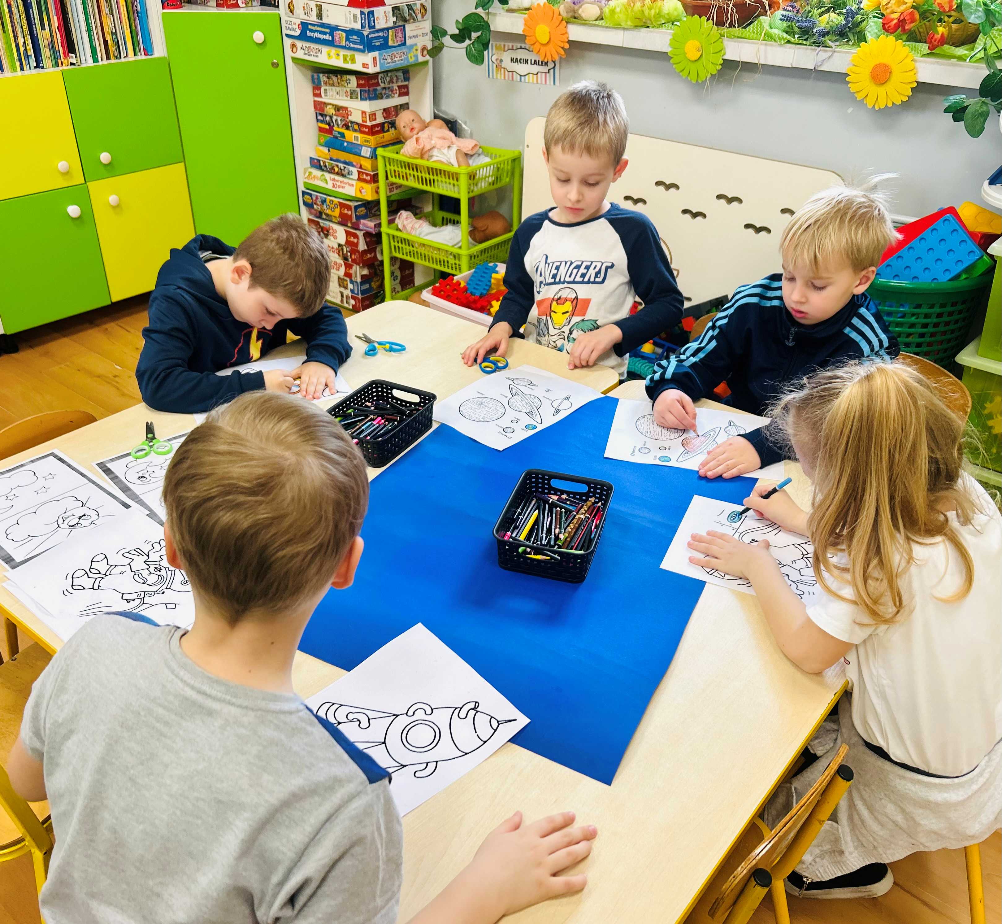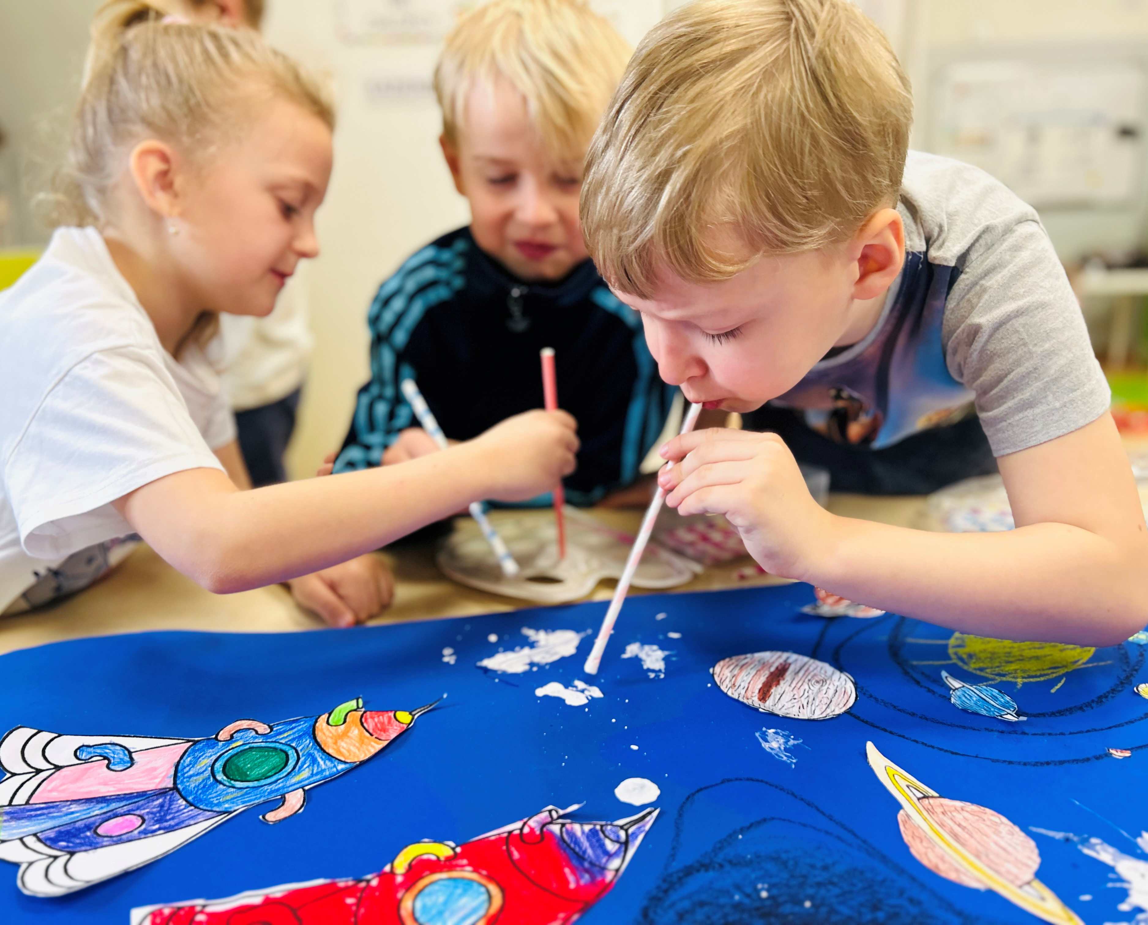 Przedszkolaki stworzyły prace plastyczne o kosmosie, rozwijając swoją wyobraźnię i kreatywność. Dzieci z wielkim zaangażowaniem przedstawiały planety, gwiazdy, rakiety oraz odległe galaktyki, eksperymentując z kolorami i różnymi technikami plastycznymi. Zajęcia były okazją do poznawania tajemnic wszechświata oraz wspólnej twórczej zabawy, która sprawiła wszystkim wiele radości.
