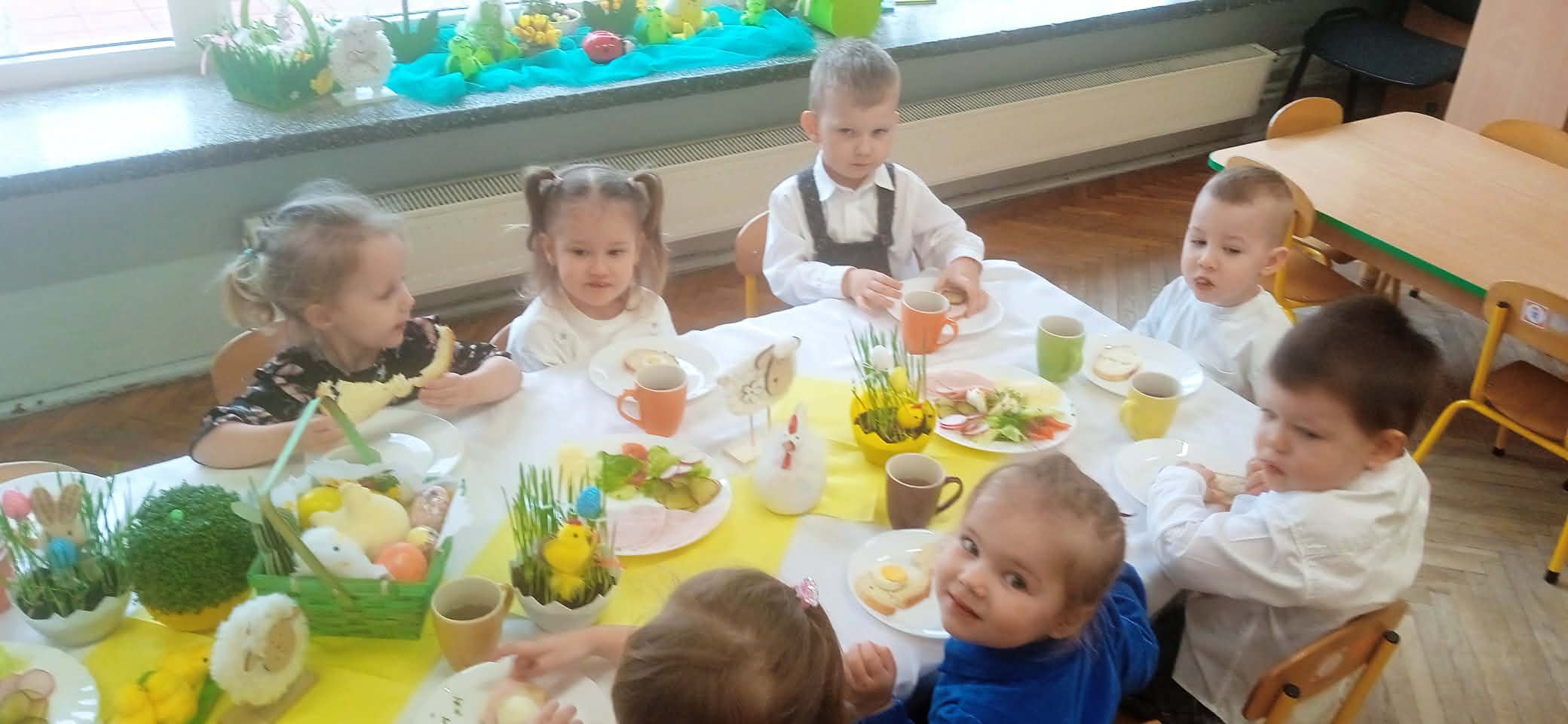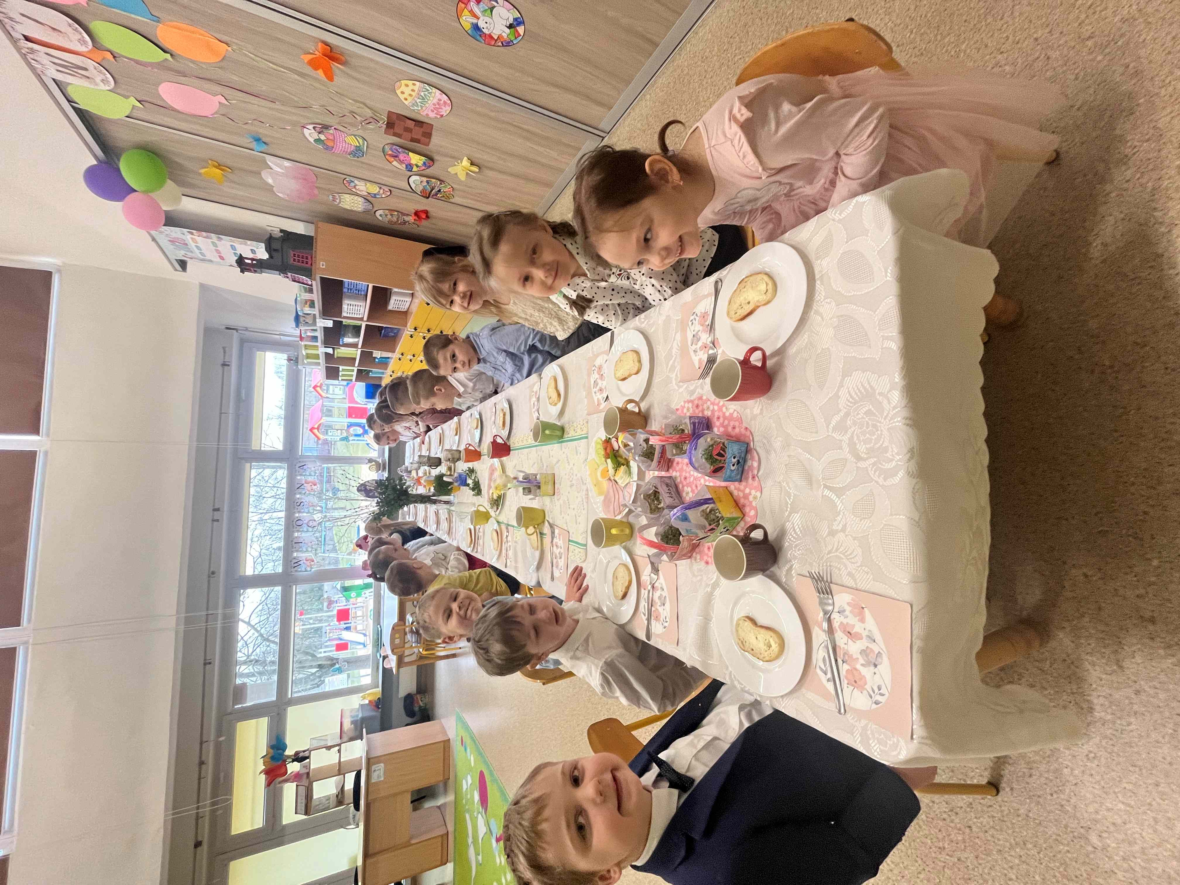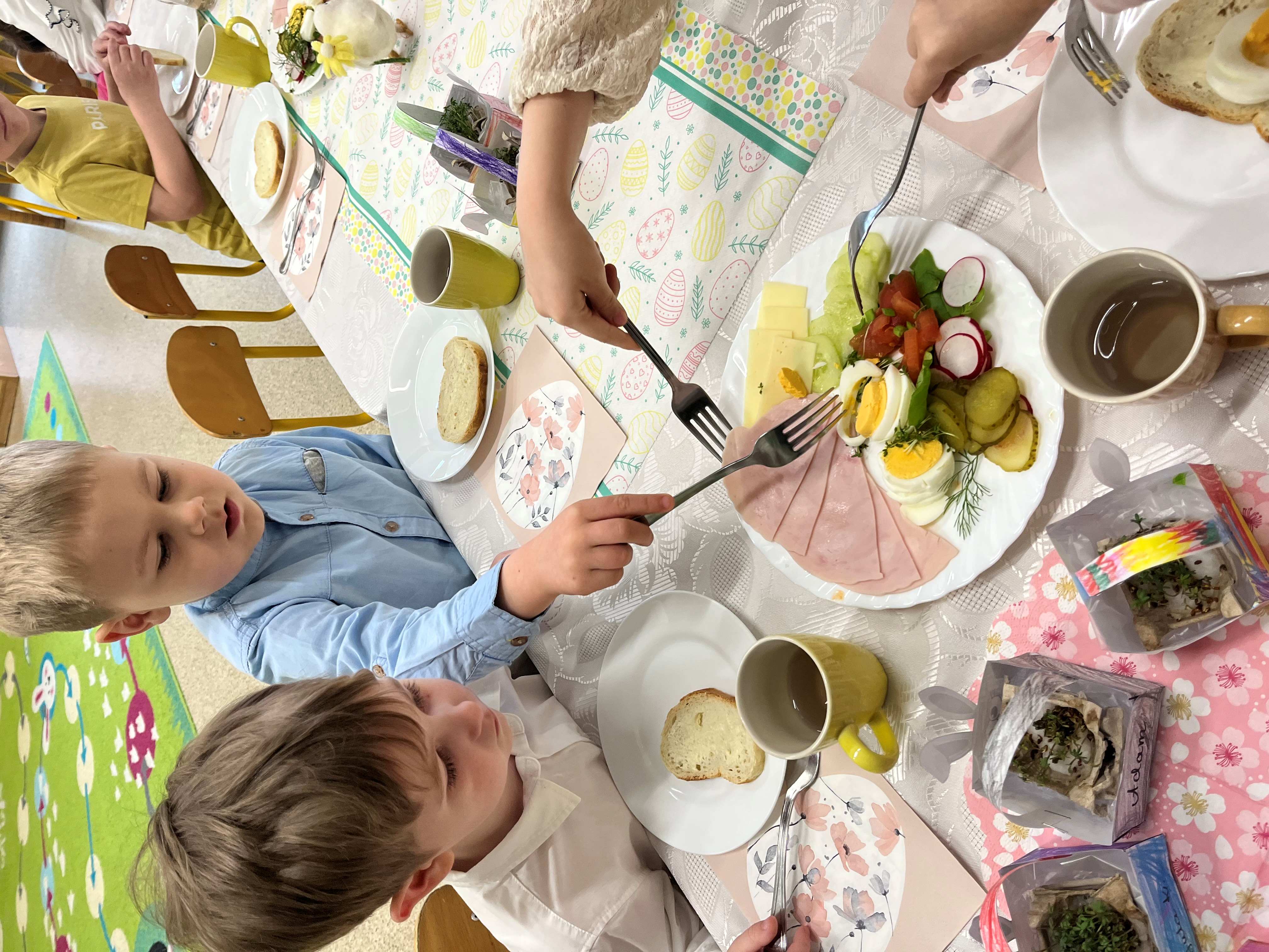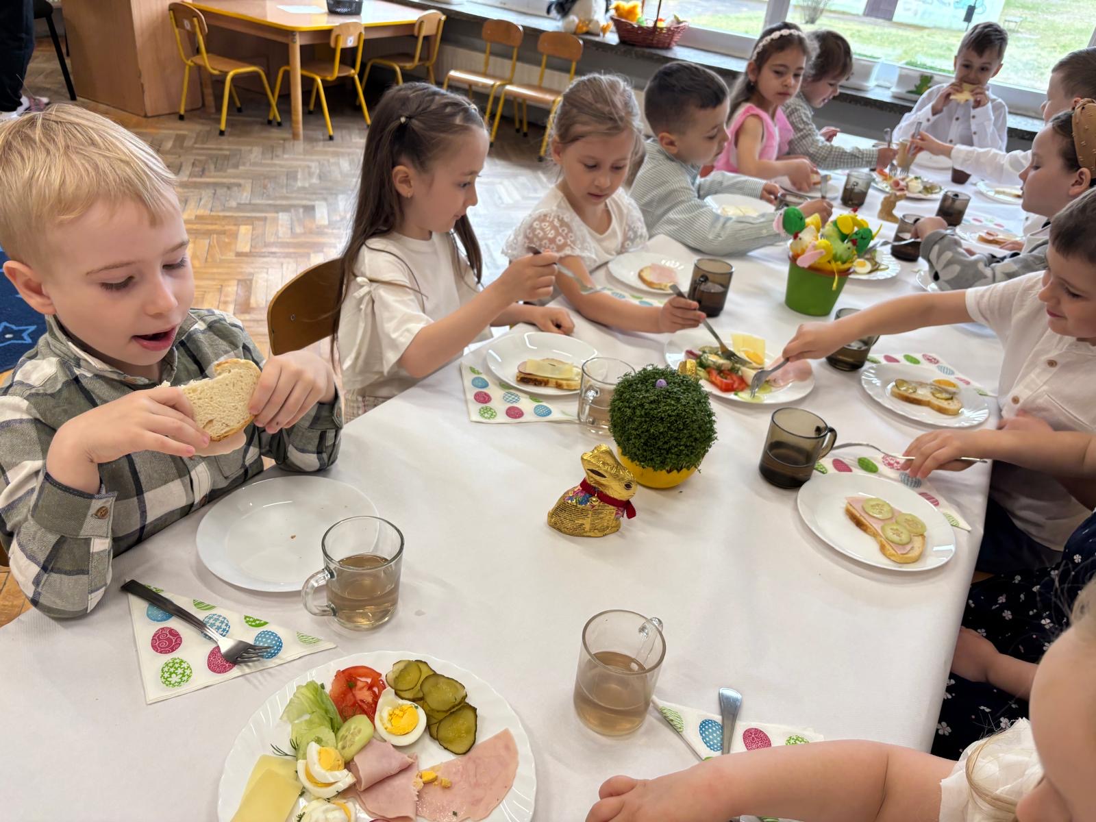 Podczas wspólnego śniadania nie zabrakło tradycyjnych potraw oraz symboli świąt, takich jak jajka czy świeże wiosenne ozdoby. Był to czas pełen uśmiechu, rozmów oraz integracji całej społeczności przedszkolnej.