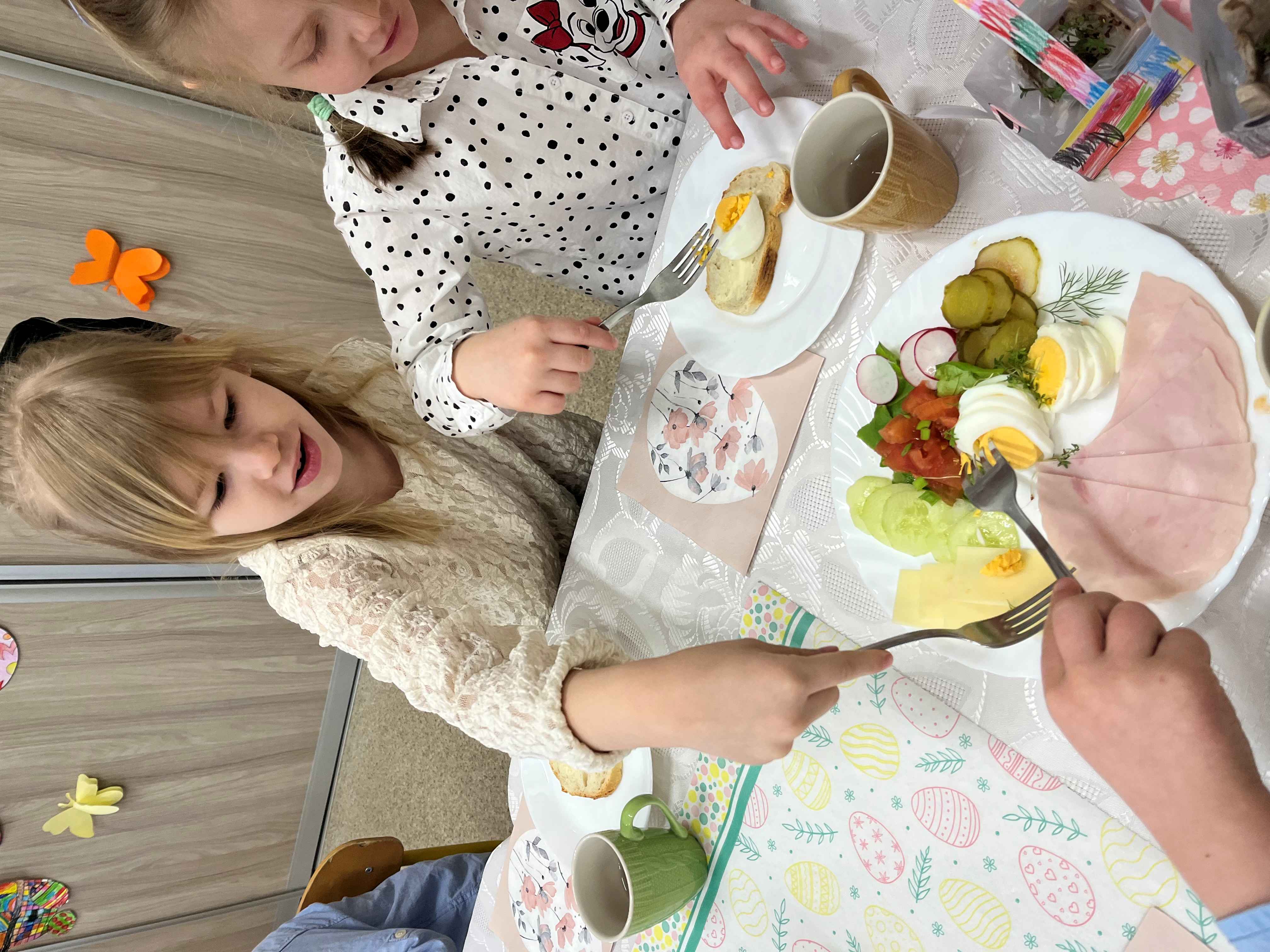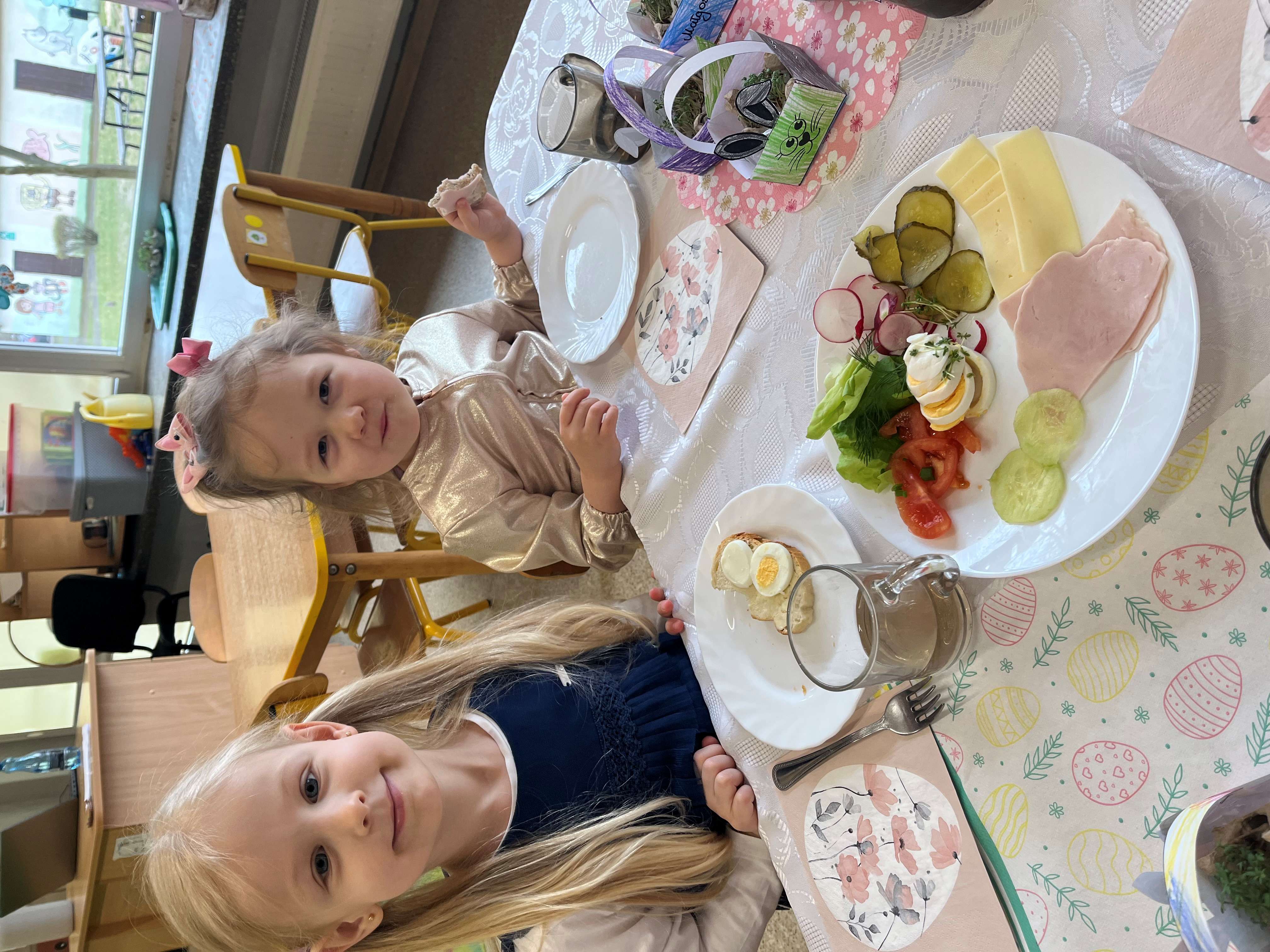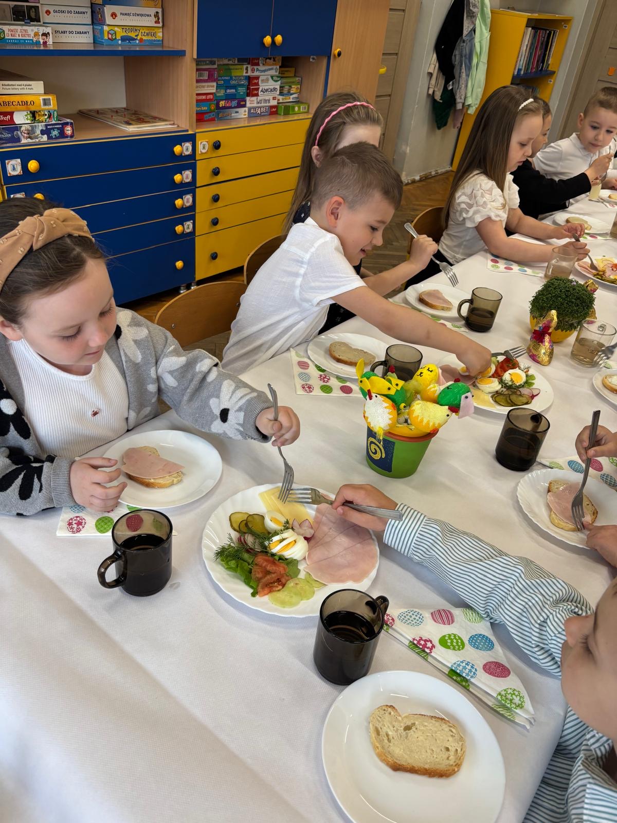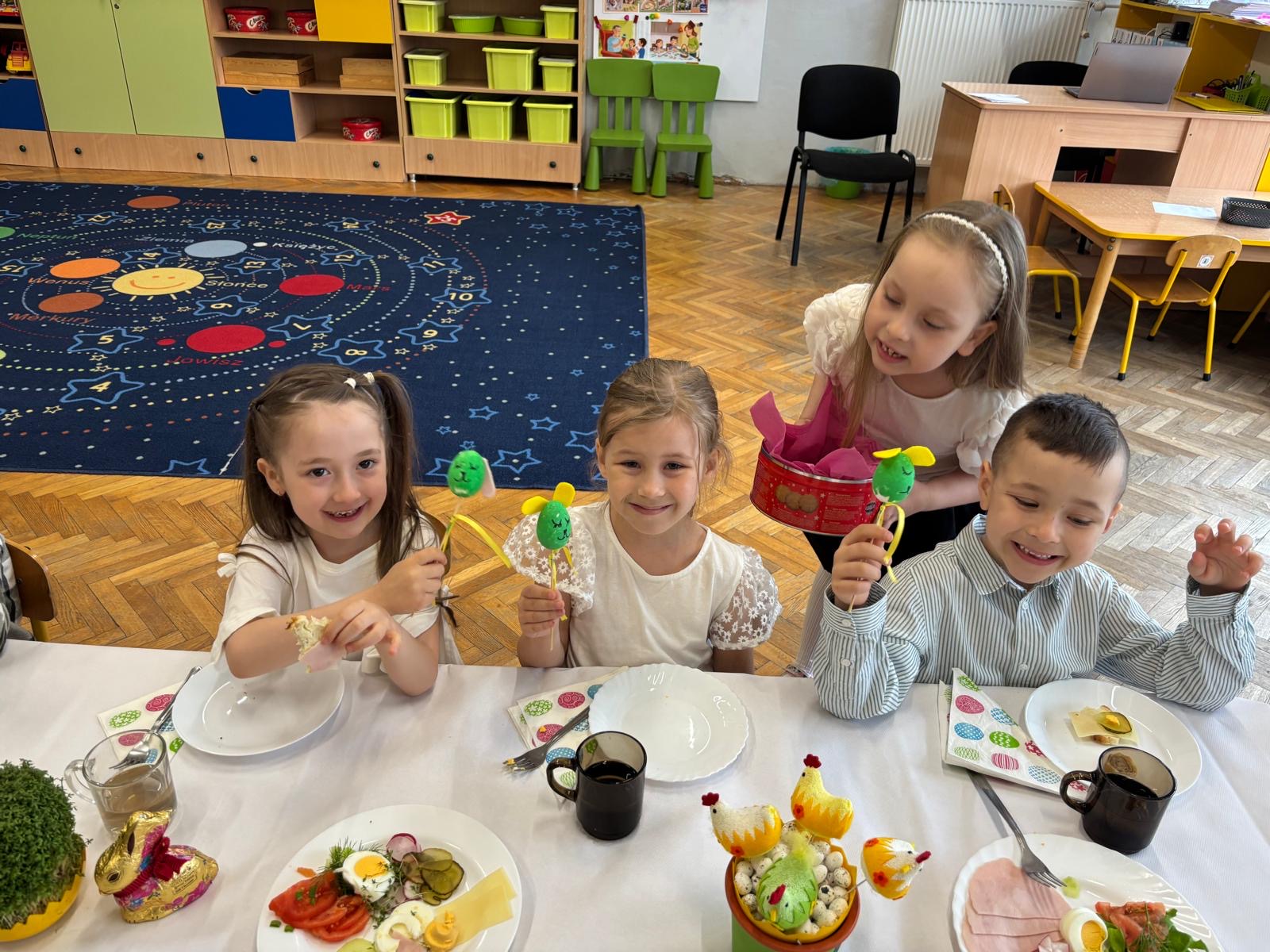 Podczas wspólnego śniadania nie zabrakło tradycyjnych potraw oraz symboli świąt, takich jak jajka czy świeże wiosenne ozdoby. Był to czas pełen uśmiechu, rozmów oraz integracji całej społeczności przedszkolnej.