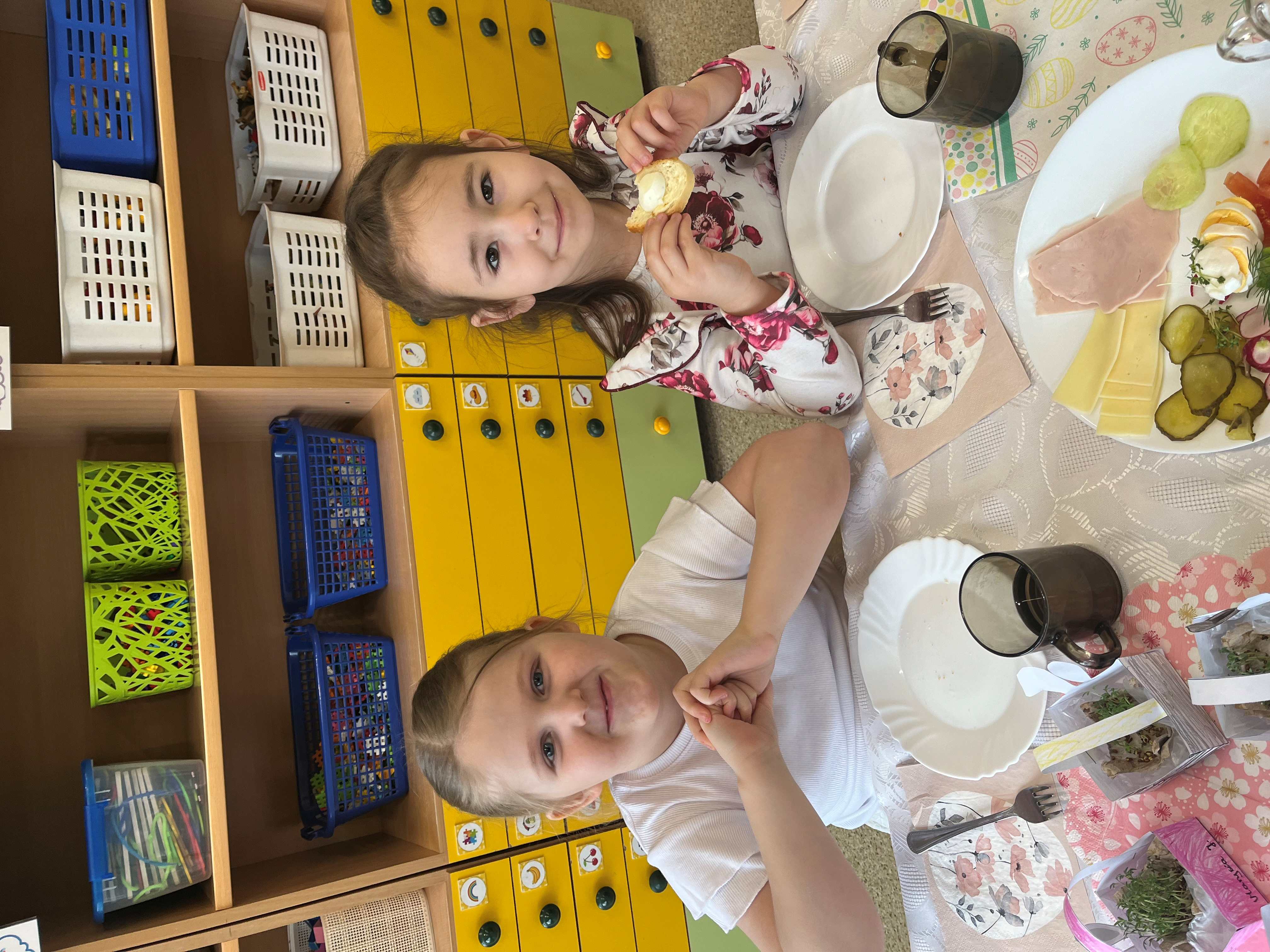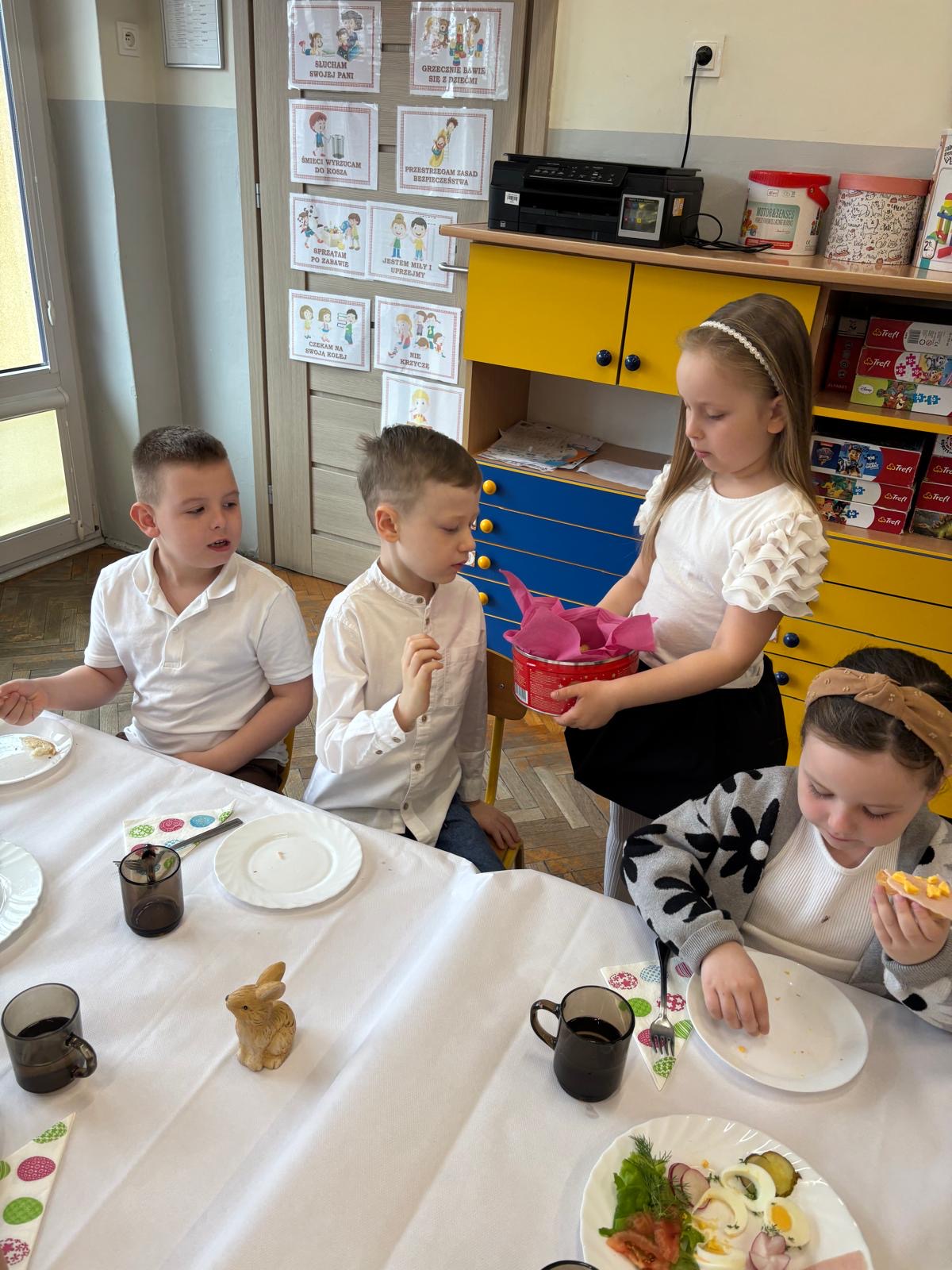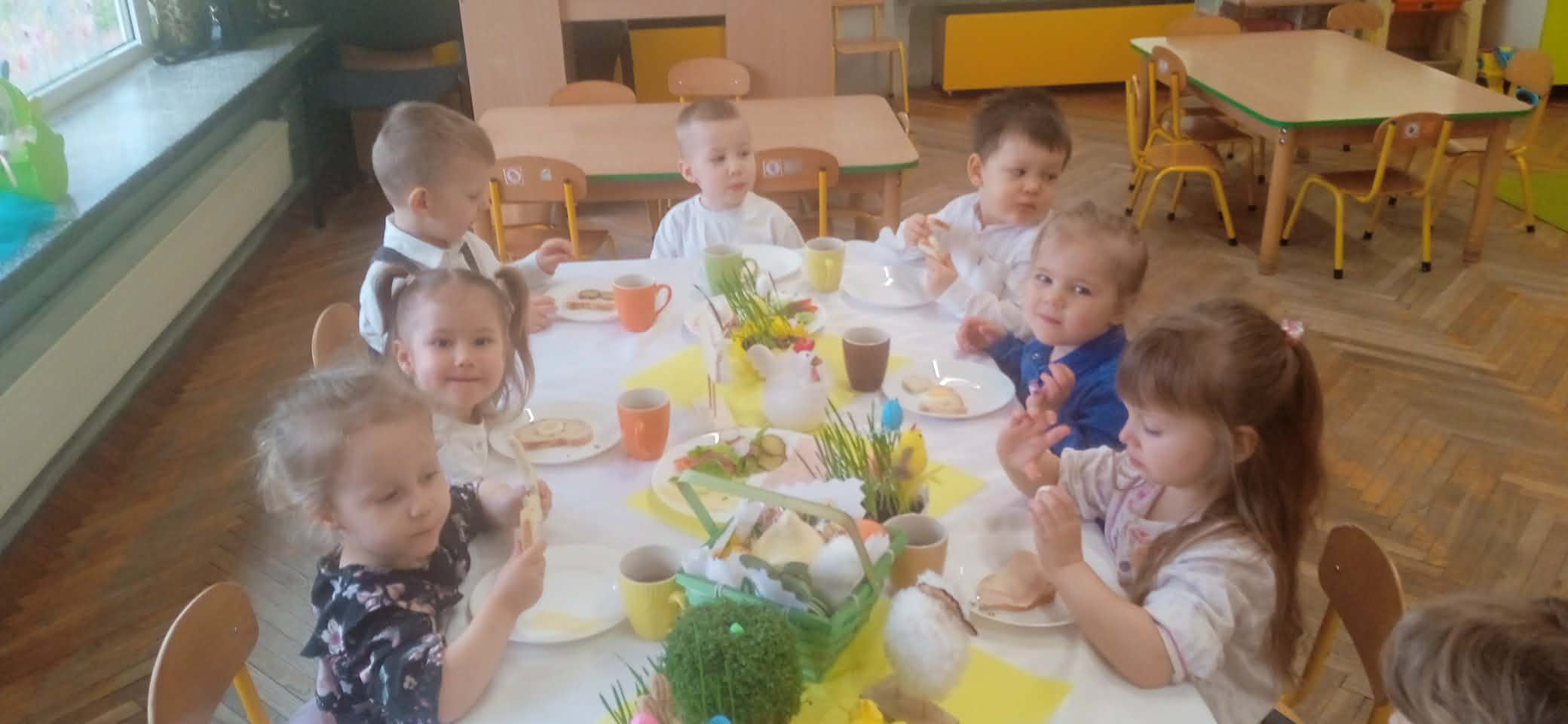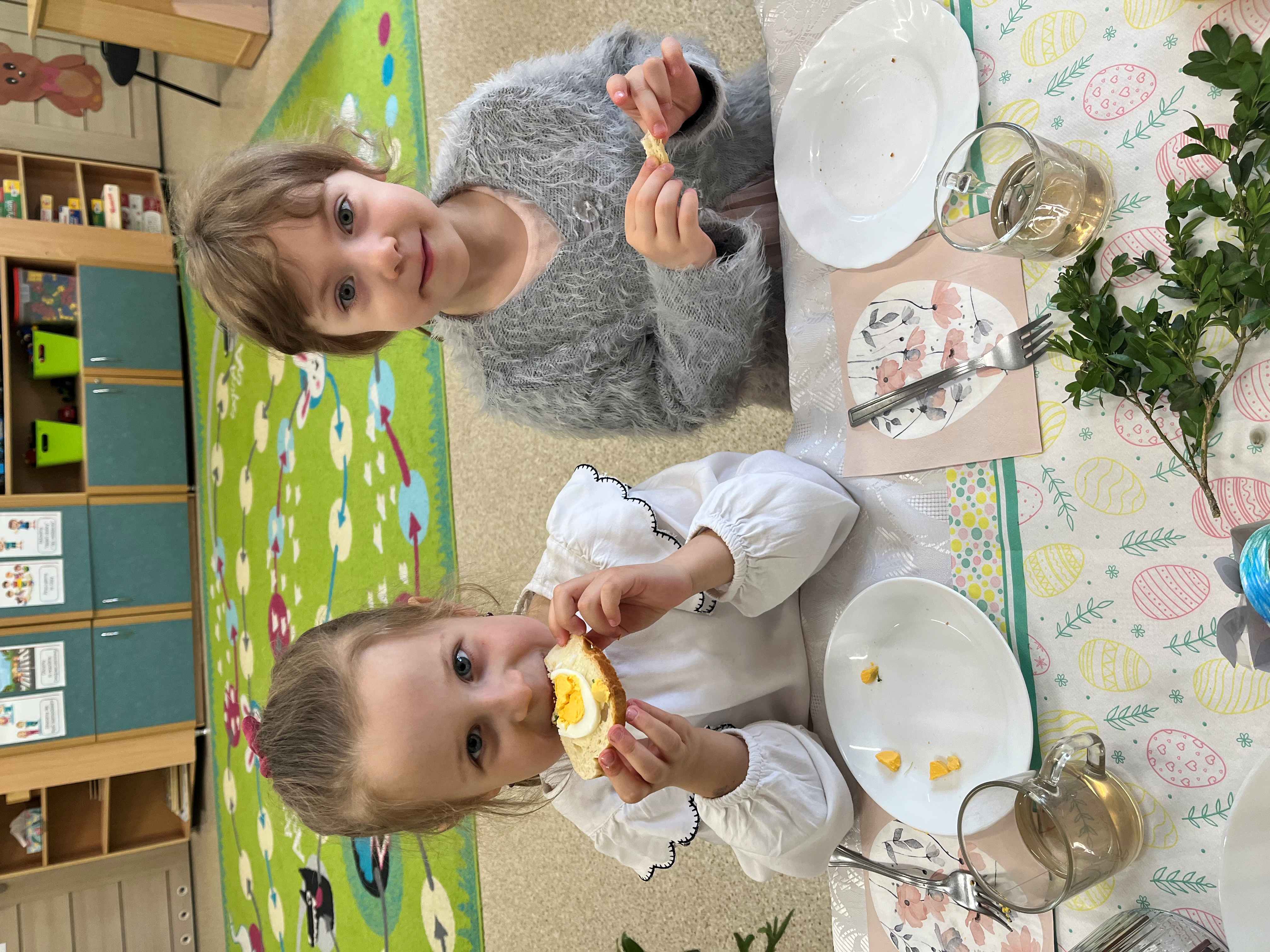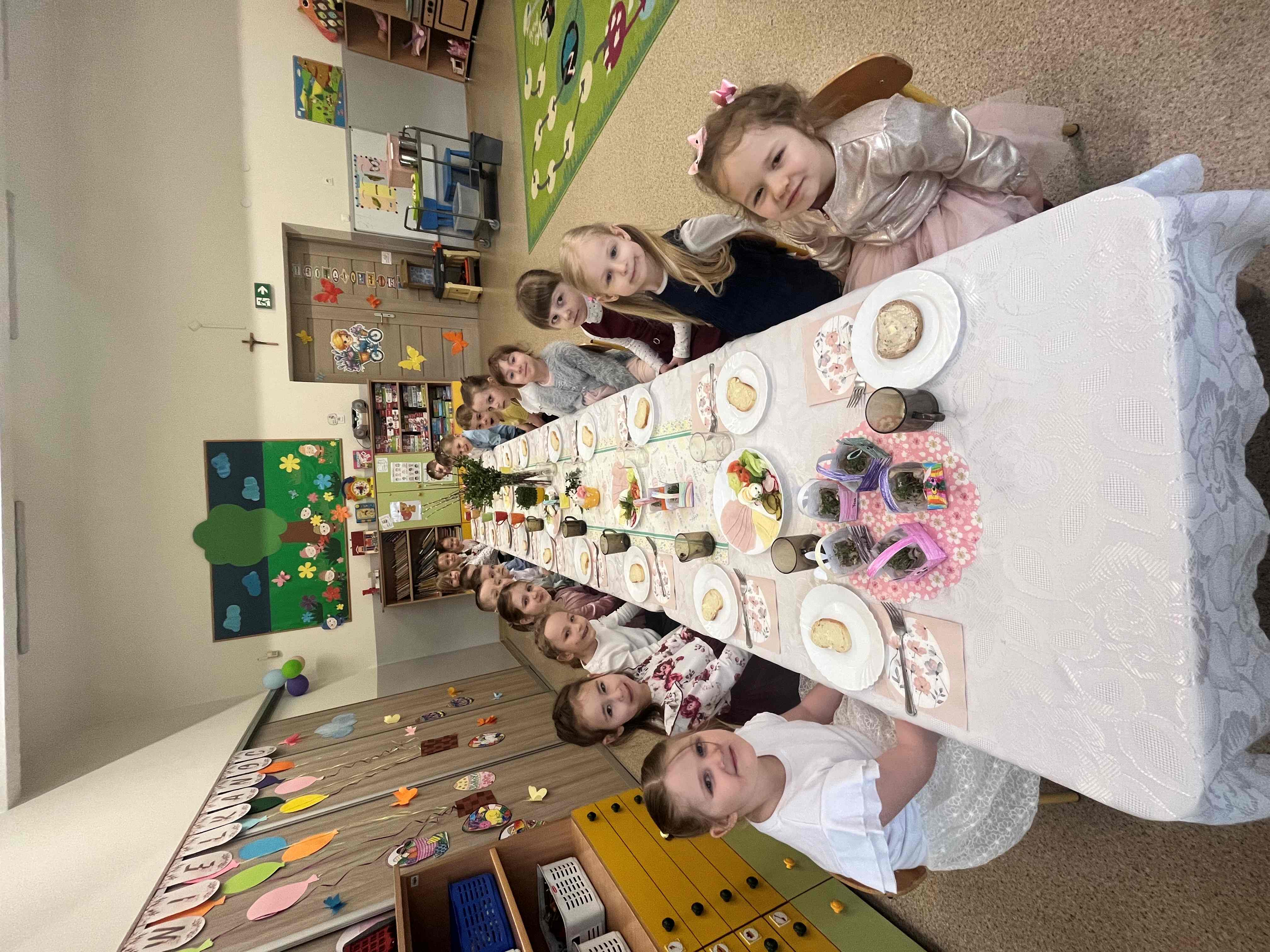 Podczas wspólnego śniadania nie zabrakło tradycyjnych potraw oraz symboli świąt, takich jak jajka czy świeże wiosenne ozdoby. Był to czas pełen uśmiechu, rozmów oraz integracji całej społeczności przedszkolnej.