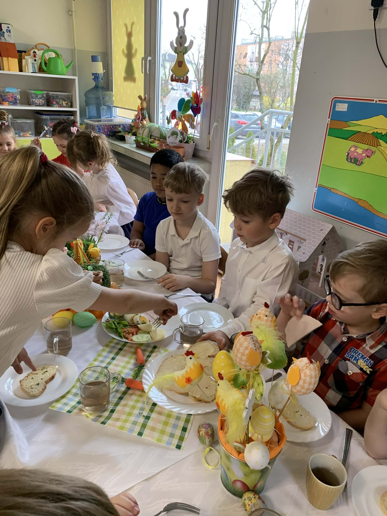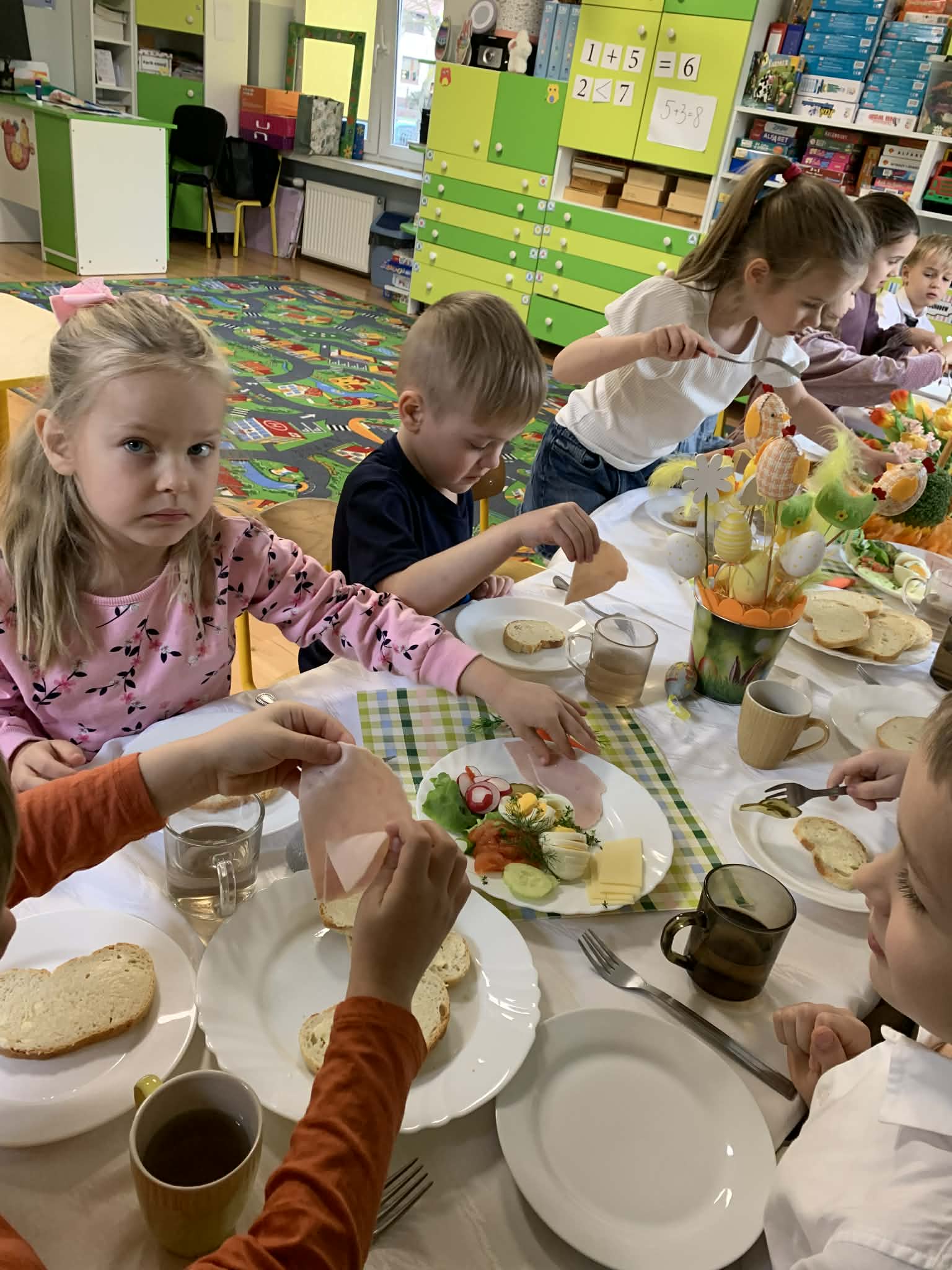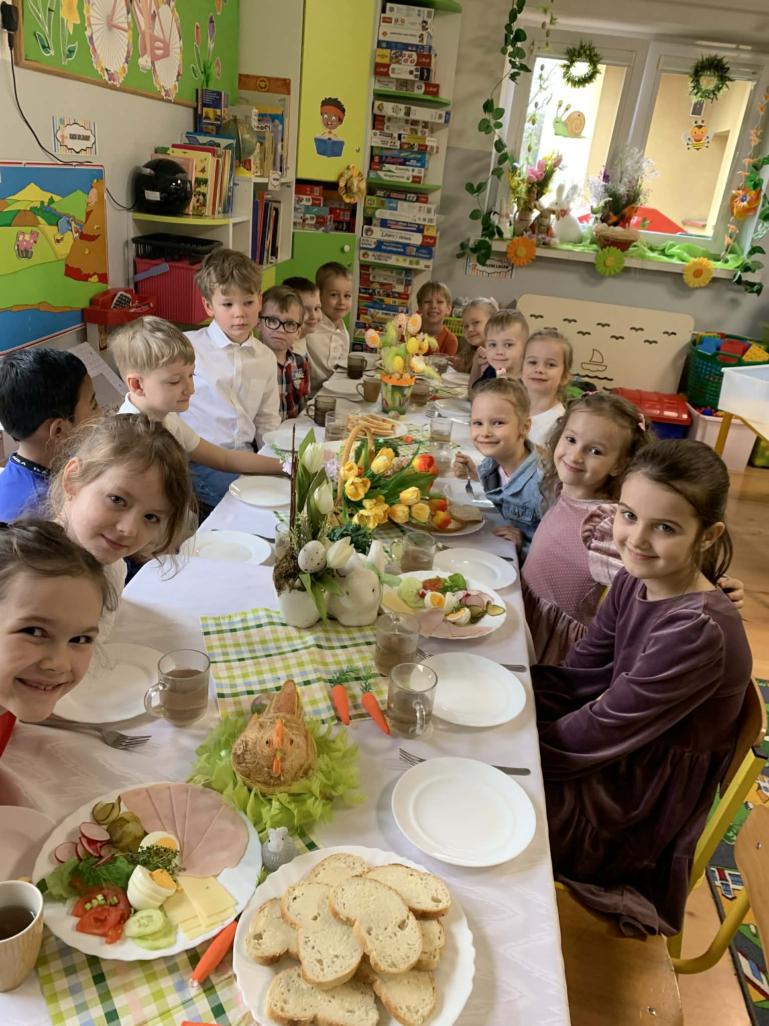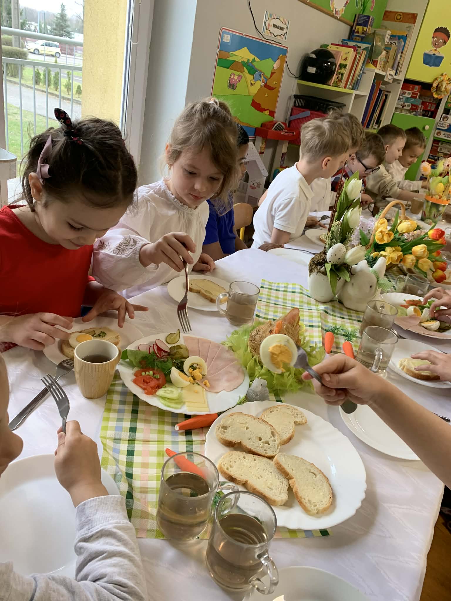 Podczas wspólnego śniadania nie zabrakło tradycyjnych potraw oraz symboli świąt, takich jak jajka czy świeże wiosenne ozdoby. Był to czas pełen uśmiechu, rozmów oraz integracji całej społeczności przedszkolnej.