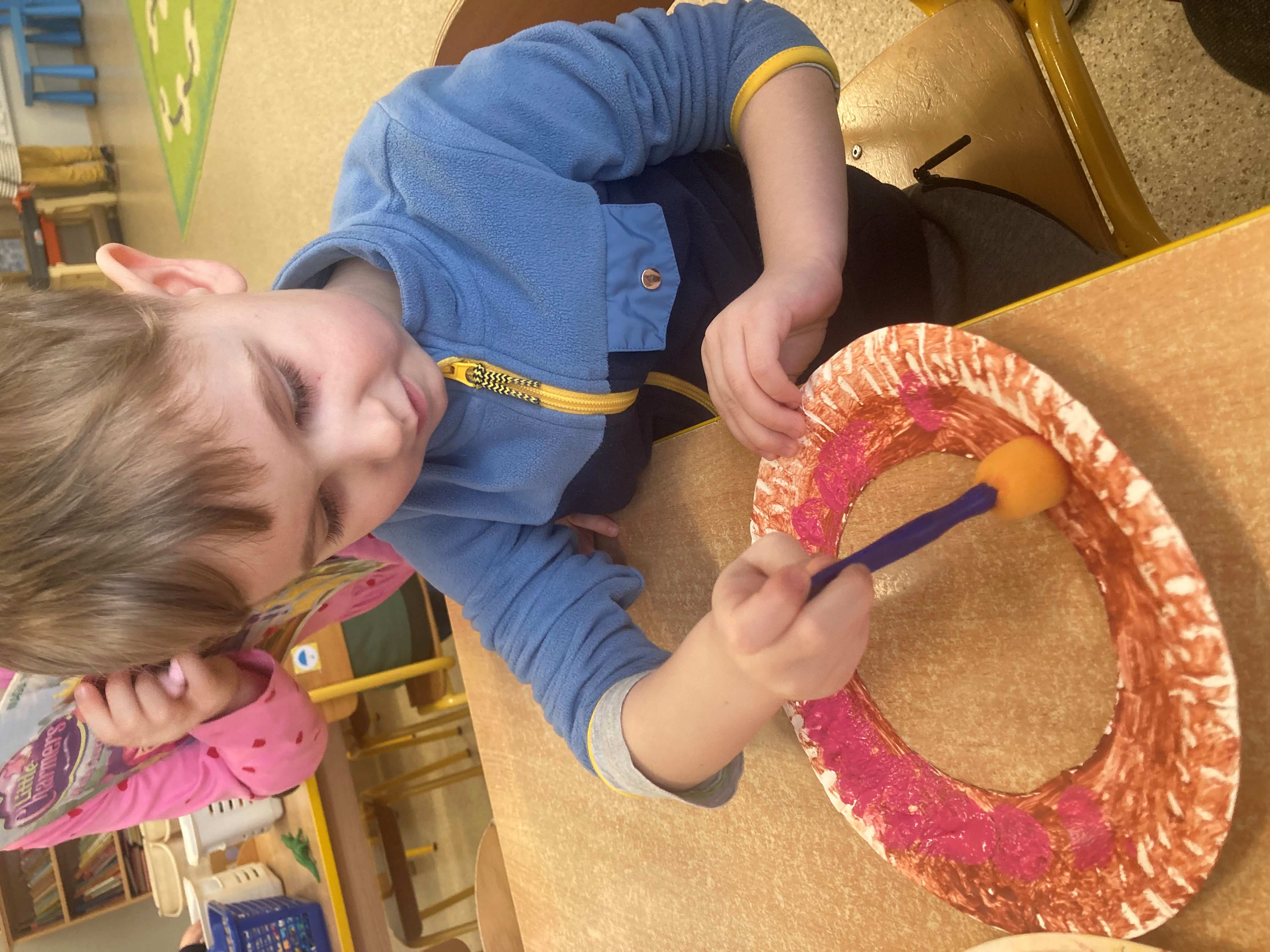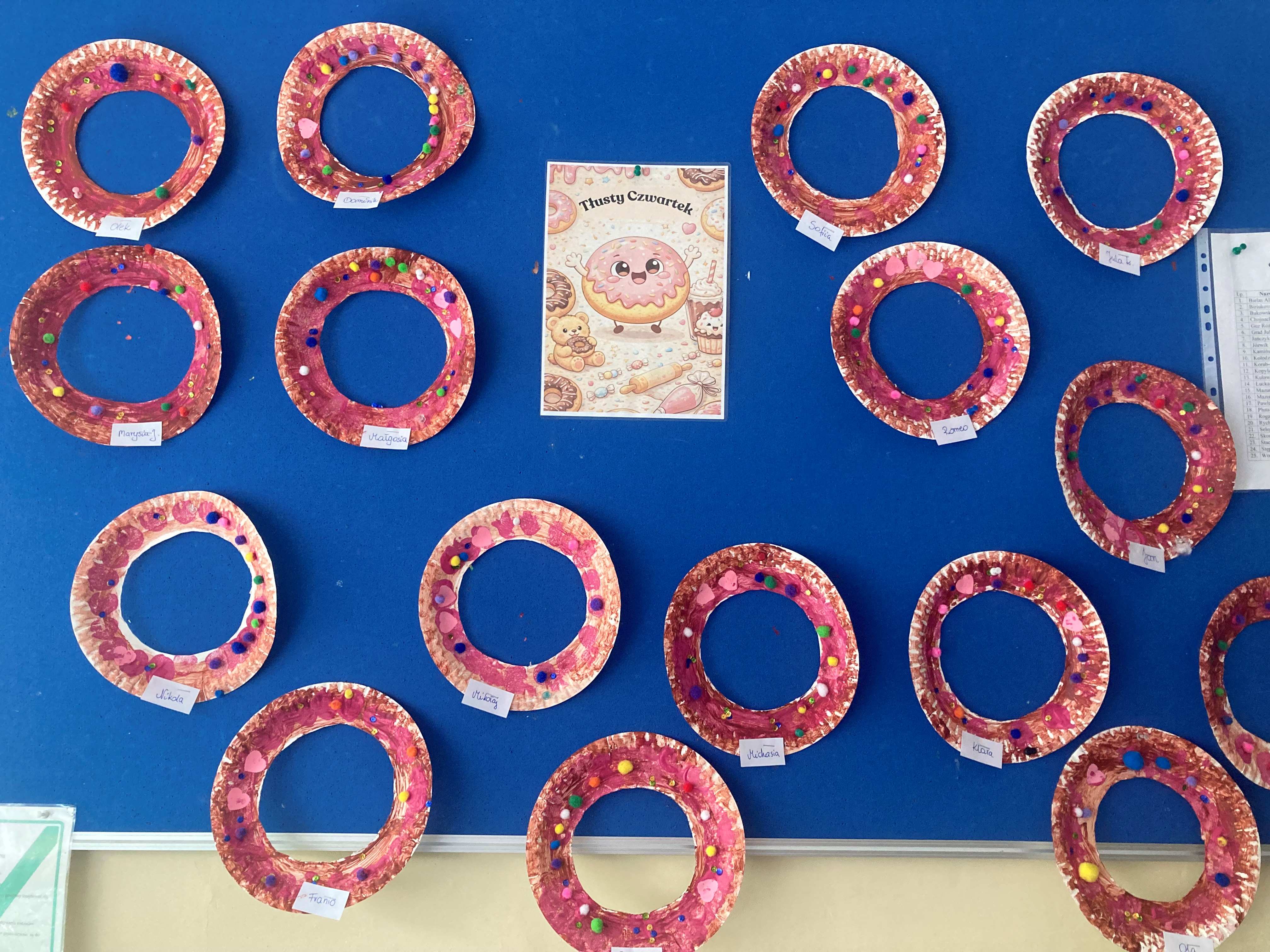 Nie zabrakło także działań plastycznych. Dzieci wykonały własne, piękne i „słodkie” pączki. Powstały kolorowe, kreatywne prace pełne lukru i posypek, które wyglądały naprawdę apetycznie!