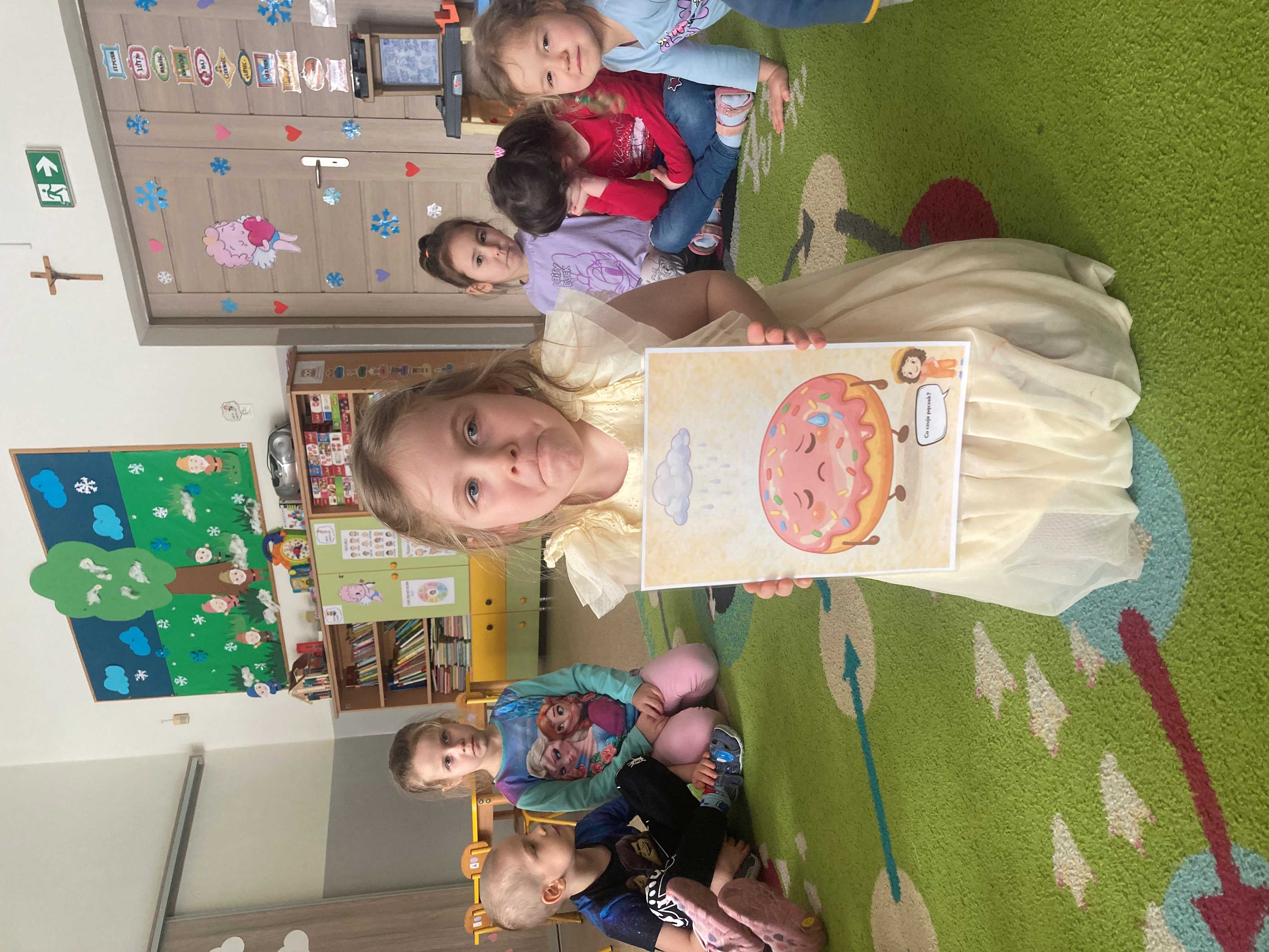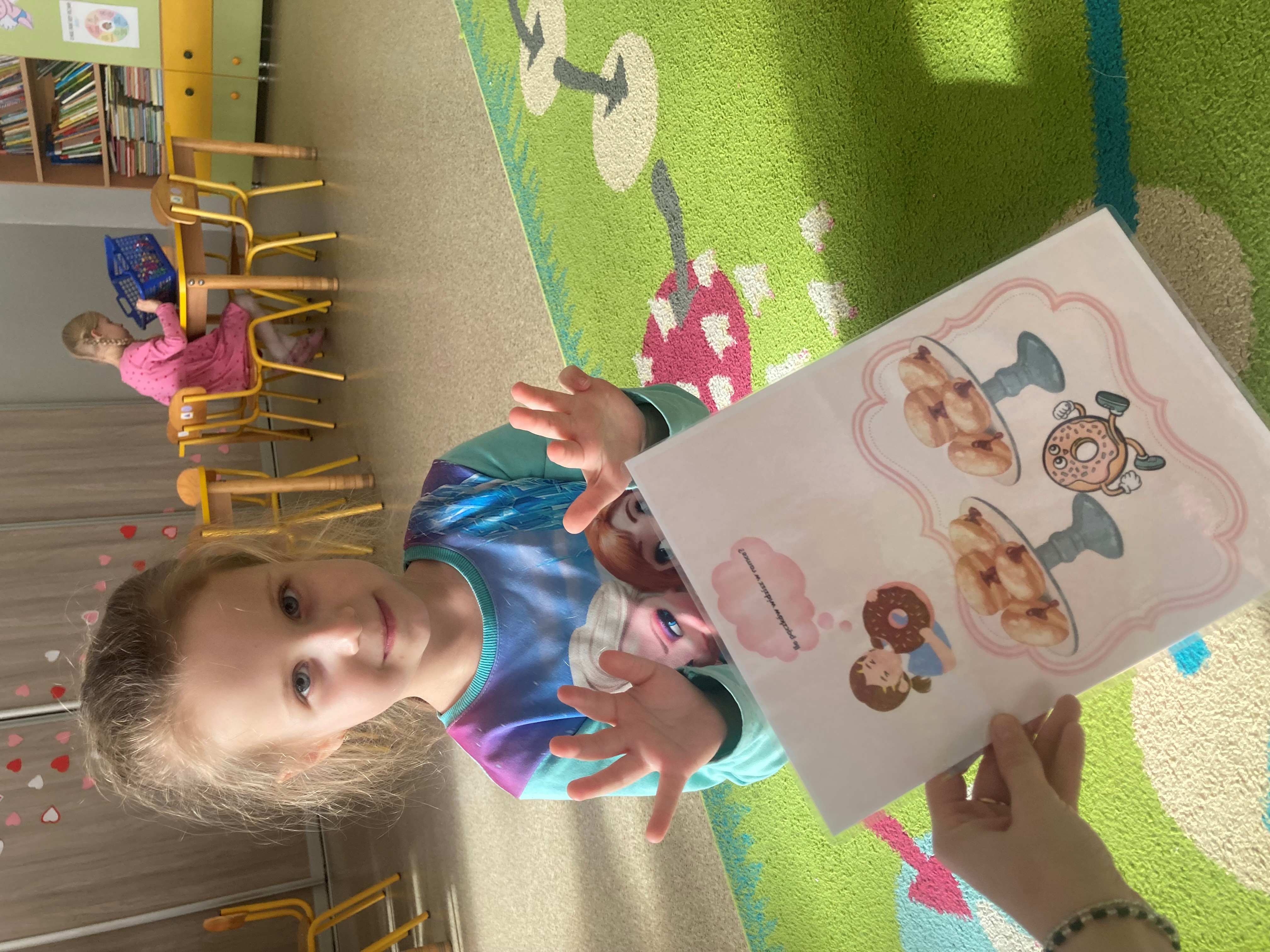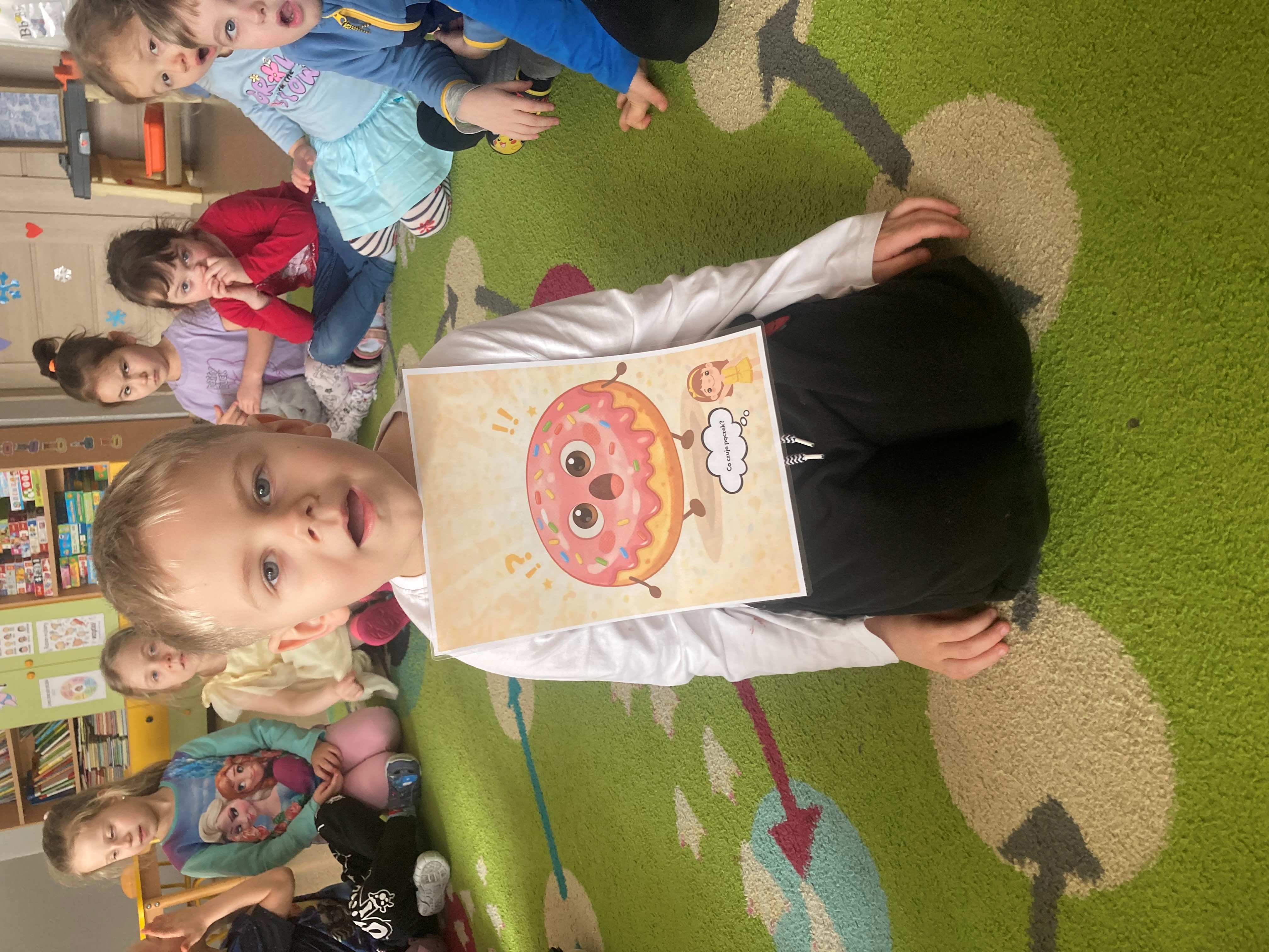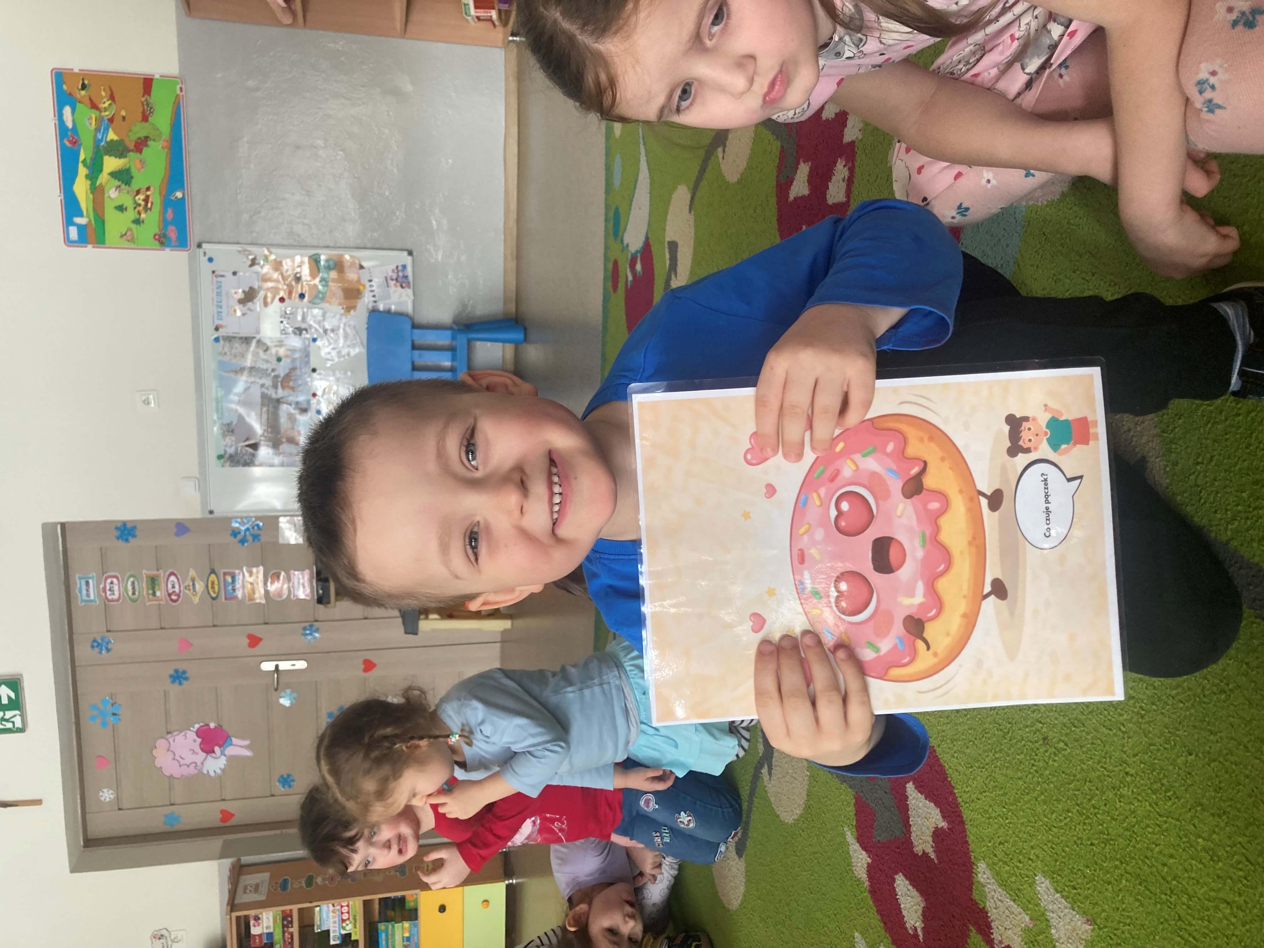 Podczas zajęć dzieci liczyły pączki, doskonaląc swoje umiejętności matematyczne. Rozmawialiśmy również o emocjach – przedszkolaki rozpoznawały i nazywały różne uczucia, które przedstawiał „pączek”, takie jak radość, smutek czy zaskoczenie.