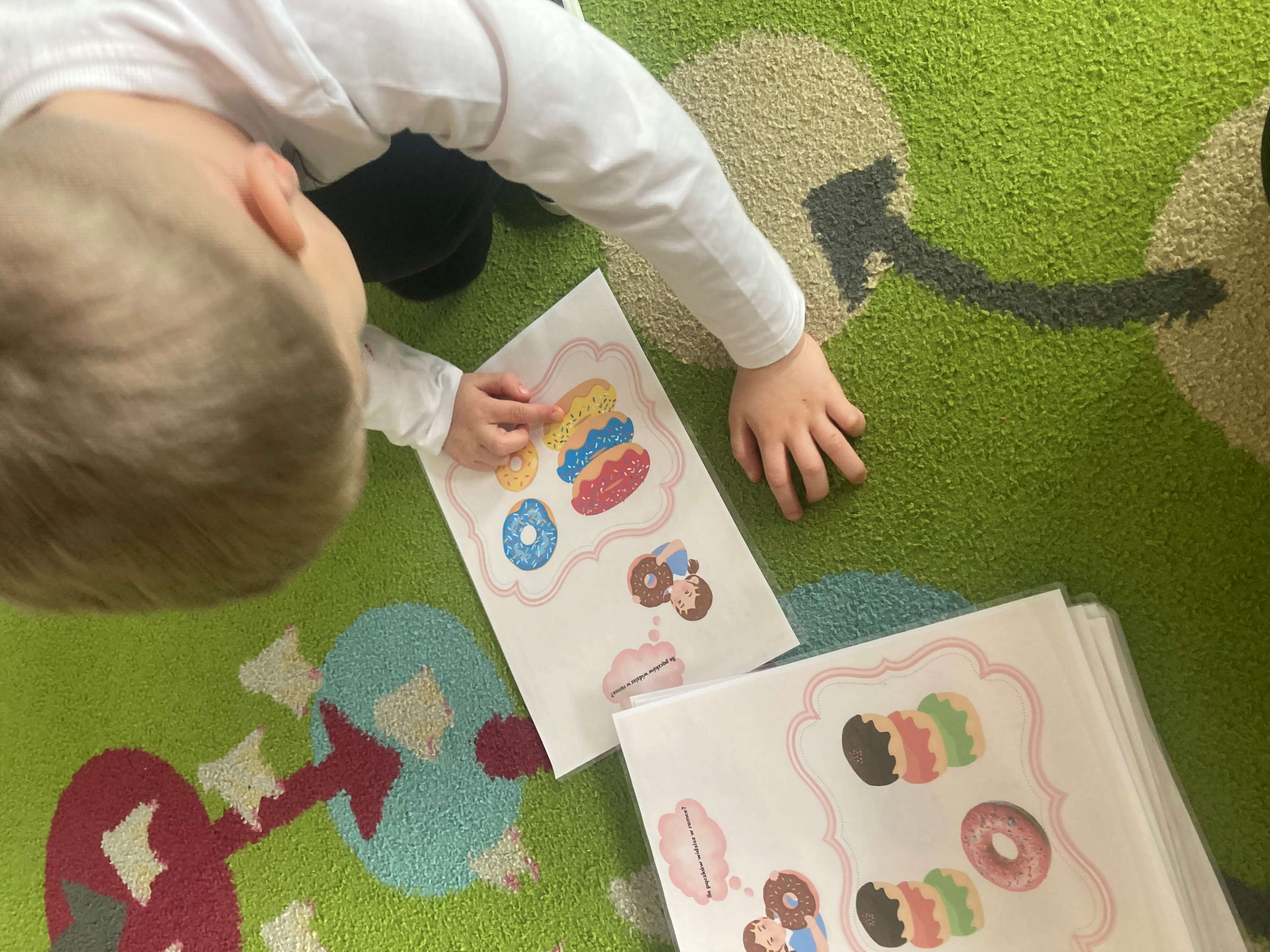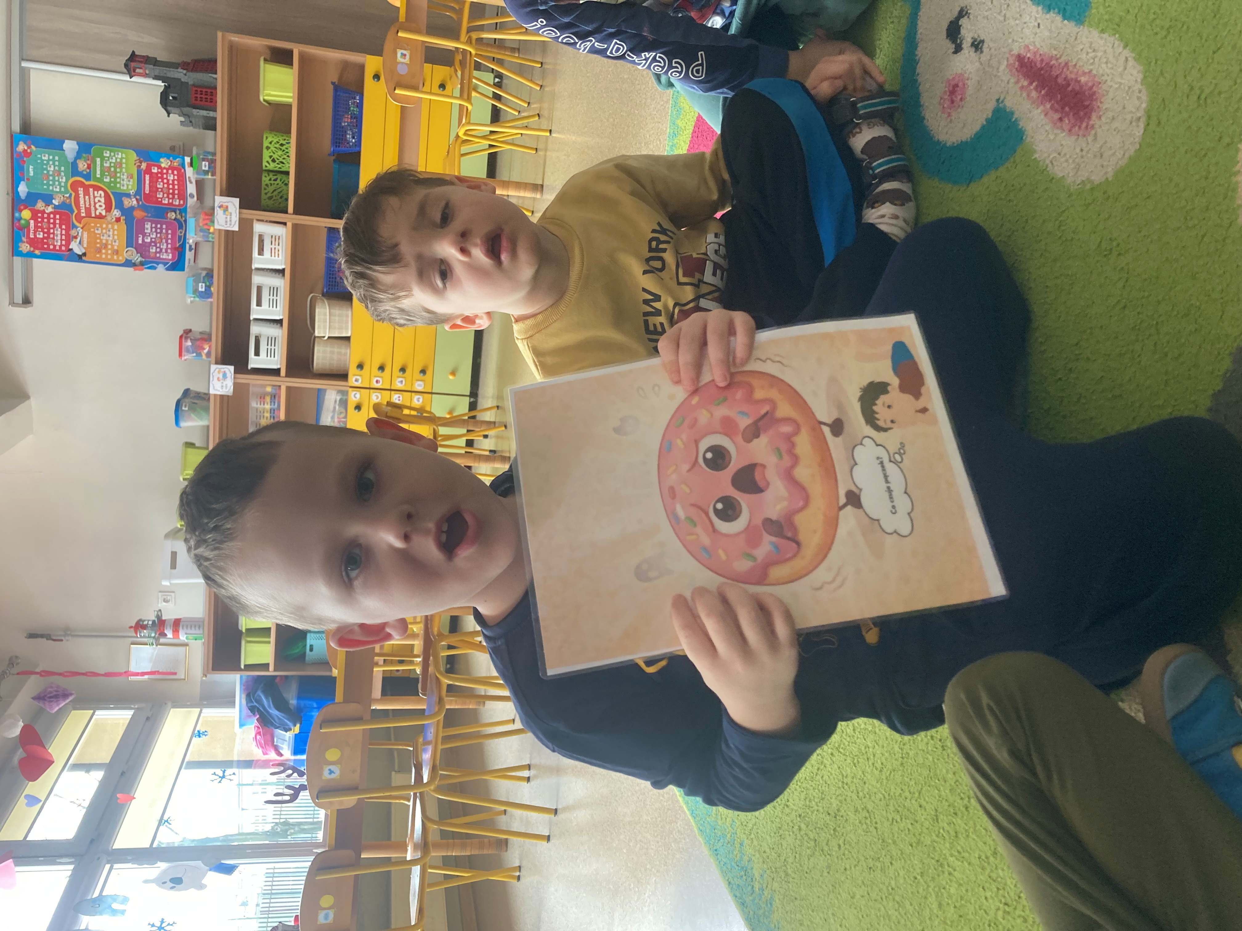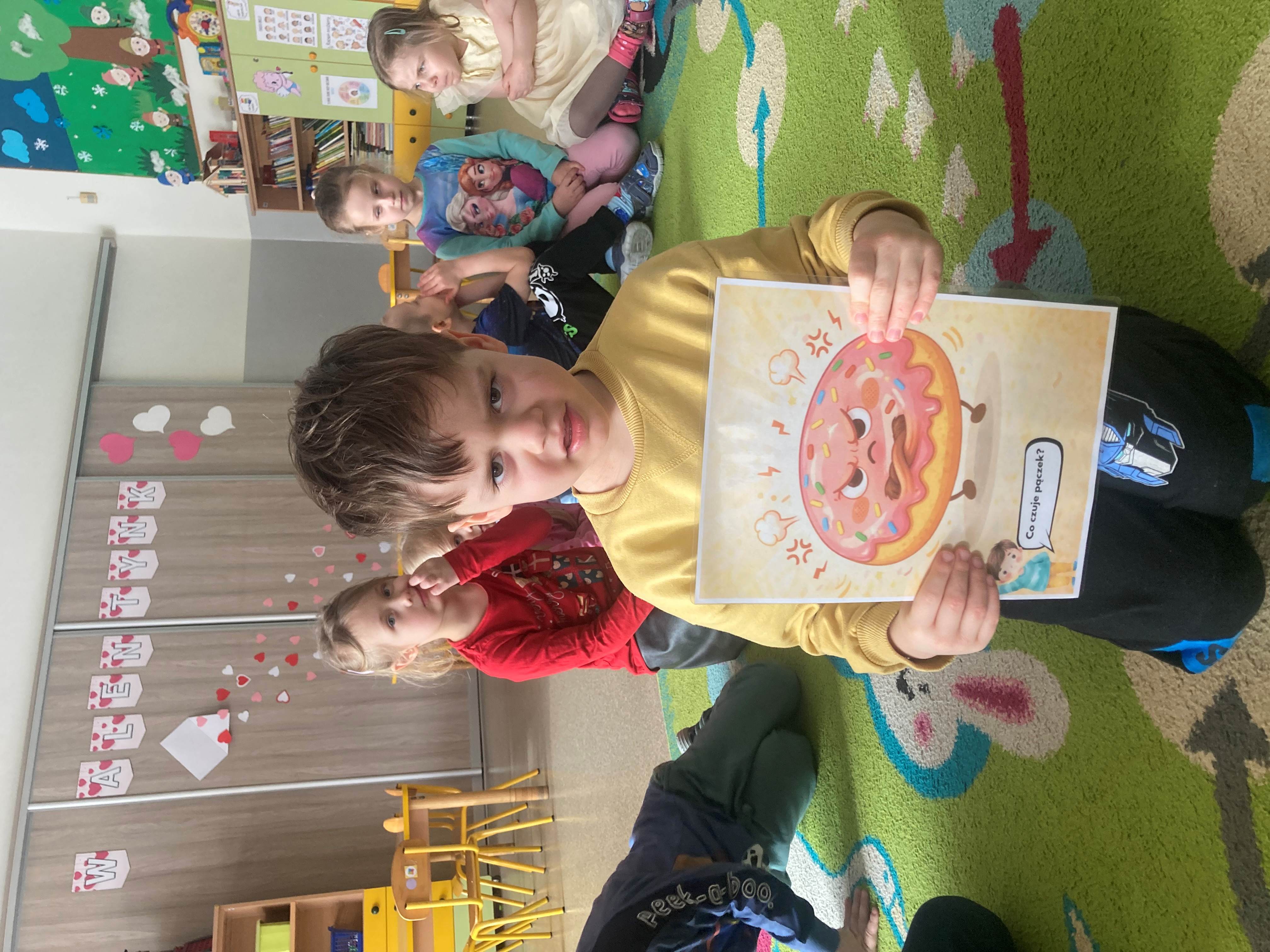 Podczas zajęć dzieci liczyły pączki, doskonaląc swoje umiejętności matematyczne. Rozmawialiśmy również o emocjach – przedszkolaki rozpoznawały i nazywały różne uczucia, które przedstawiał „pączek”, takie jak radość, smutek czy zaskoczenie.