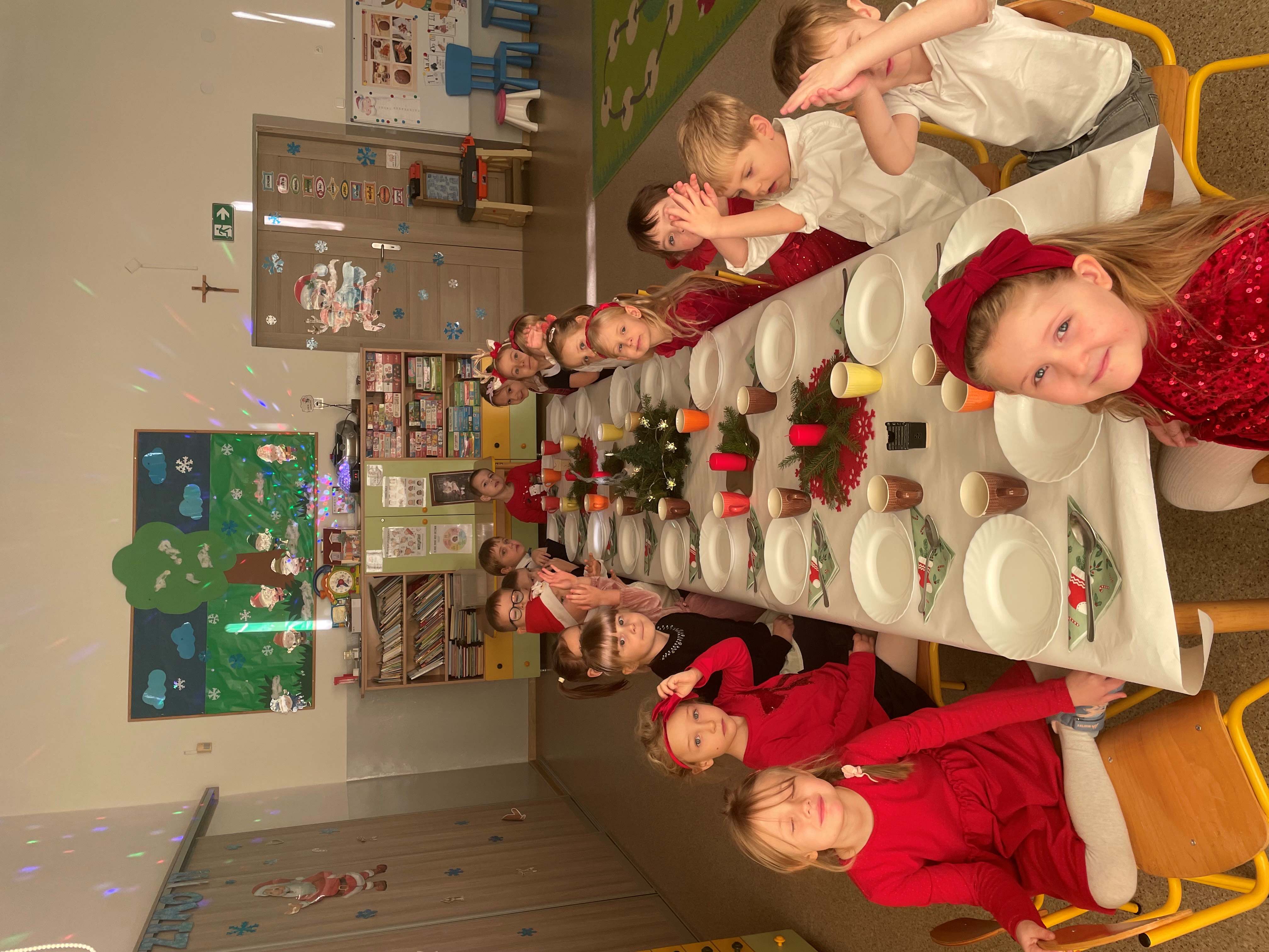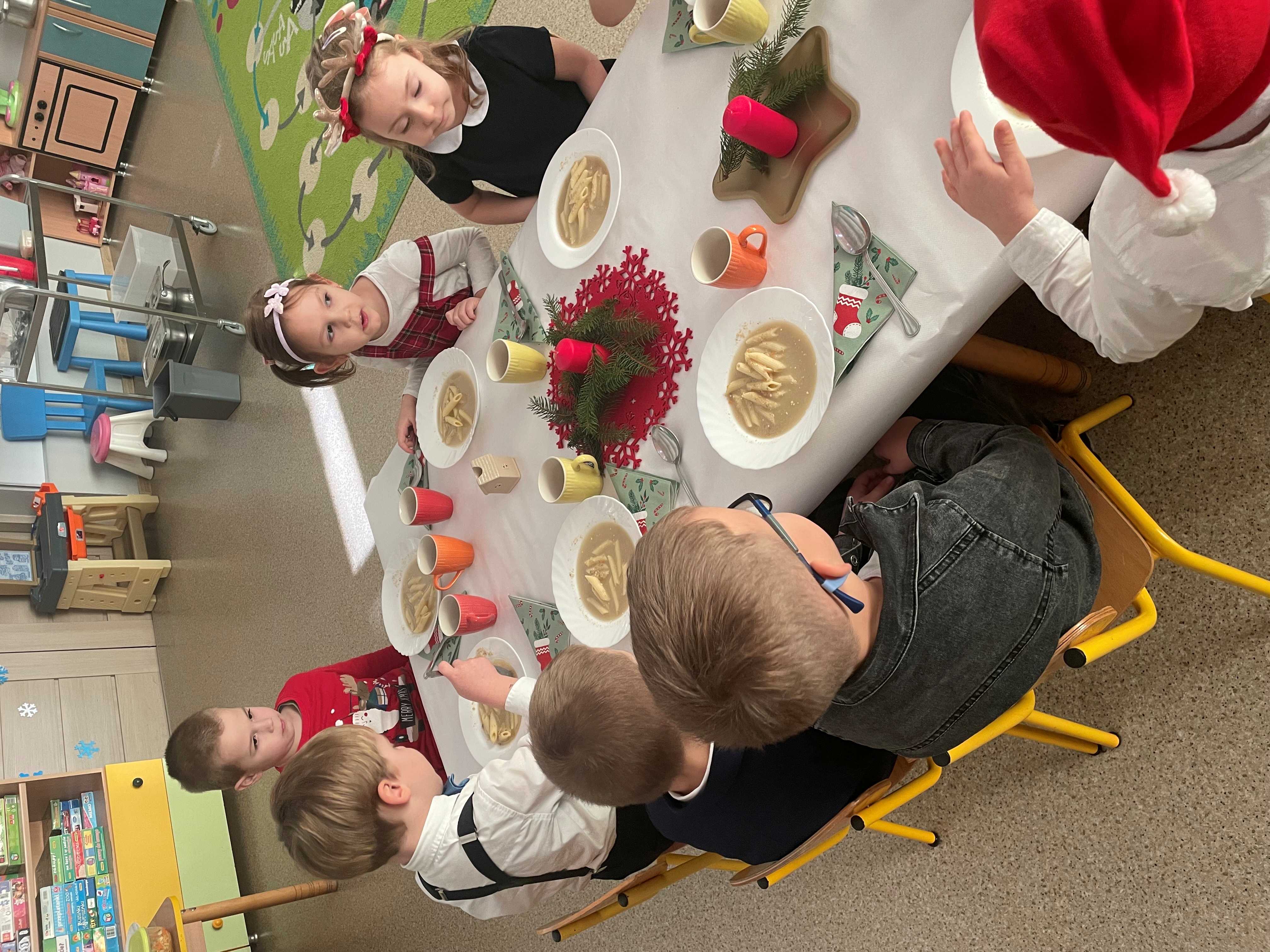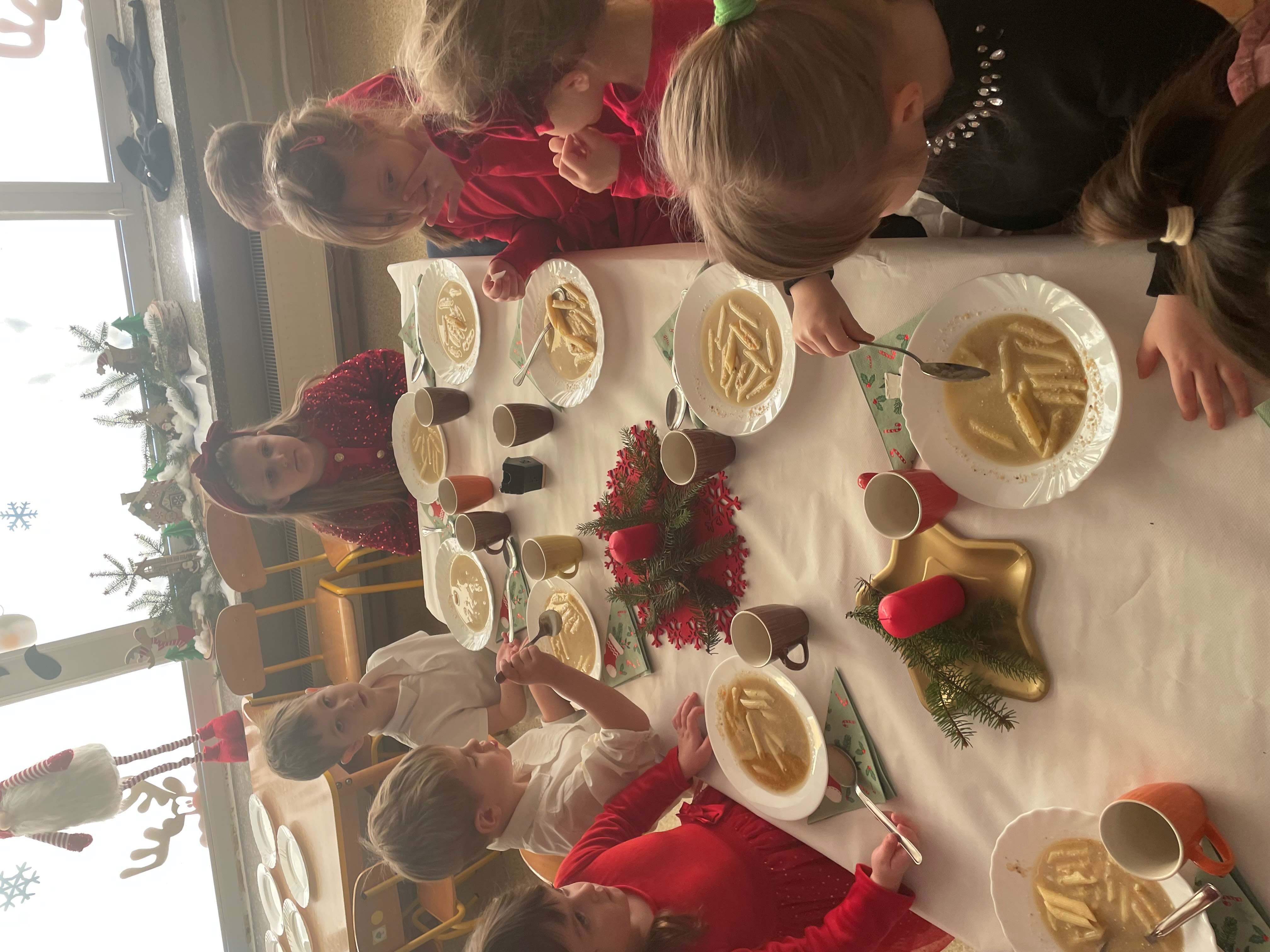 Po kolędowaniu przedszkolaki zasiadły do uroczystego obiadu bożonarodzeniowego. Pięknie udekorowane stoły oraz świąteczne potrawy wprowadziły wszystkich w podniosły, świąteczny nastrój. Wspólny posiłek był doskonałą okazją do rozmów, składania życzeń i wzmacniania więzi między dziećmi.