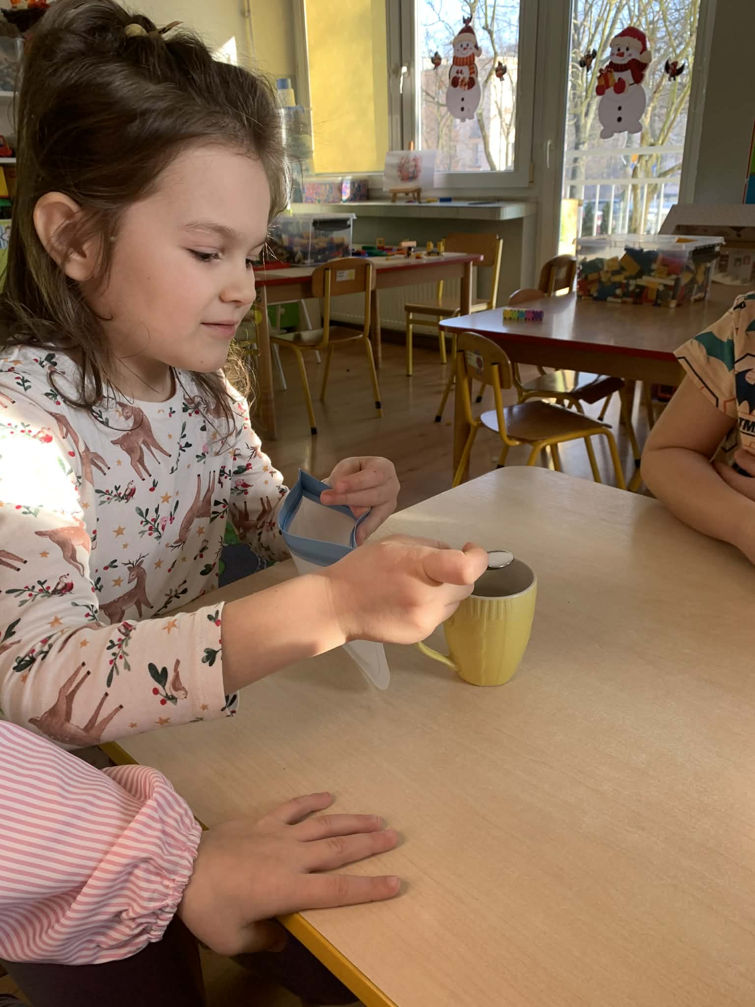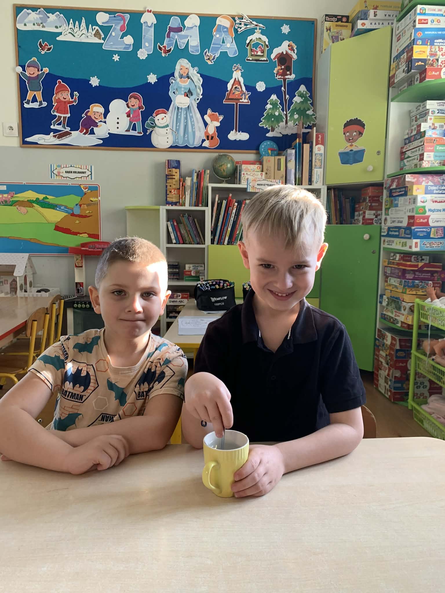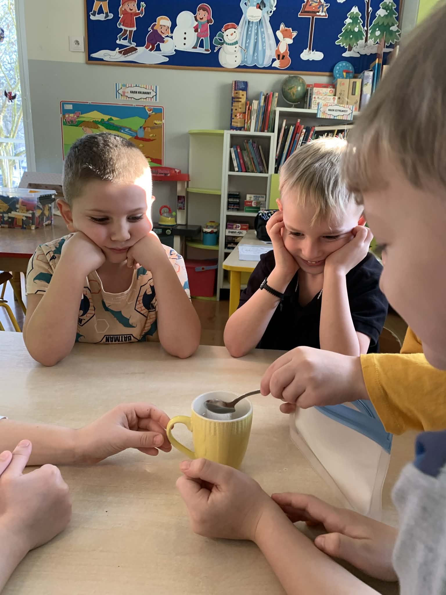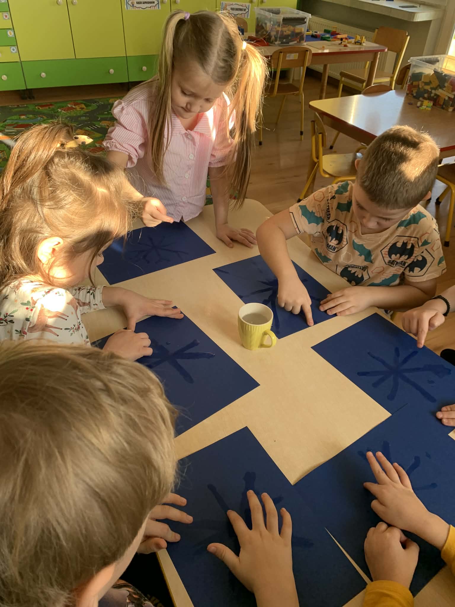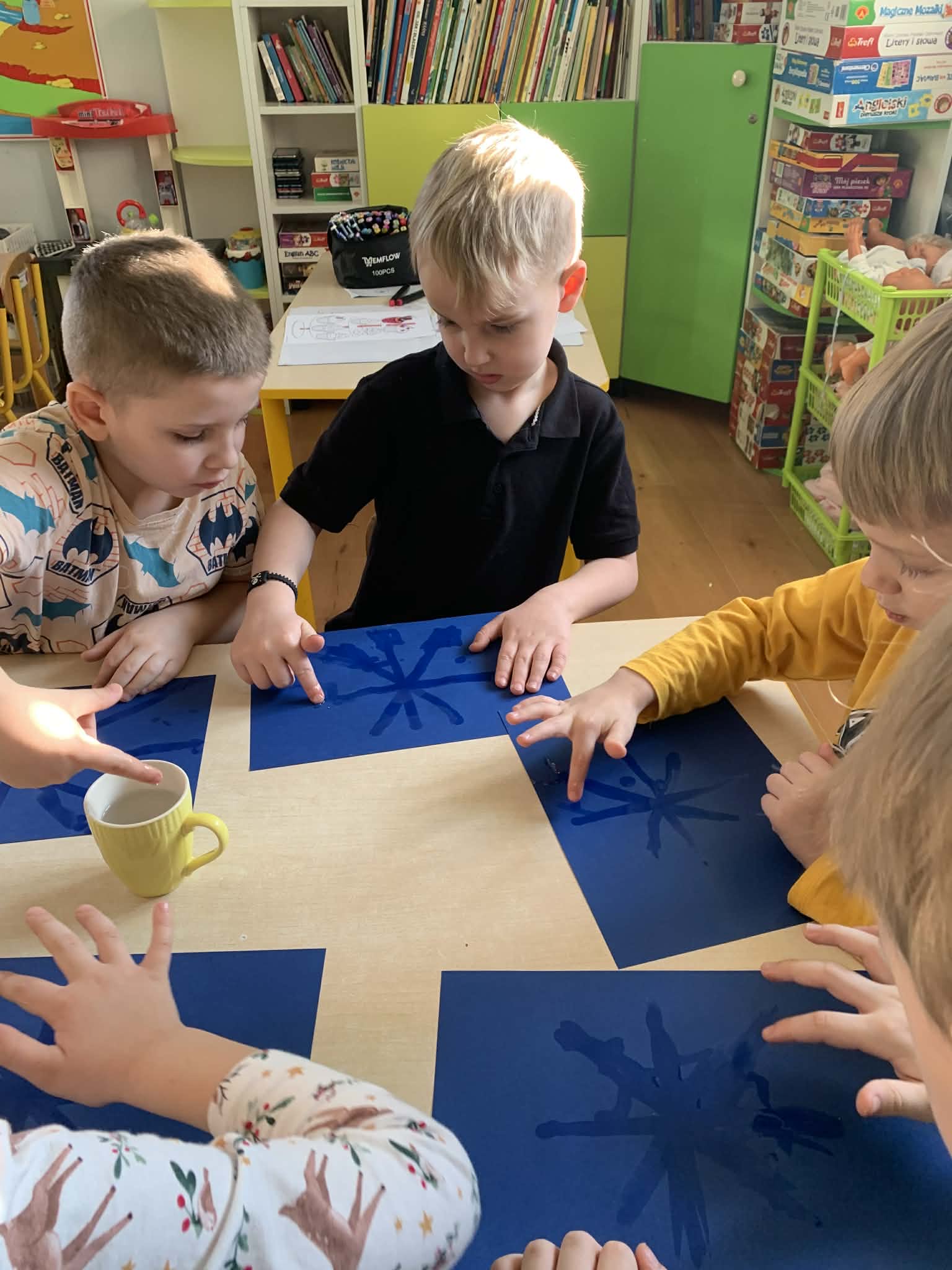 Zajęcia w łazience, gdzie może być ciemno- czemu nie? Dzieci z grupy Wynalazców szukały odpowiedzi na pytania, czy mandarynka może świecić i czy niewidzialny rysunek zyskuje po czasie brokatową biel? Wynalazcy znają już odpowiedzi na te pytania, uzyskali je w czasie przeprowadzanych zimowych eksperymentów.