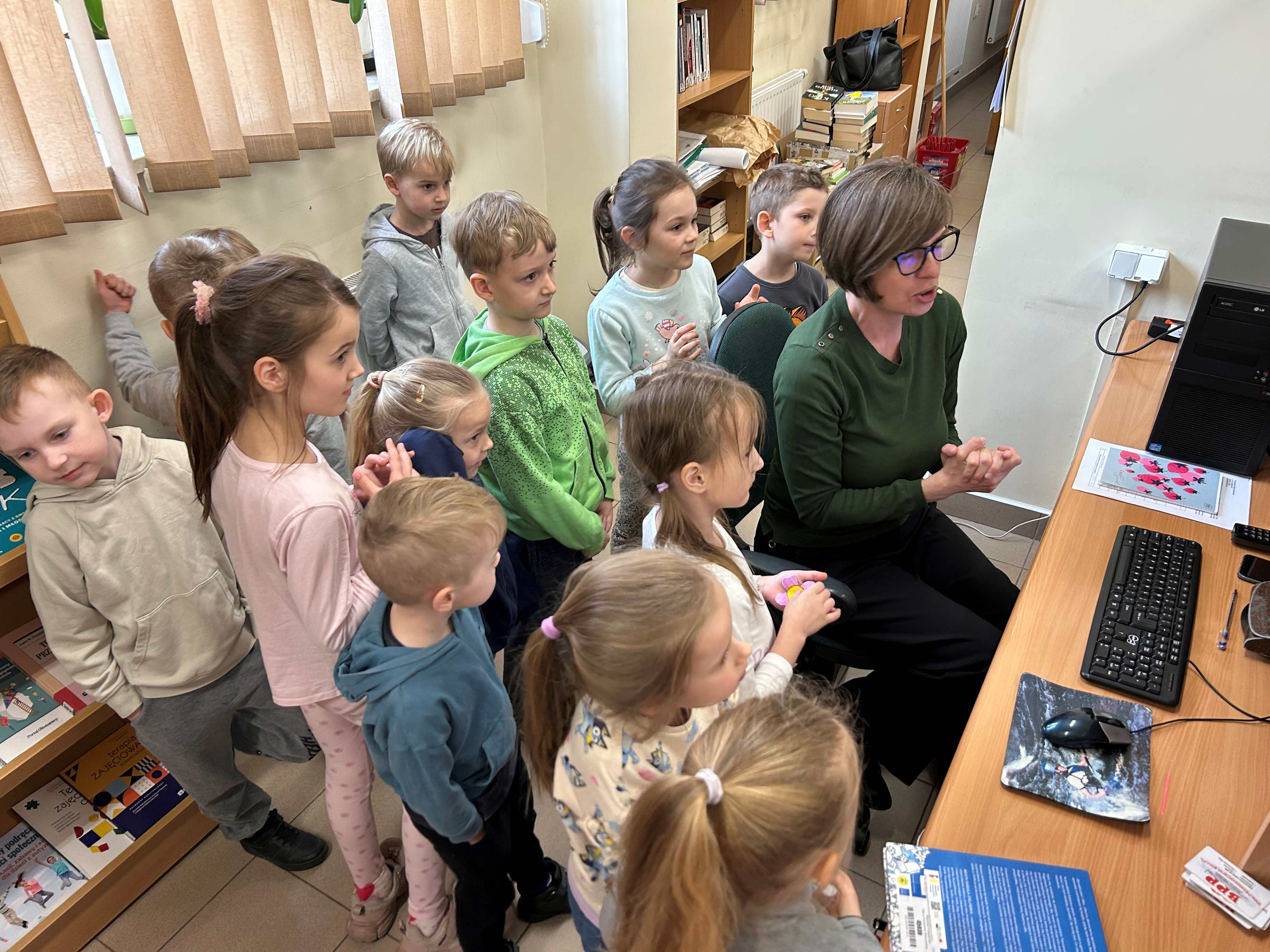 czy dział dla dzieci. Bibliotekarz opowiedział dzieciom o swojej pracy, wyjaśniał, na