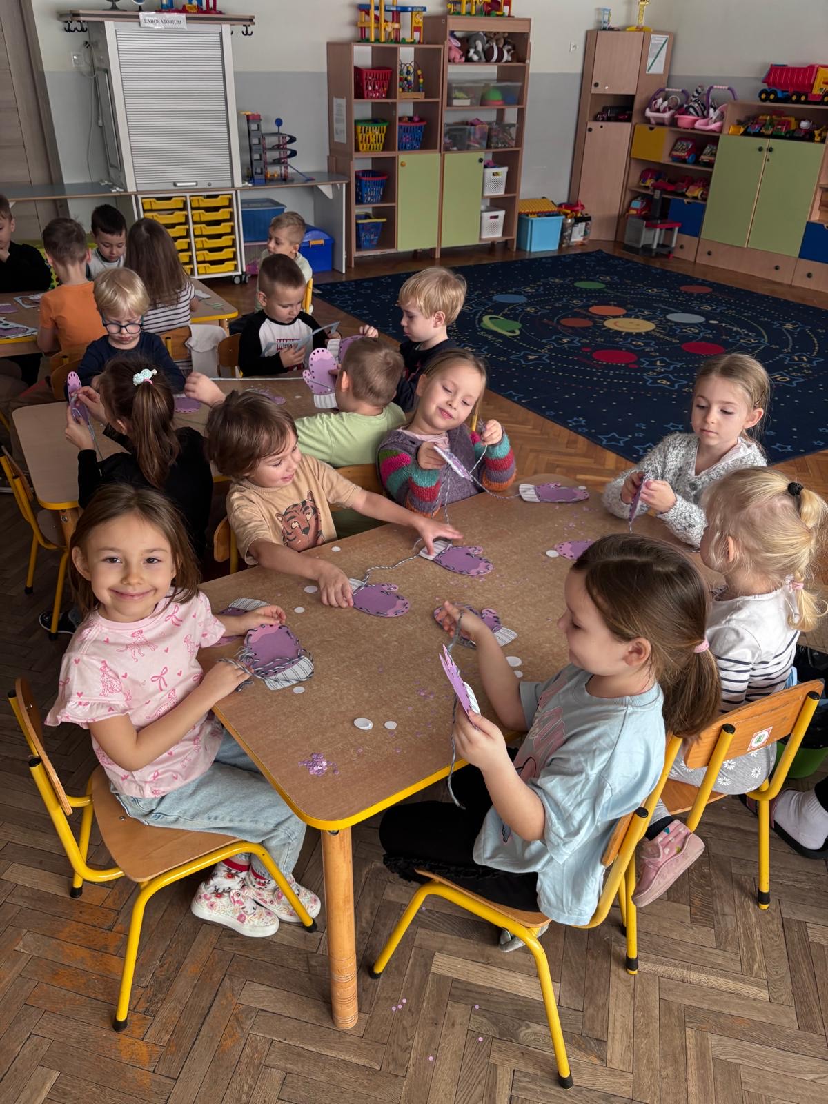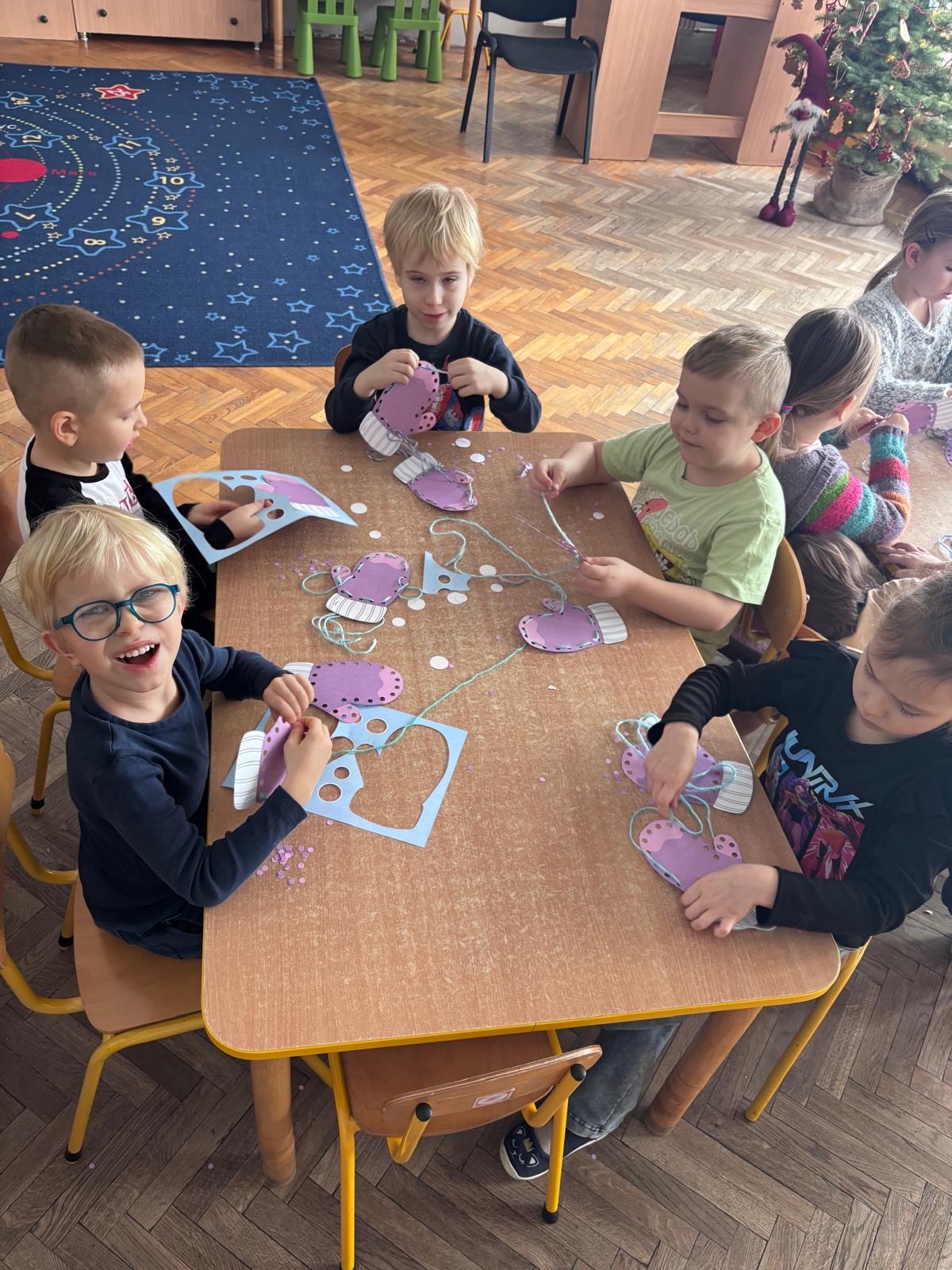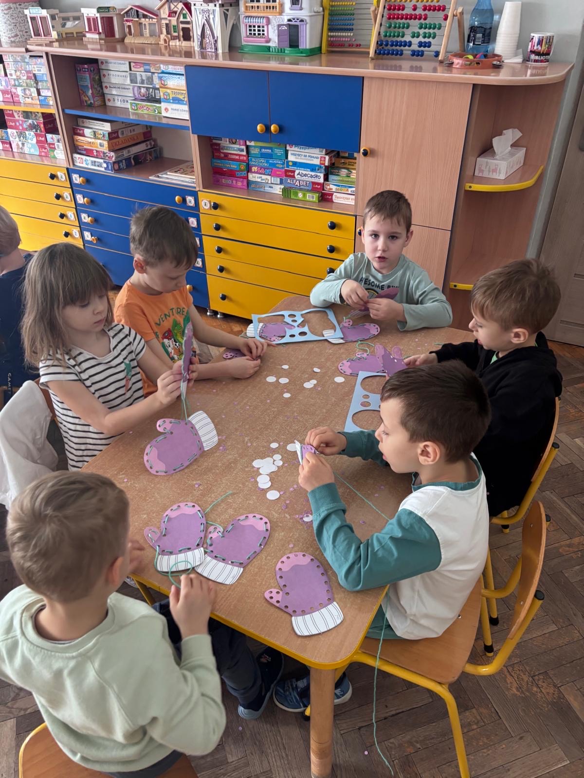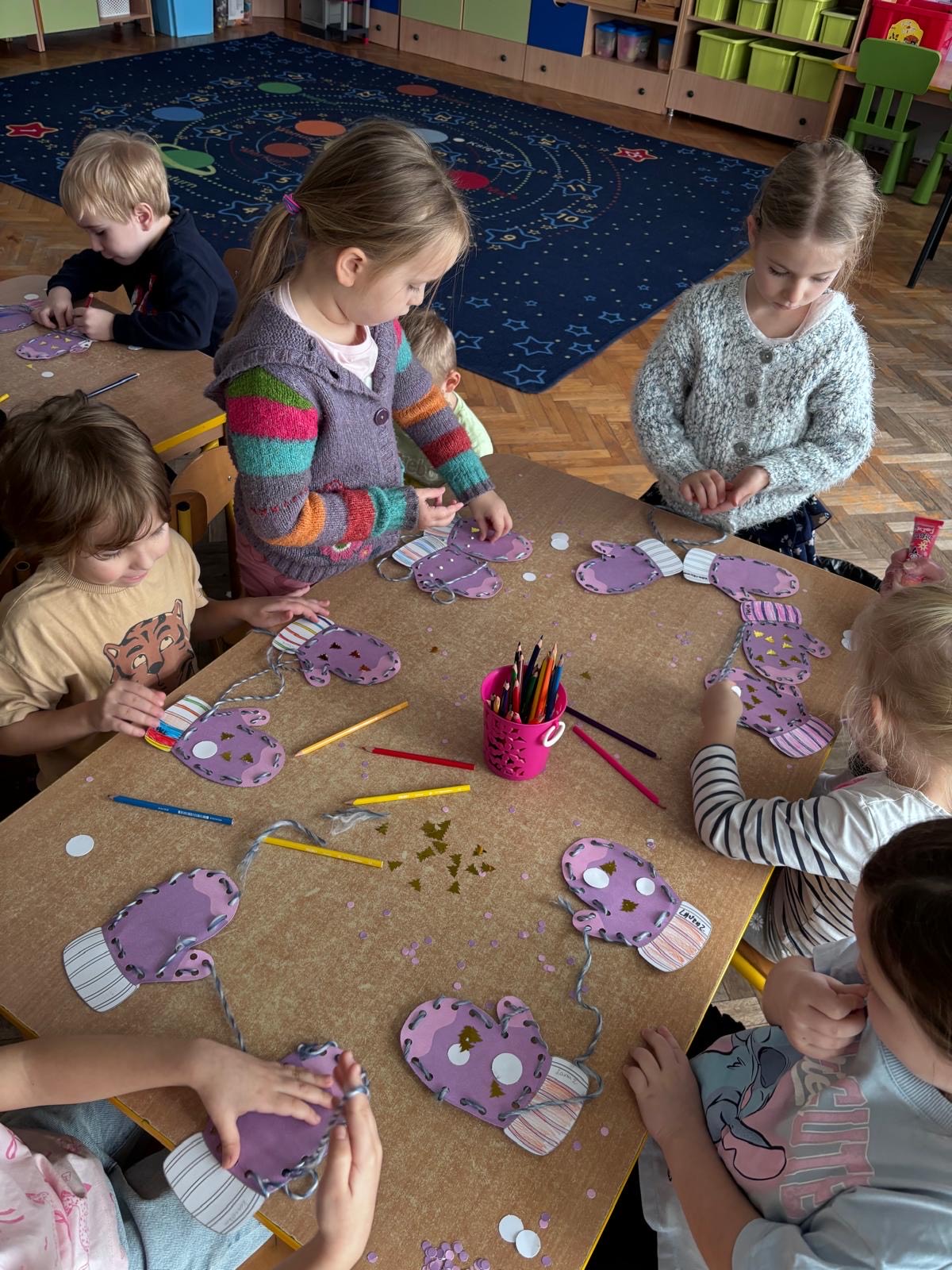 W mroźne, zimowe dni, nasi mali Myśliciel wzięli udział w twórczym zadaniu, które łączyło zabawę z rozwojem motoryki małej. Pod czujnym okiem nauczycielki, dzieci przewlekały włóczkę przez papierowe rękawiczki, tworząc unikalne wzory. Ta kreatywna praca nie tylko rozgrzała małe dłonie, ale również pobudziła wyobraźnię i precyzję ruchów. Efekt? Kolorowe, zimowe rękawiczki pełne ciepła i radości!