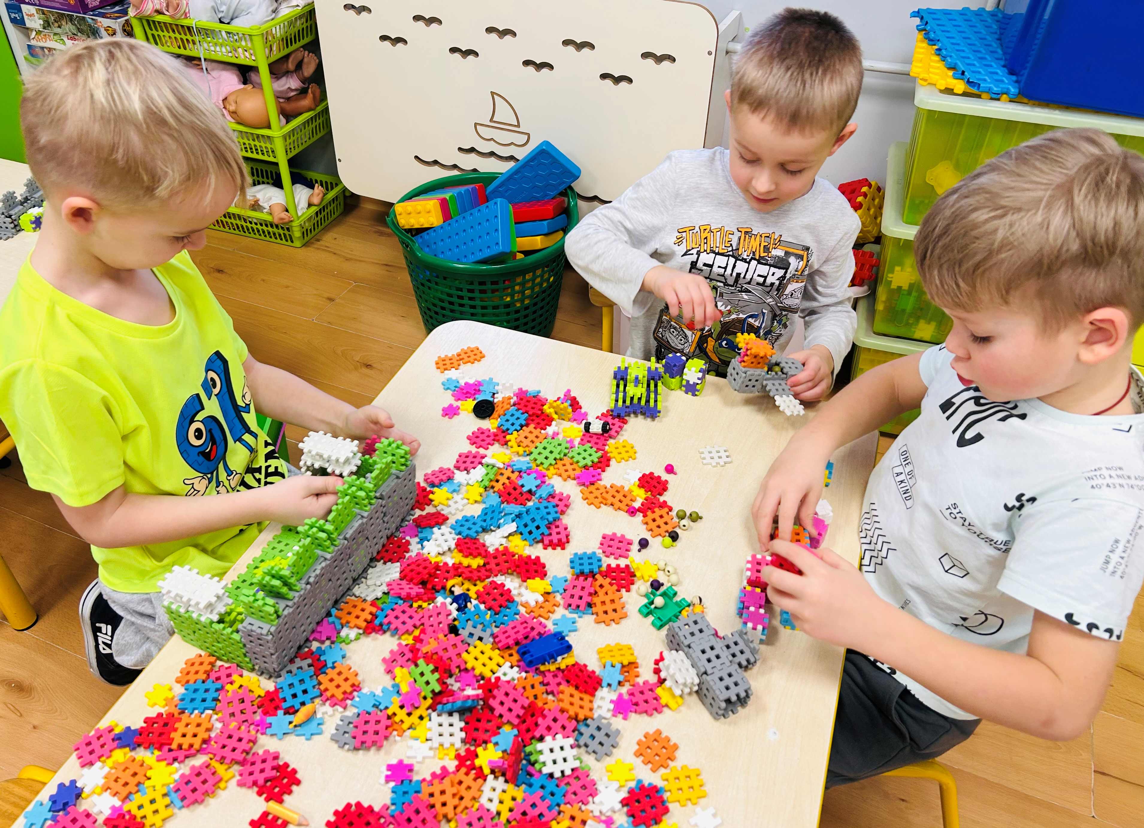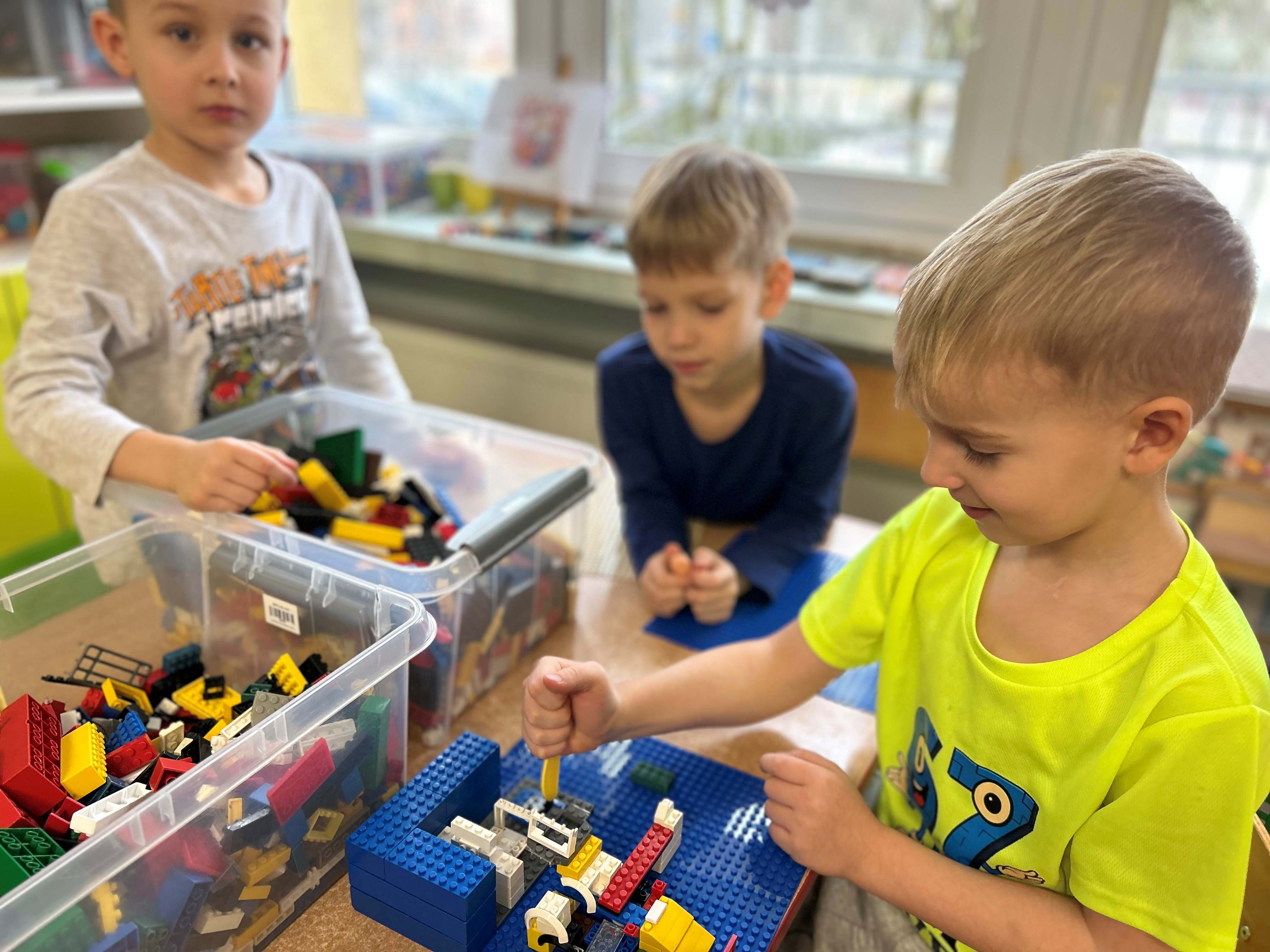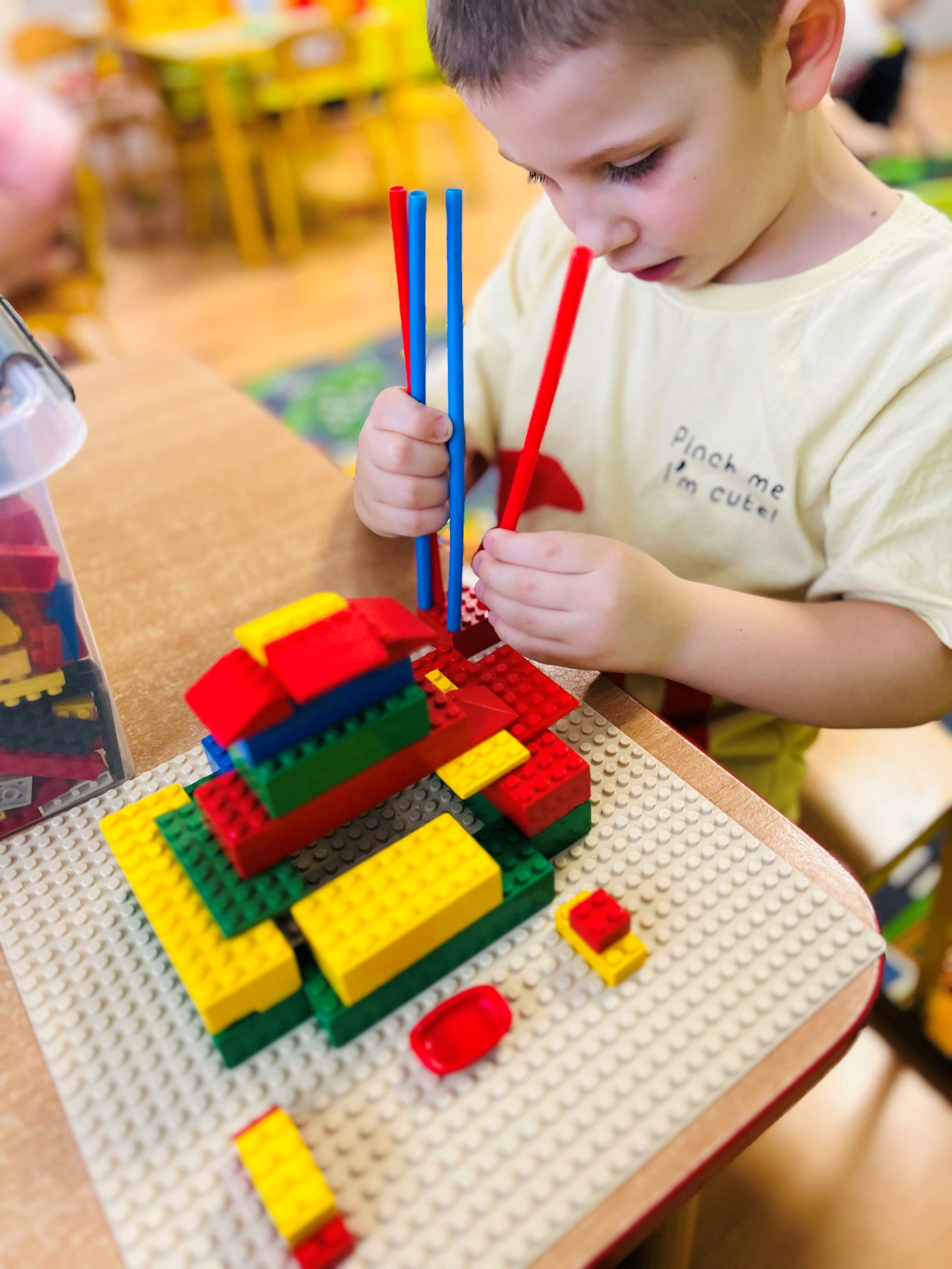 bezpośrednie działanie. Dzieci z dużym zaangażowaniem obserwowały ptaki i z radością uczestniczyły w akcji, ucząc się jednocześnie, jak dbać o przyrodę. Po powrocie do sali dzieci konstruowały z klocków własne karmniki i inne budowle, rozwijając kreatywność, wyobraźnię oraz umiejętności współpracy.