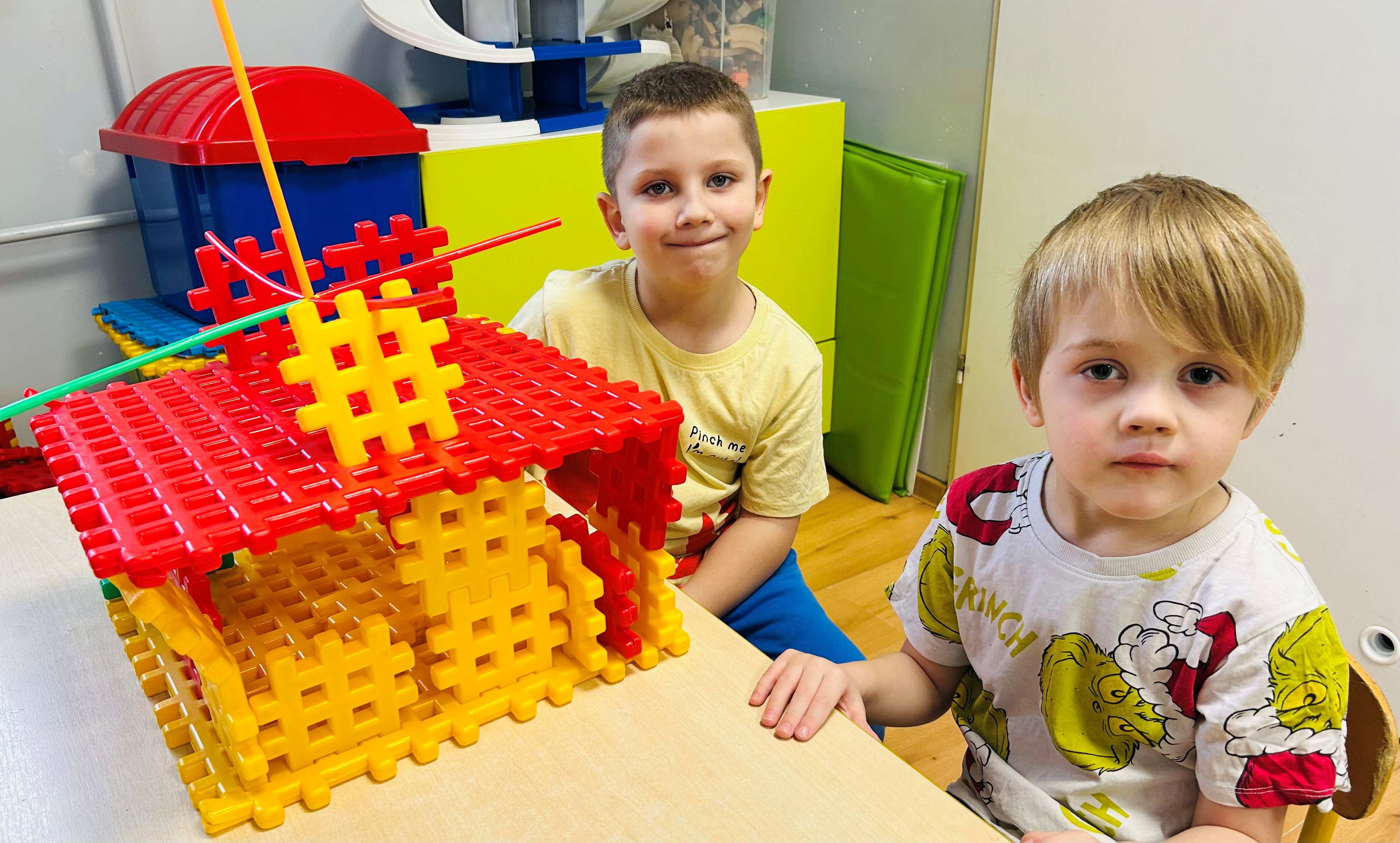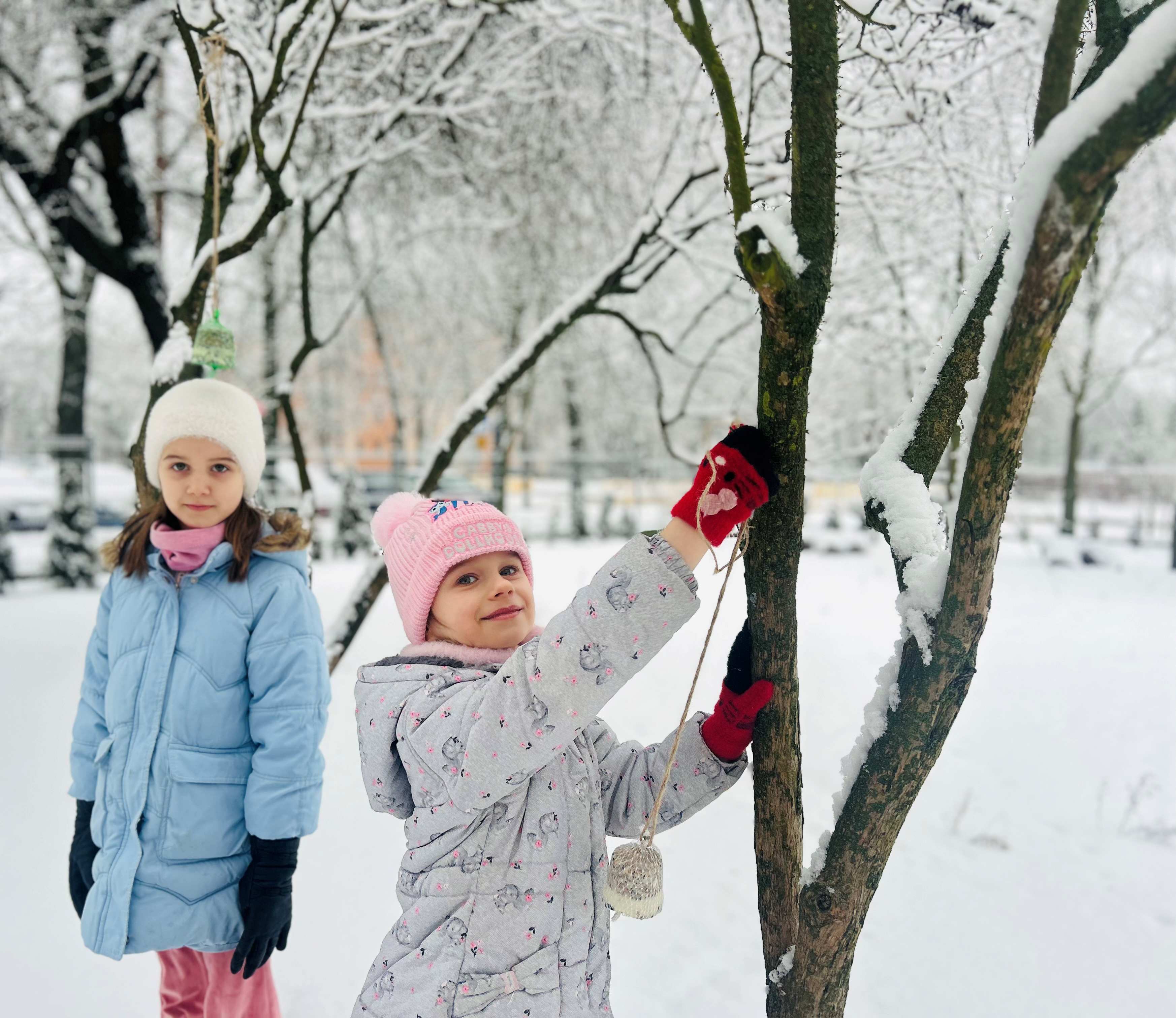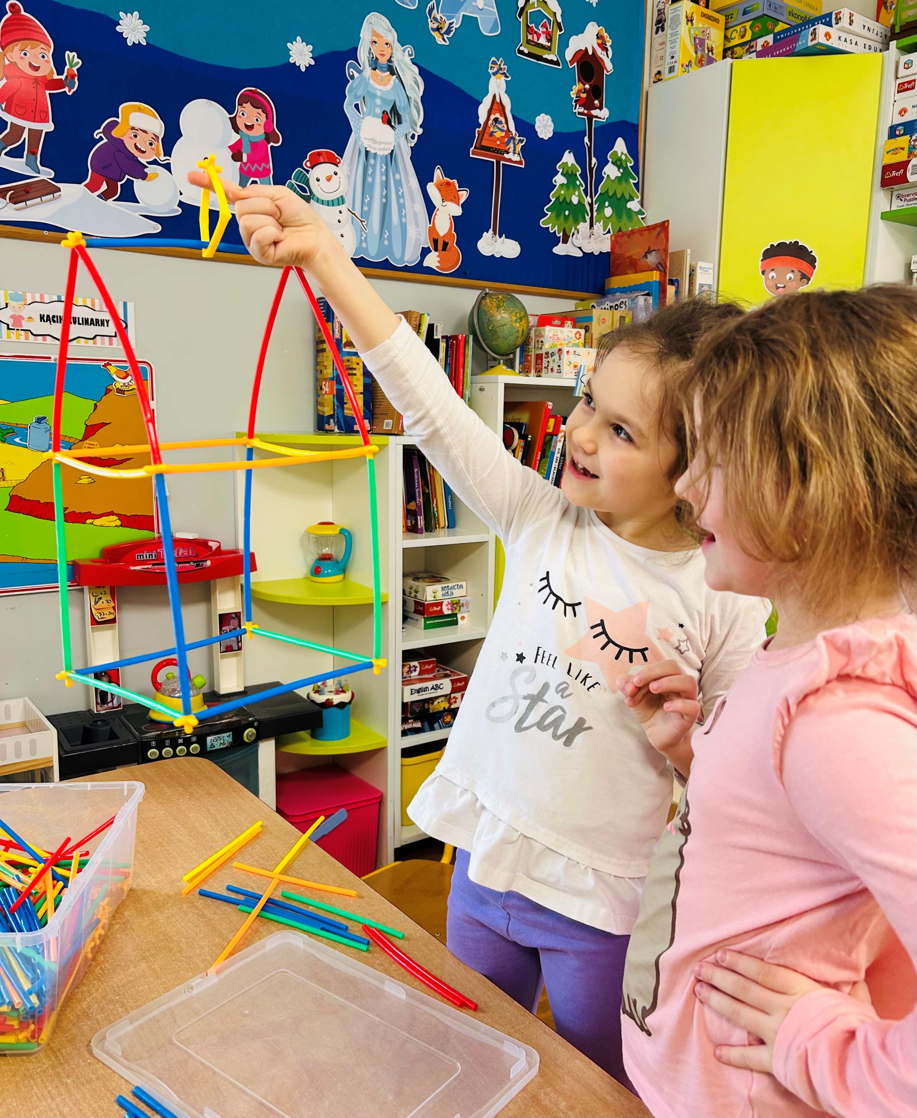 bezpośrednie działanie. Dzieci z dużym zaangażowaniem obserwowały ptaki i z radością uczestniczyły w akcji, ucząc się jednocześnie, jak dbać o przyrodę. Po powrocie do sali dzieci konstruowały z klocków własne karmniki i inne budowle, rozwijając kreatywność, wyobraźnię oraz umiejętności współpracy.
